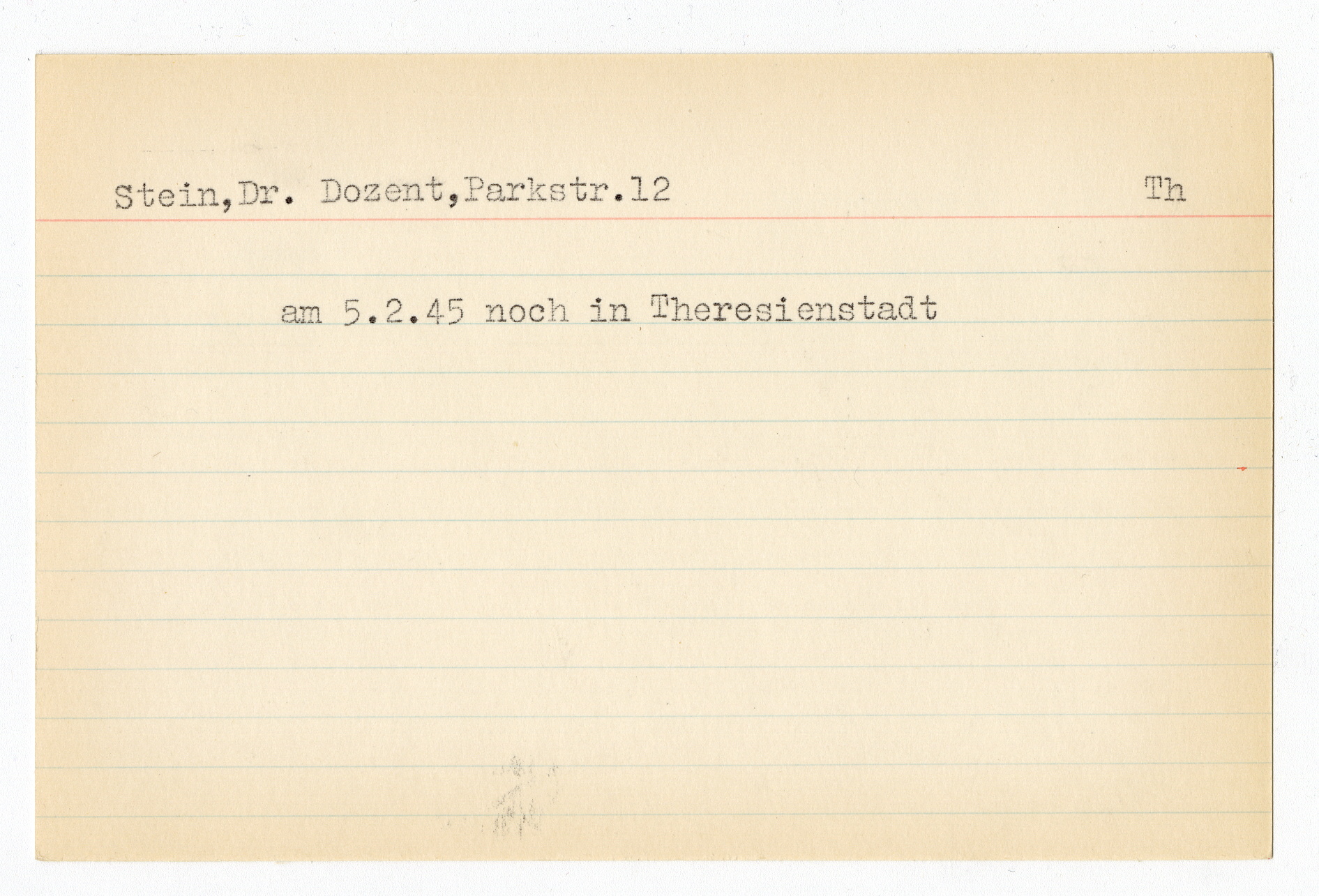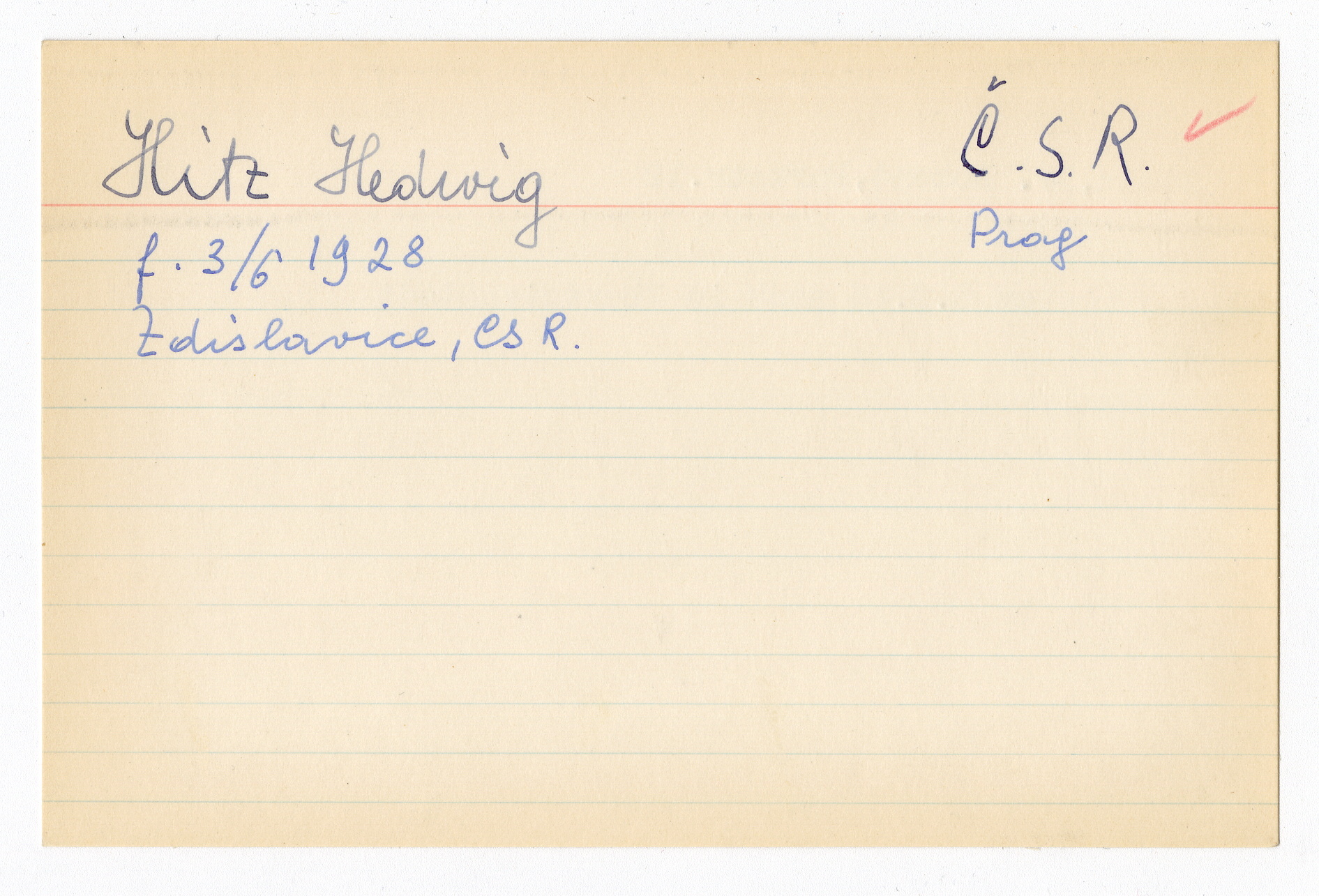 Ett skrivkort med patientuppgifter gällande Hedwig Hitz. På baksidan uppgifter om matpaket till Stein i Theresienstadt.
