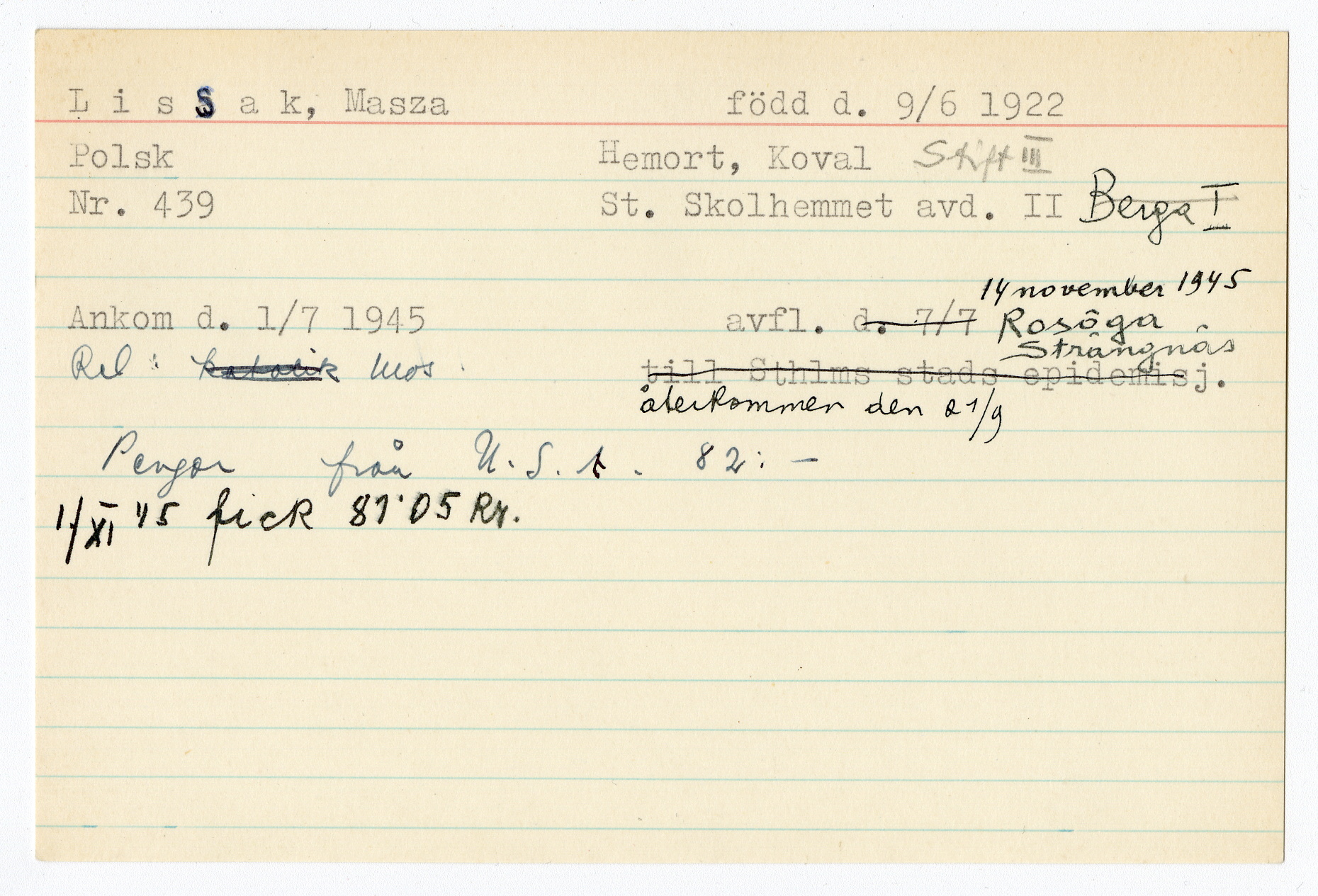 Ett skrivkort med patientuppgifter gällande Masza Lissak.