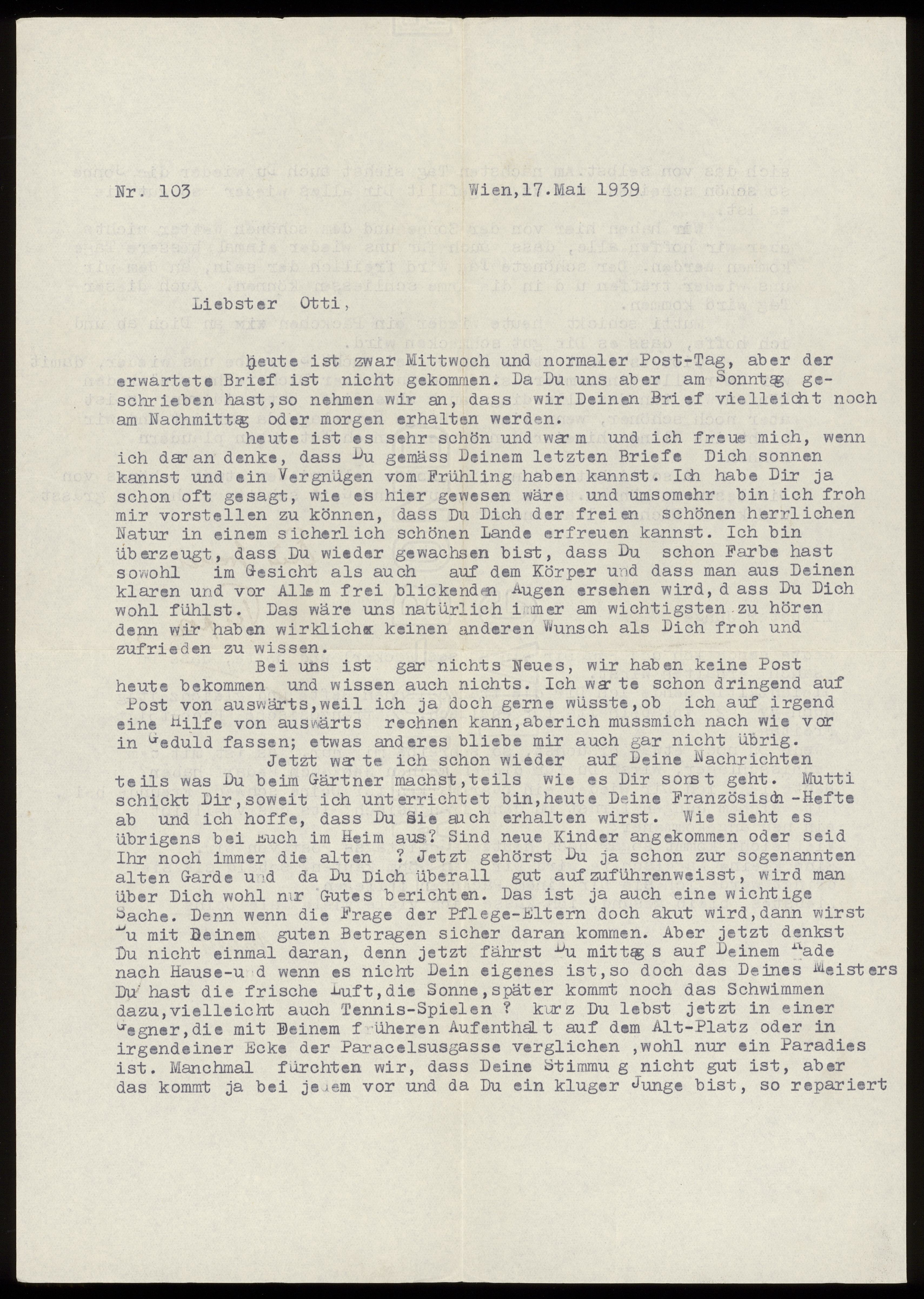 Maskinskrivet brev till Otto Ullman från föräldrarna Josef och Elise Ullmann daterat 17 maj 1939 Wien.