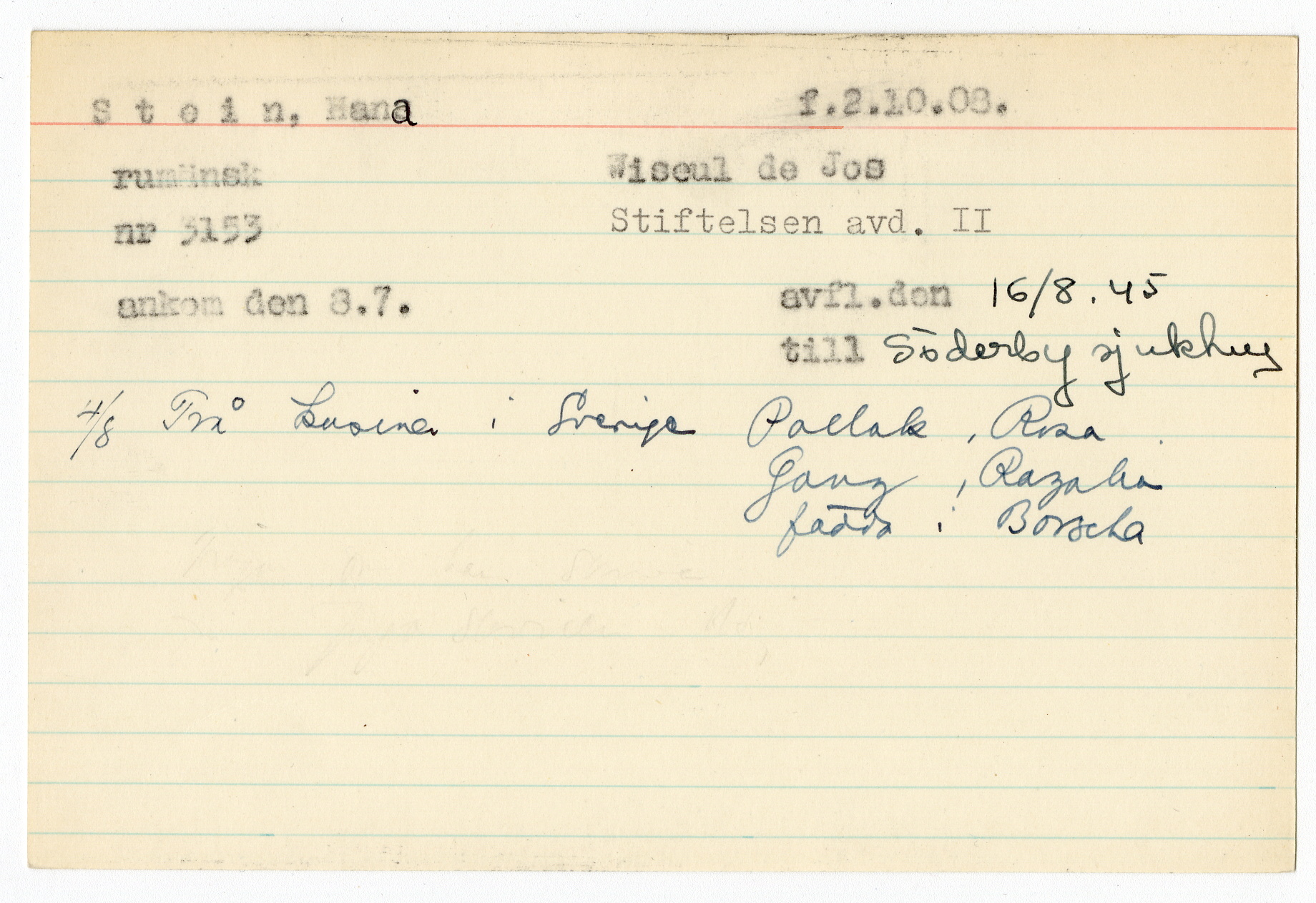 Ett skrivkort med patientuppgifter gällande Hana Stein.