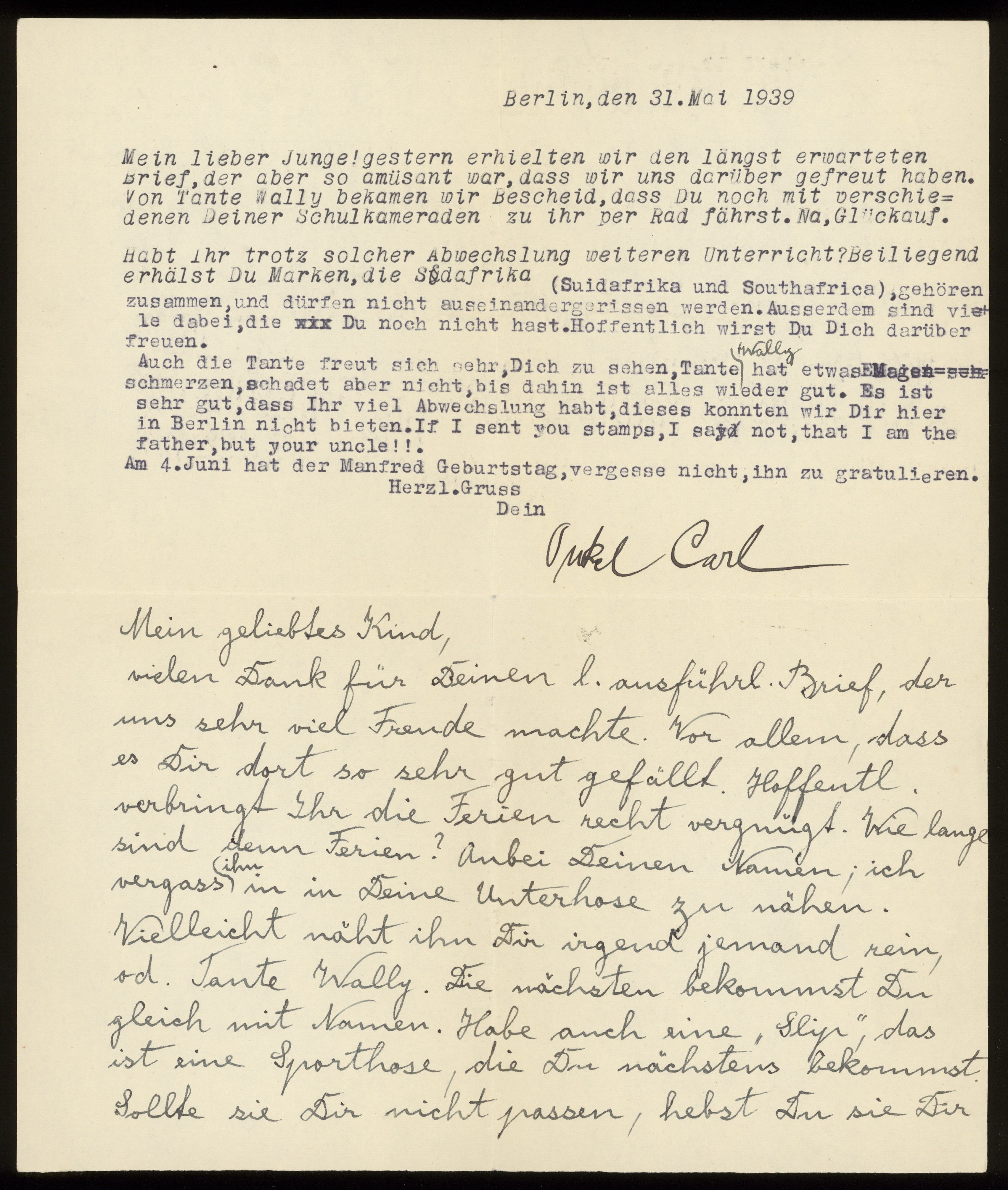 Brev från föräldrarna Anna och Siegfried Posner och Onkel Carl till Ludwig Posner daterat 31 maj 1939.