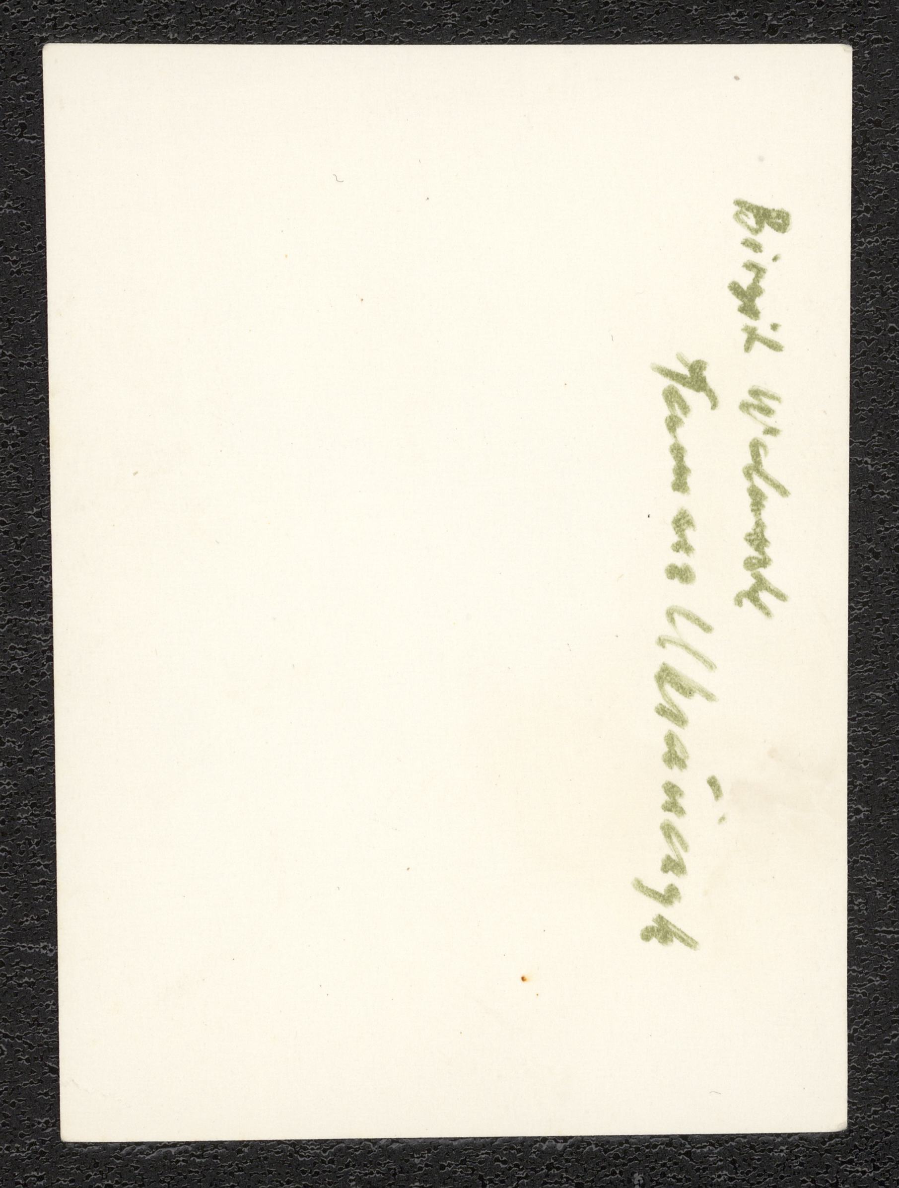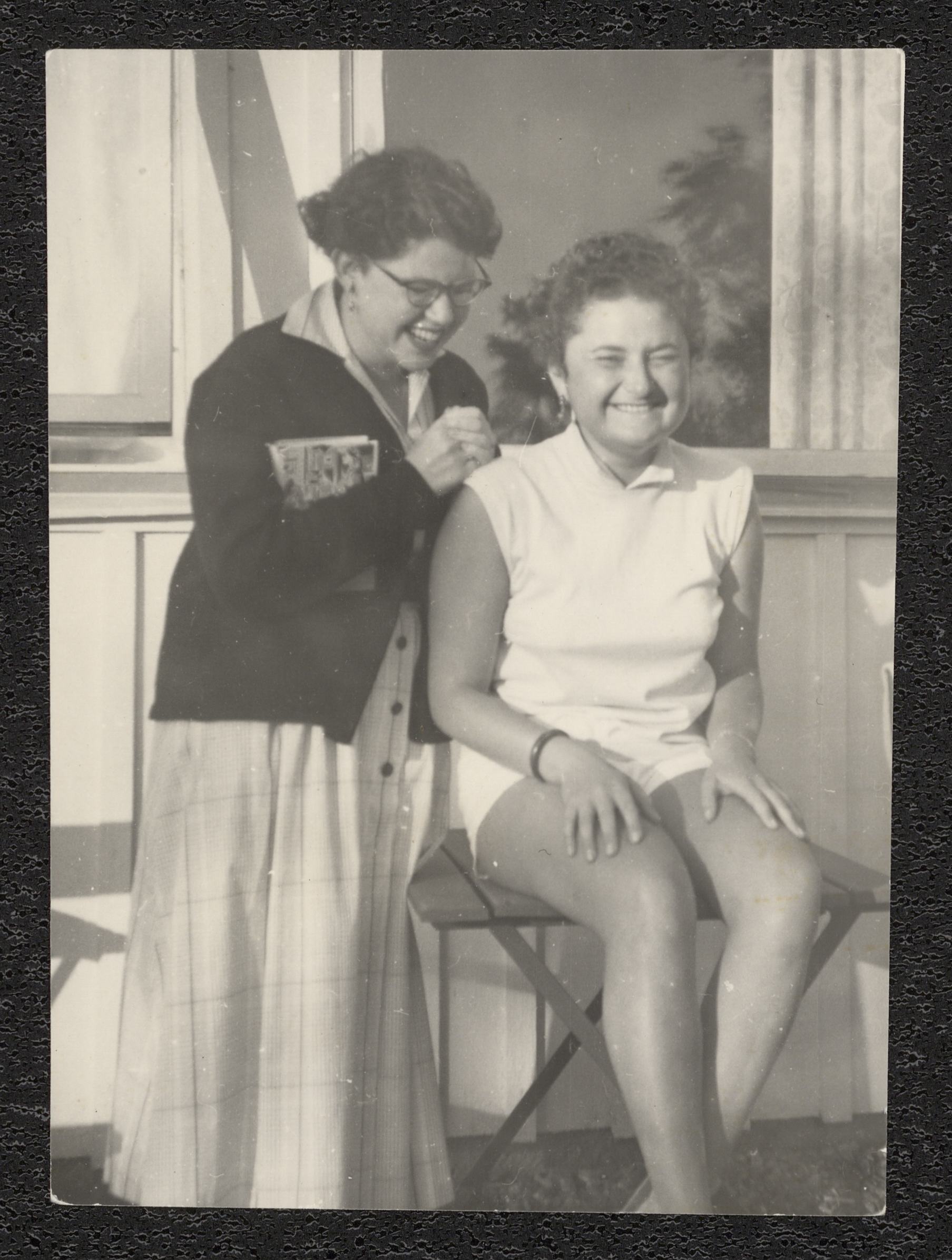 Två skrattande kvinnor. Den ena kvinnan sitter på en stol, medan den ena står bredvid henne. På baksidan finns deras namn skrivna: "Birgit Wi??" och möjligen Tamara Ukrainchyk.