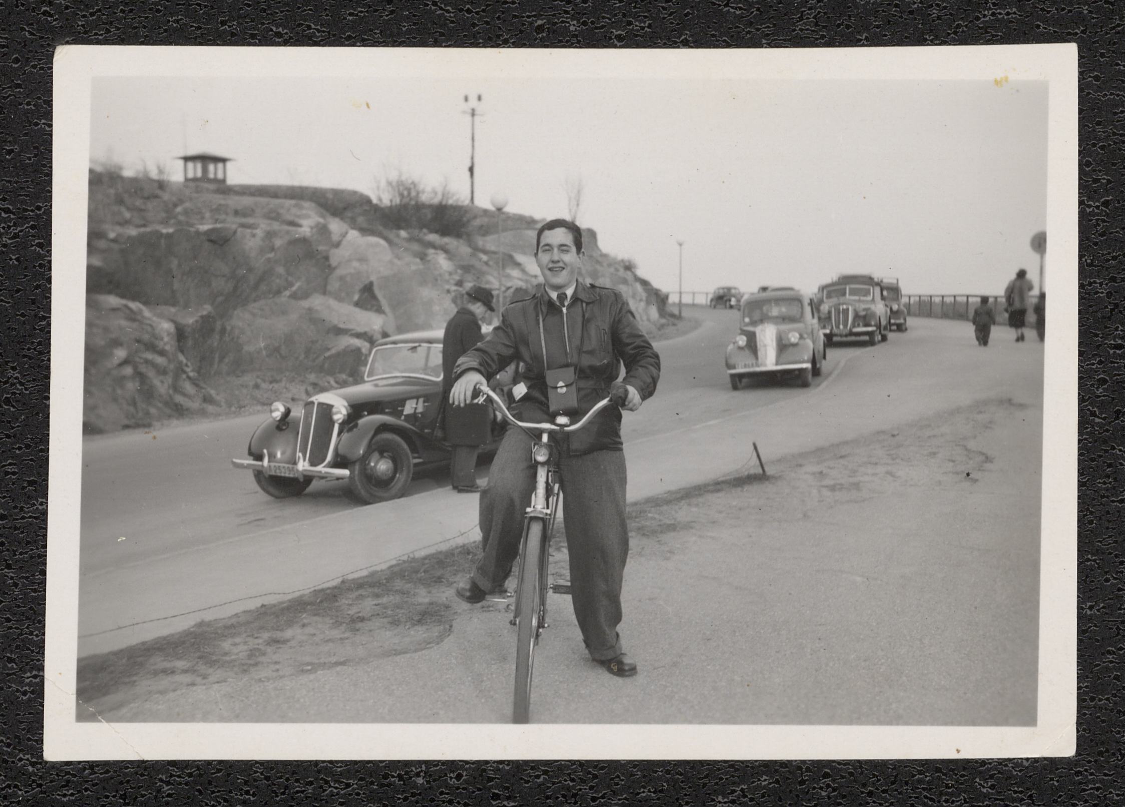 Georg Witt som ung, sittandes på en cykel med en kamera i band om halsen. I bakgrunden syns bilar på en bilväg.
