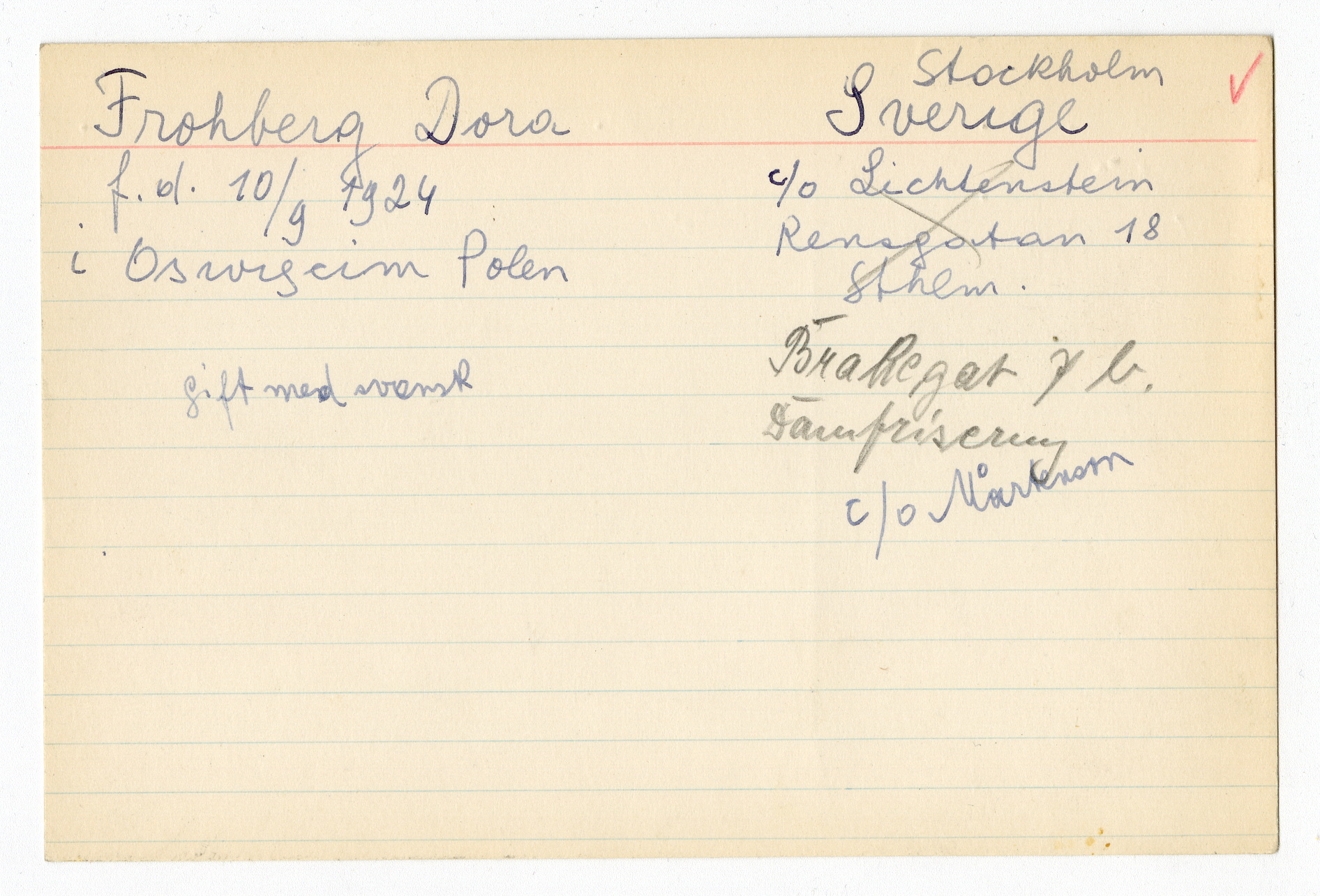 Ett skrivkort med patientuppgifter gällande Dora Frohberg. På baksidan uppgifter om matpaket till Walter Sprinz i Theresienstadt.