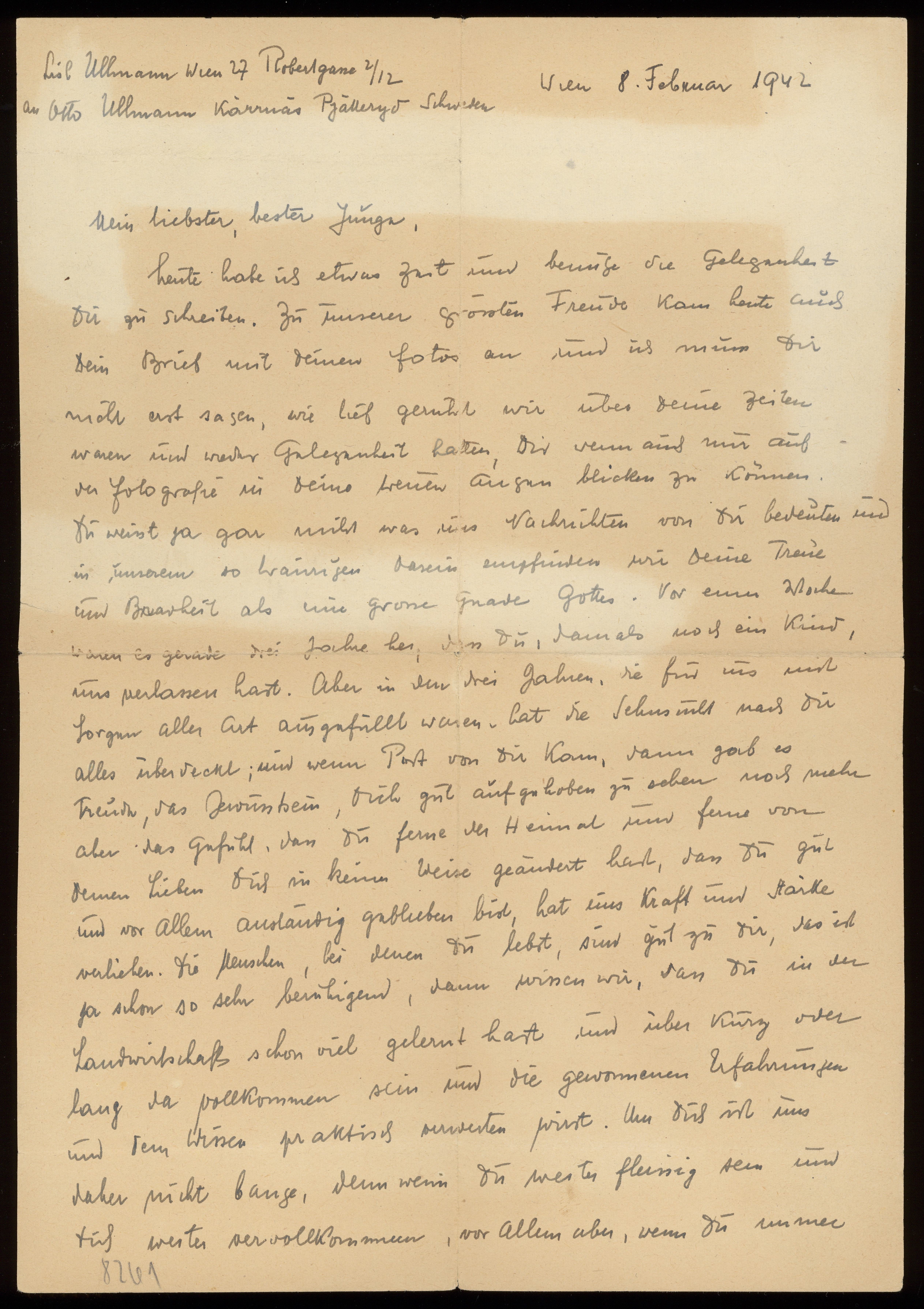 Brev till Otto Ullman från föräldrarna Josef och Elise Ullmann daterat 8 februari 1942 Wien.