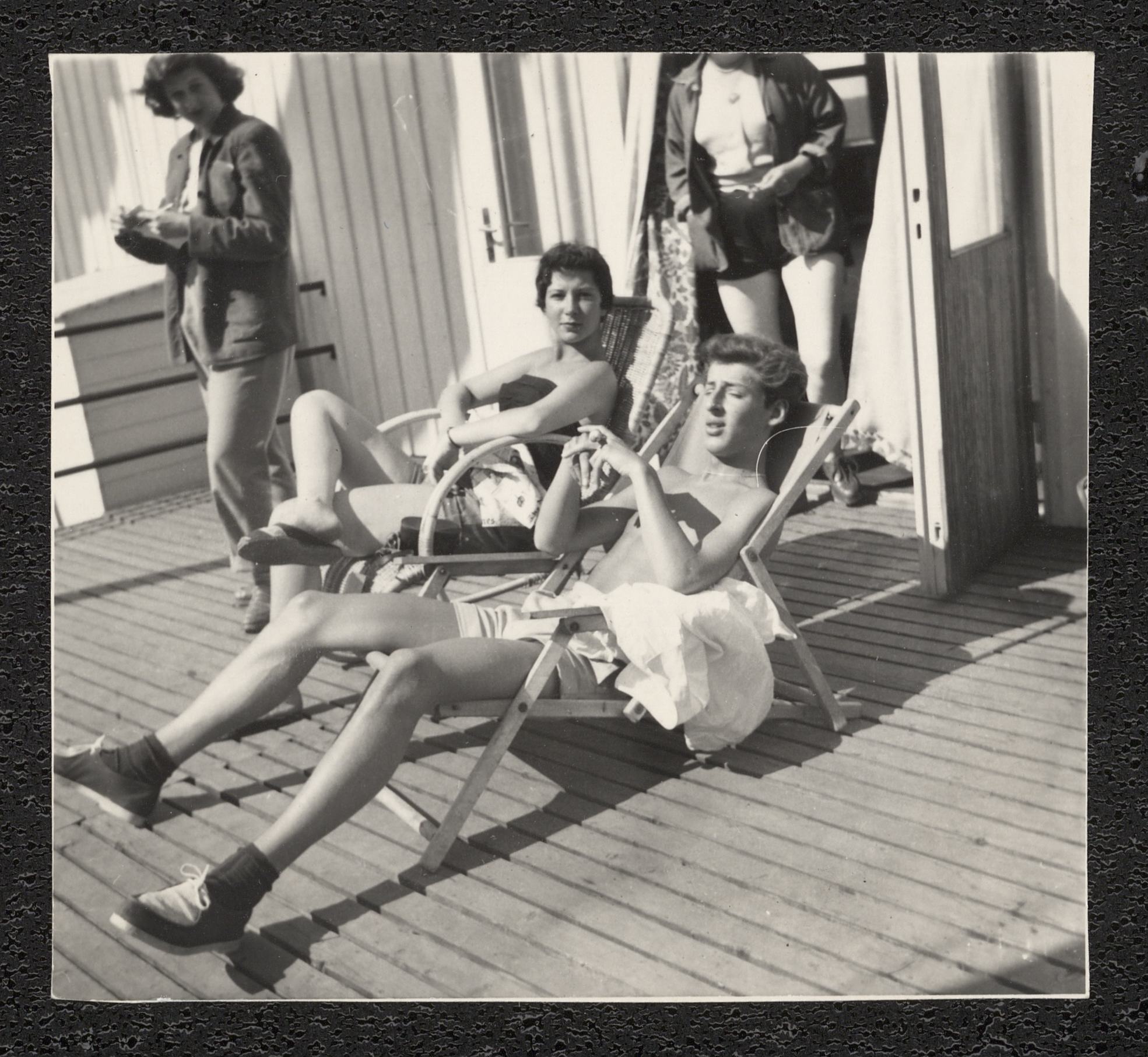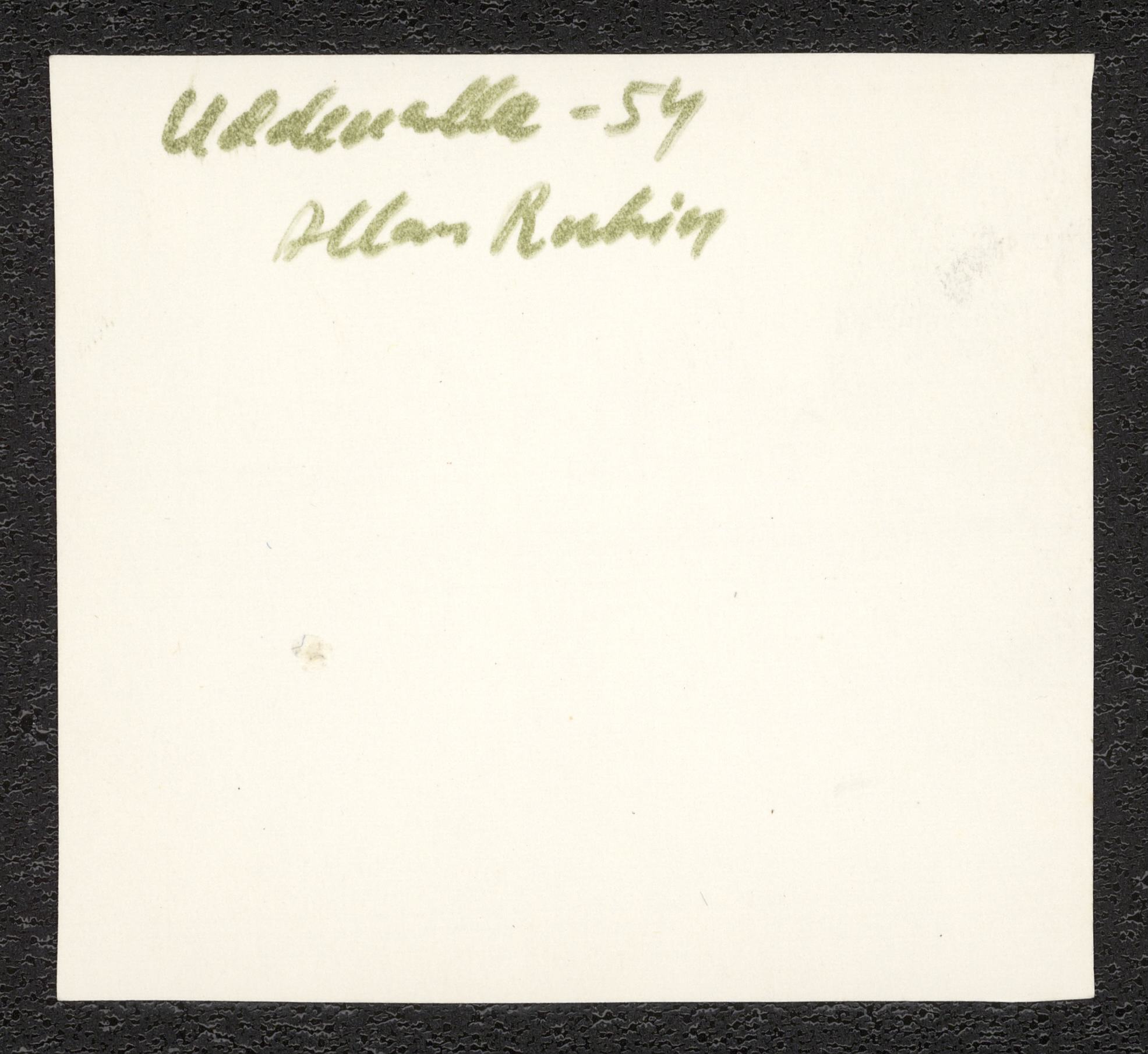 En kvinna och en man sitter i solstolar på en veranda. På baksidan finns texten "Uddevalla -54 Allan Rubin".