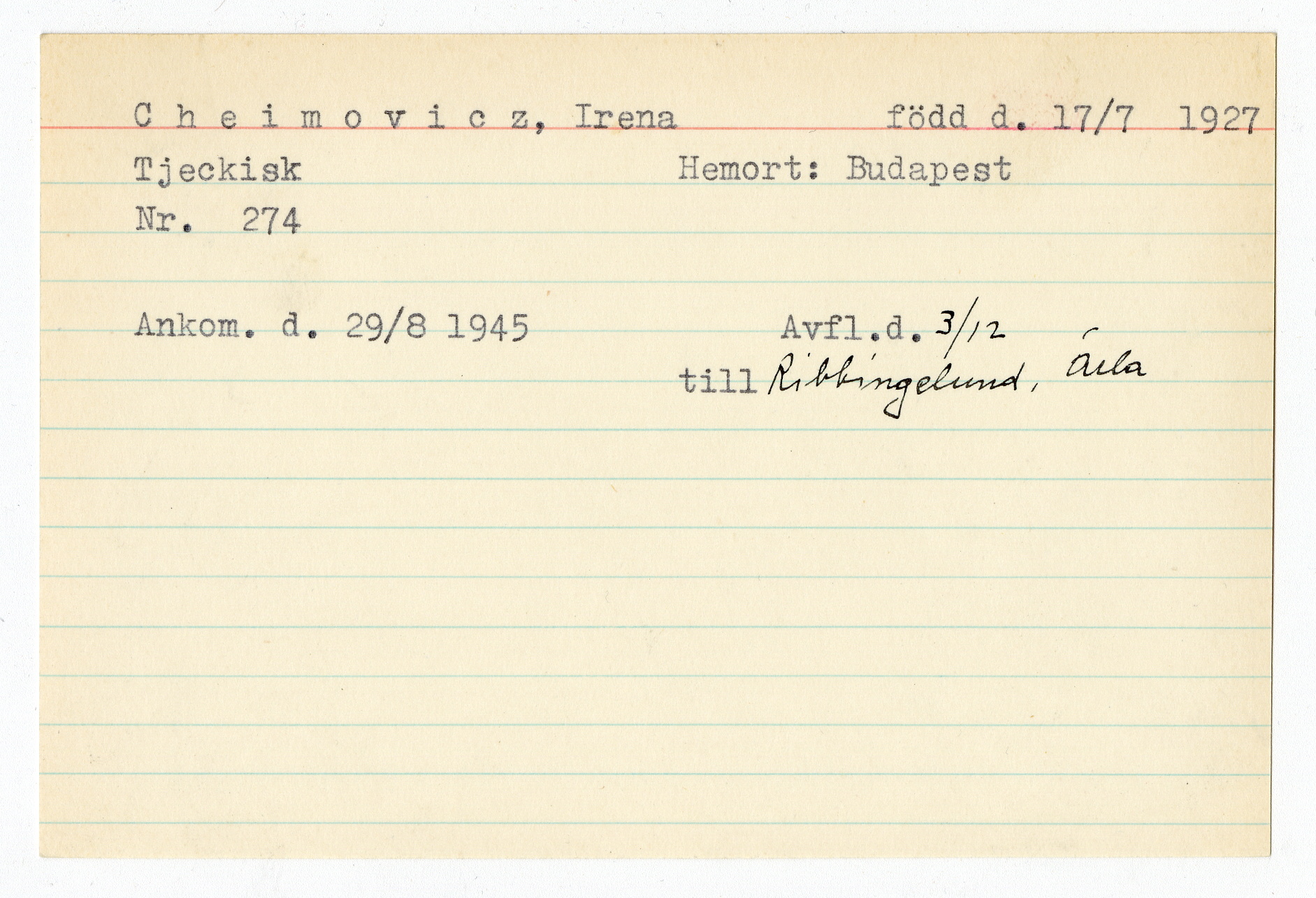 Registerkort Irena Cheimovicz