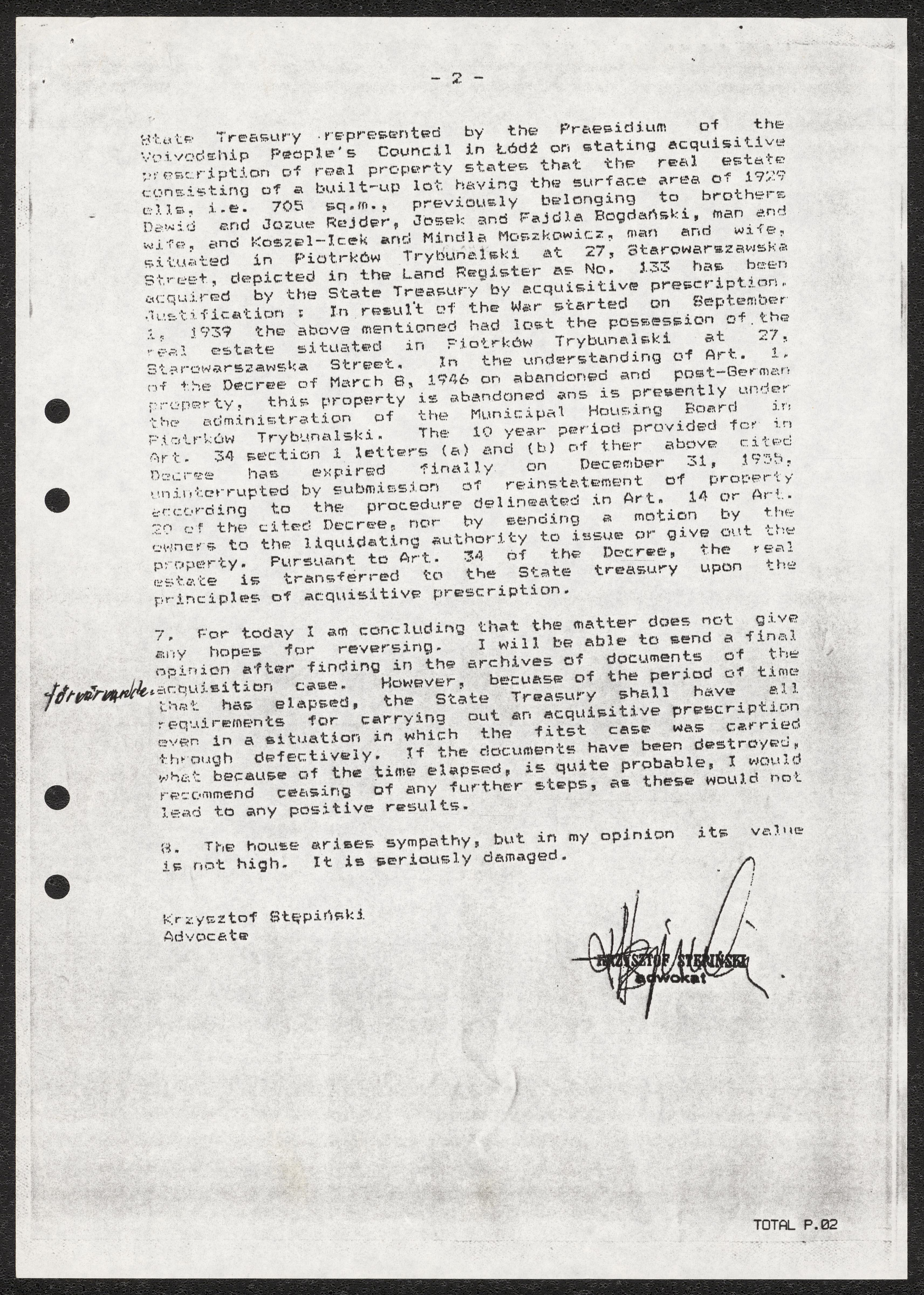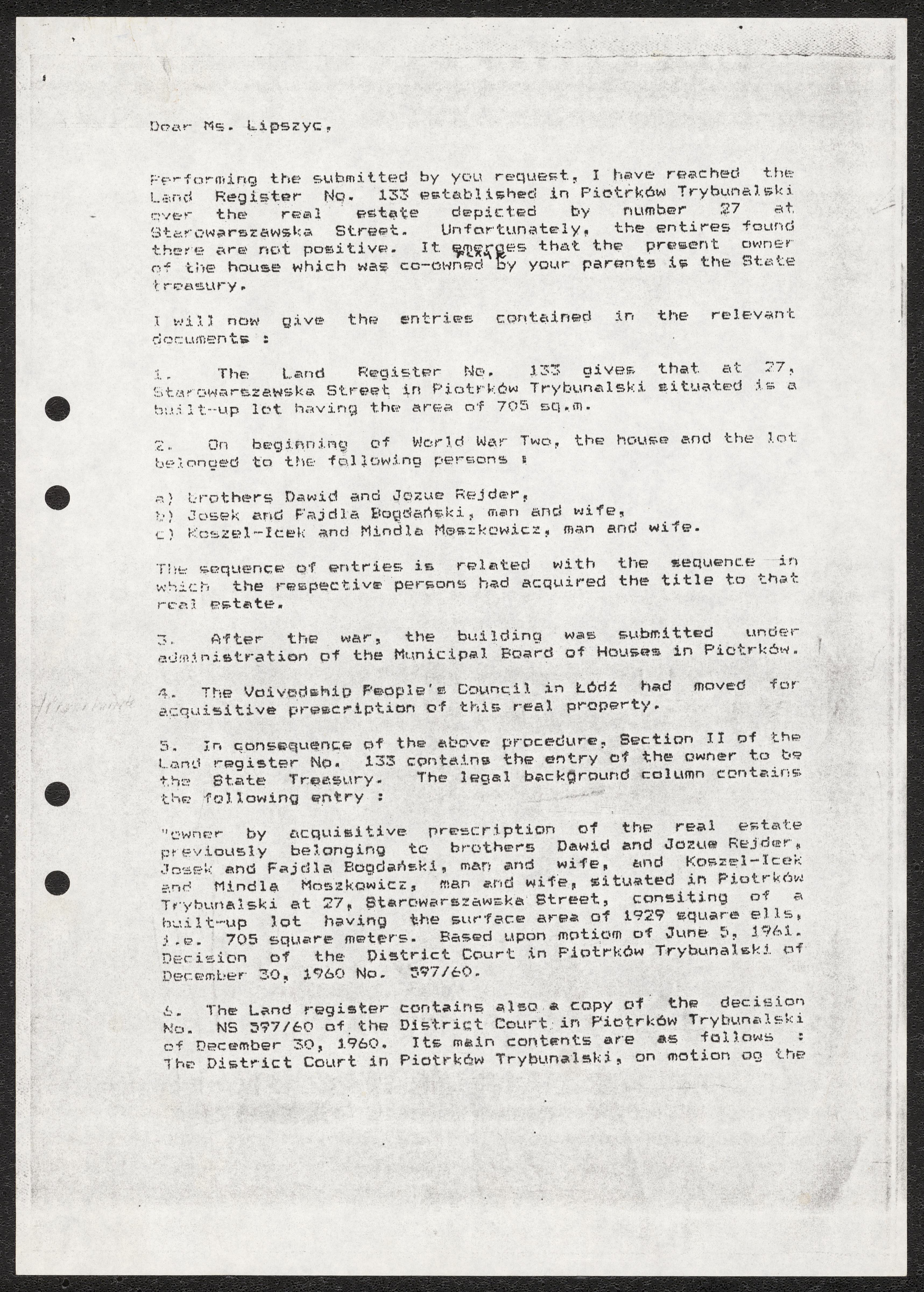 Kopia av maskinskrivet brev på engelska, gällande ägarförhållandena för den fastighet i Polen som Rozia Zyskinds föräldrar var delägare i innan Förintelsen. I brevet framkommer att familjen inte längre har rätt till fastigheten.