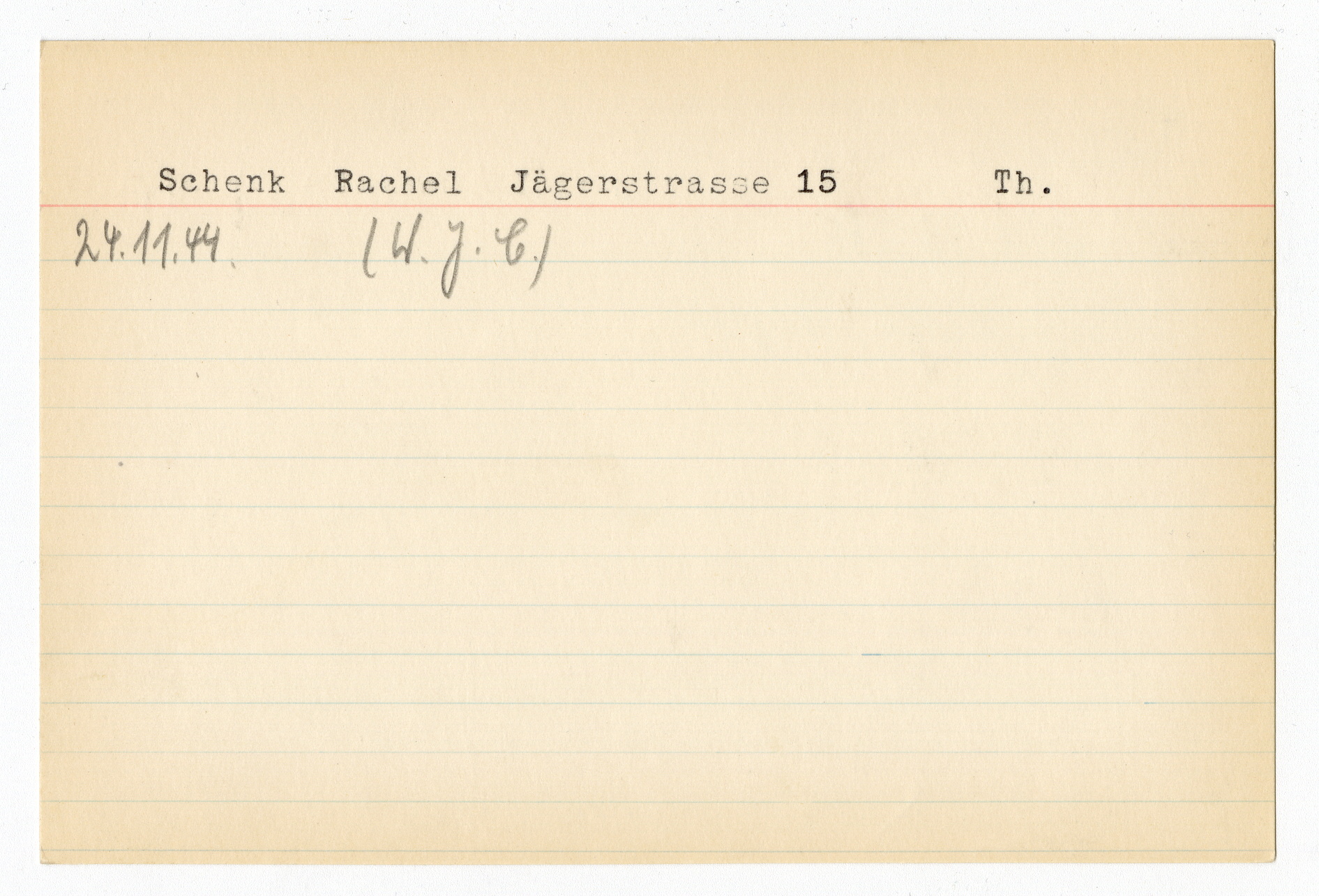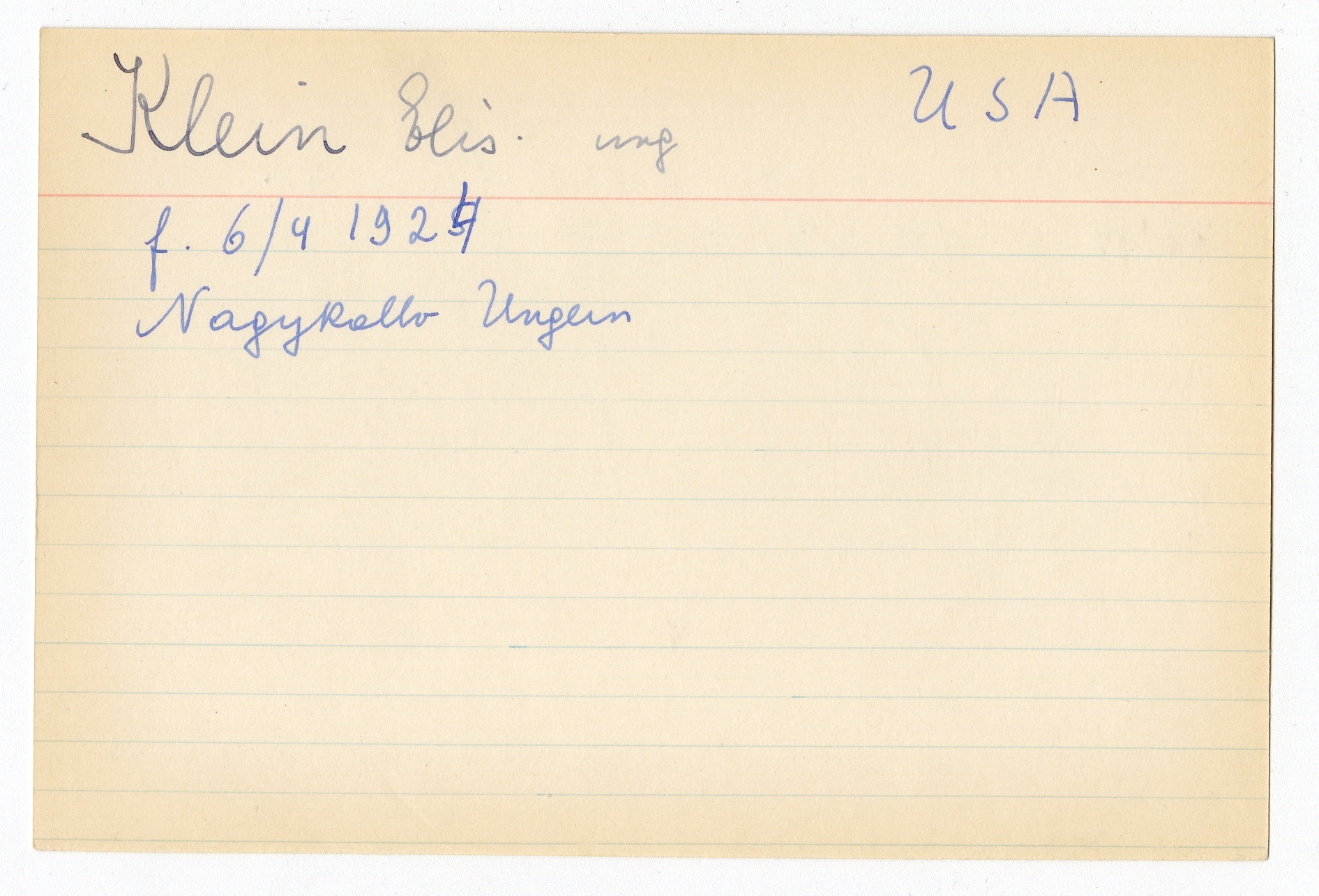 Ett skrivkort med patientuppgifter gällande Elis Klein. På baksidan uppgifter om matpaket till Rachel Schenk i Theresienstadt.