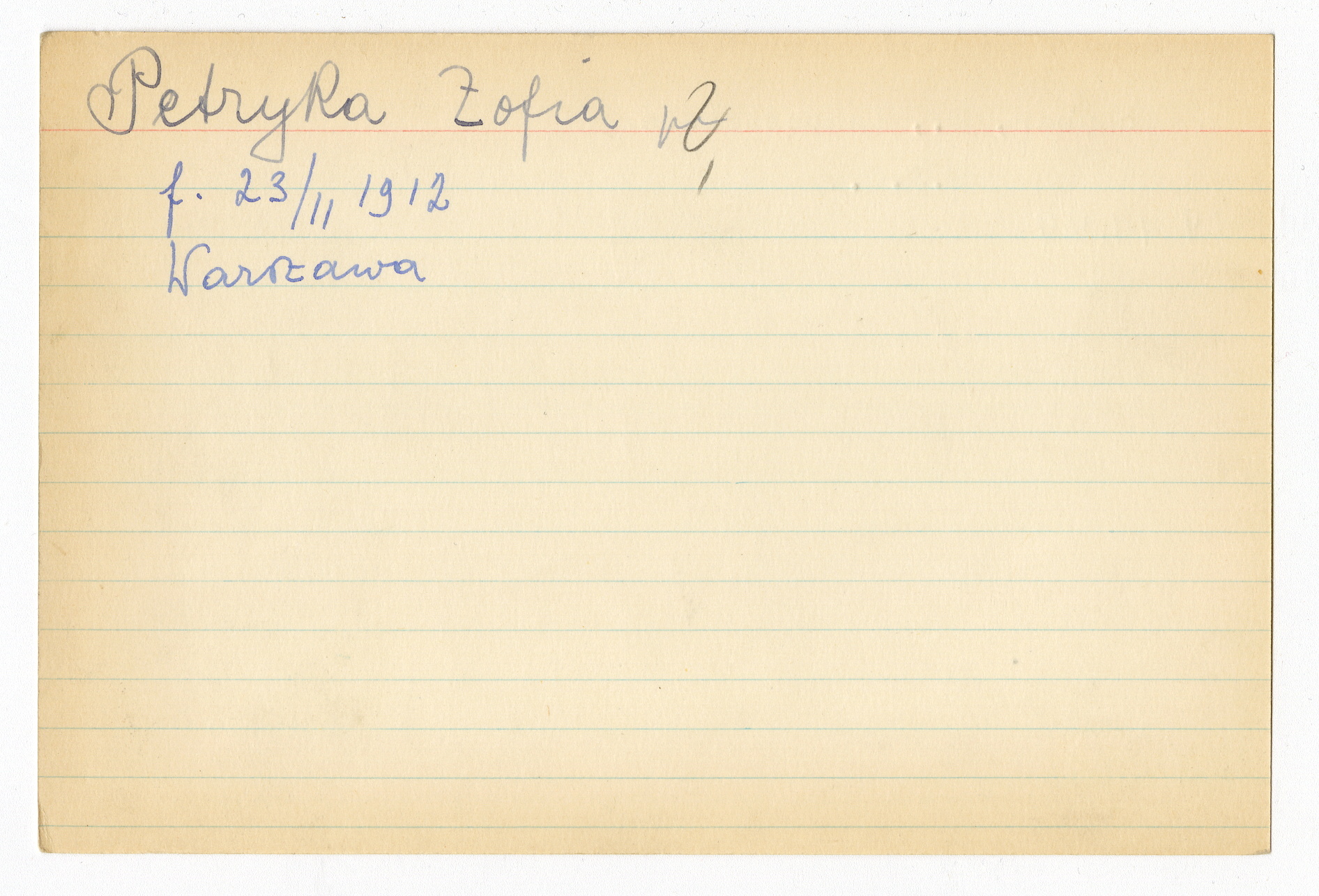 Ett skrivkort med patientuppgifter gällande Zofia Petryka. På baksidan uppgifter om matpaket till Noelle Schuber i Theresienstadt.