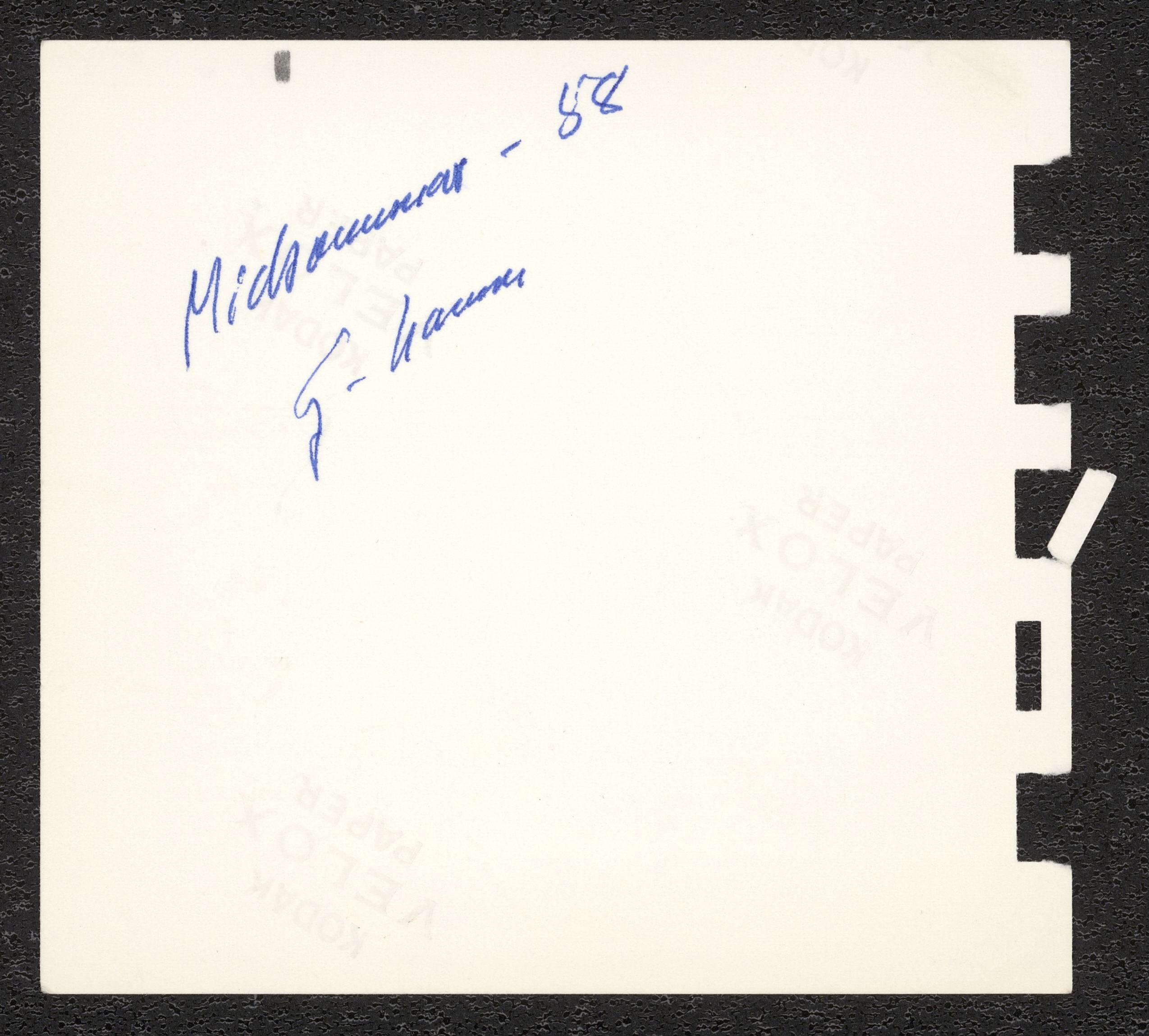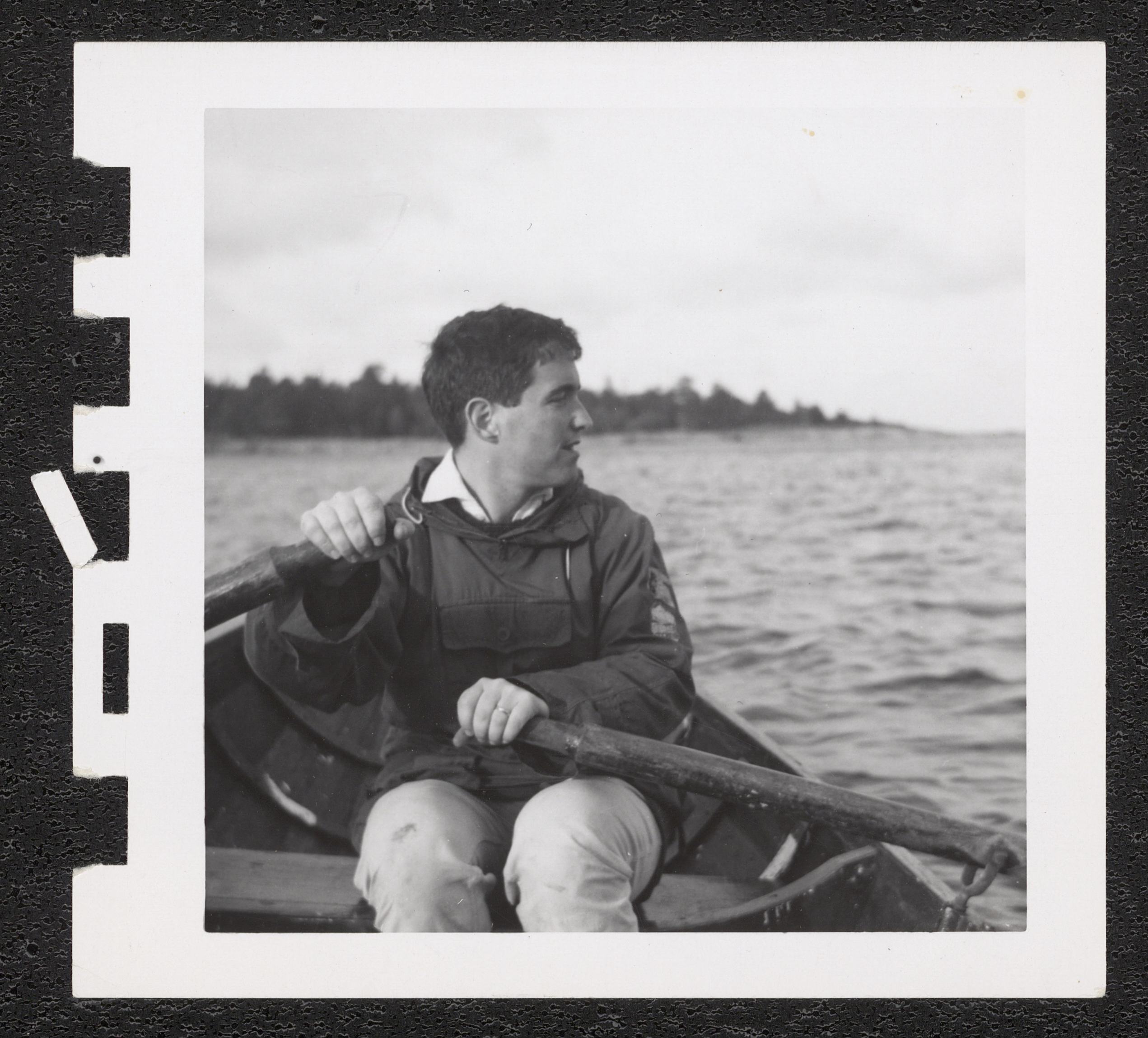 Georg Witt ror en träbåt, klädd i anorak. På baksidan finns texten "Midsommar -88, G-hamn".
