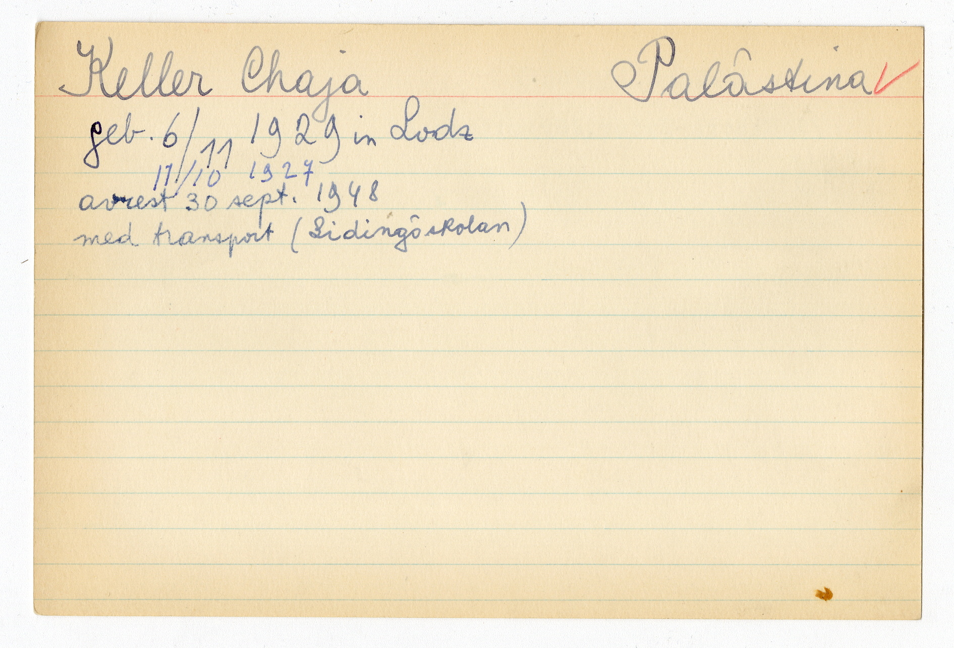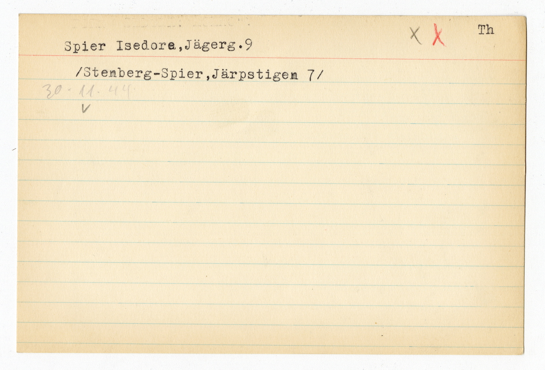 Ett skrivkort med patientuppgifter gällande Chaja Keller. På baksidan uppgifter om matpaket till Isadore Spier i Theresienstadt.