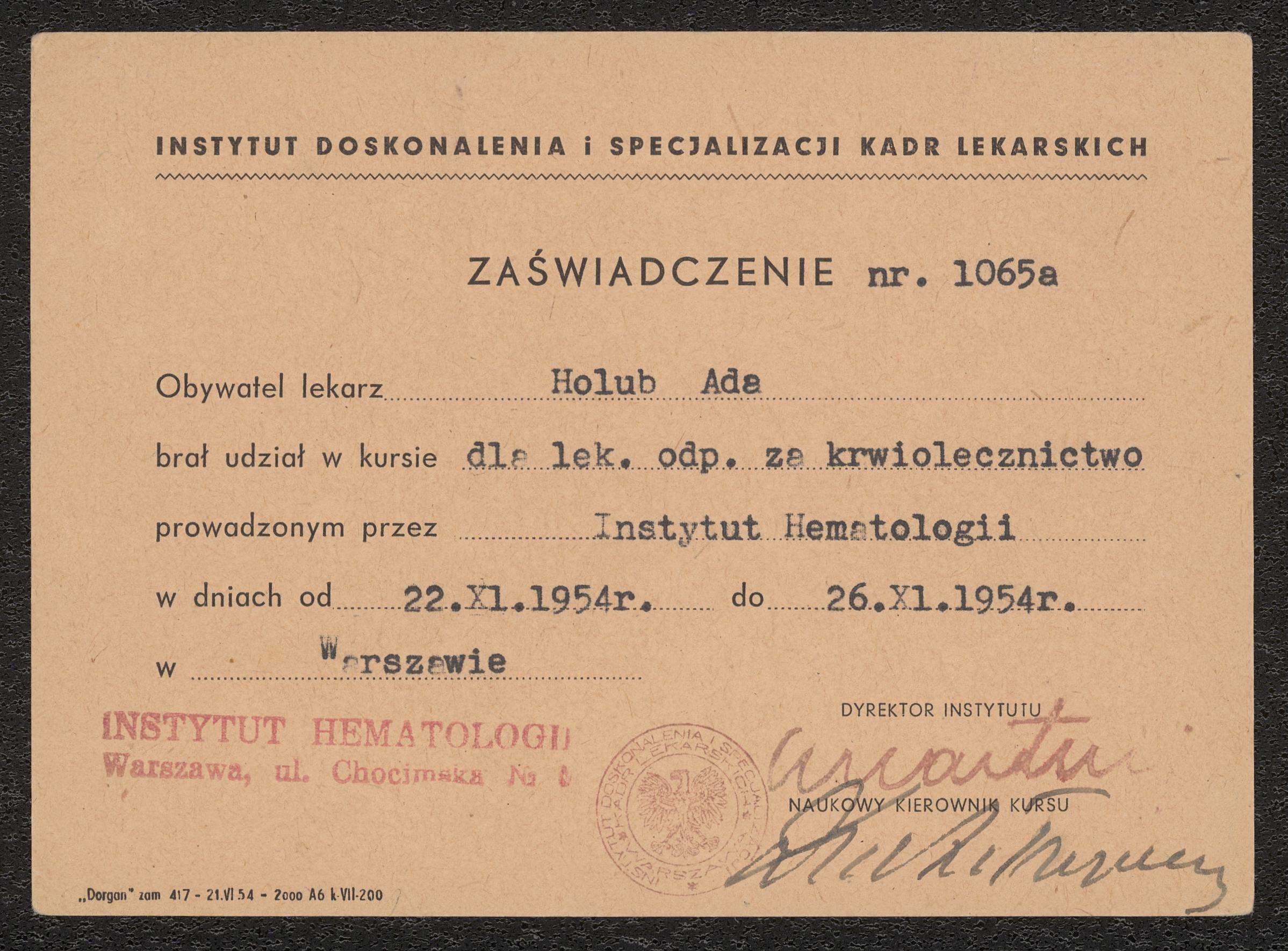 Intyg för genomförd kurs i blodbehandling. Utfärdat för Ada Holub 1954.
