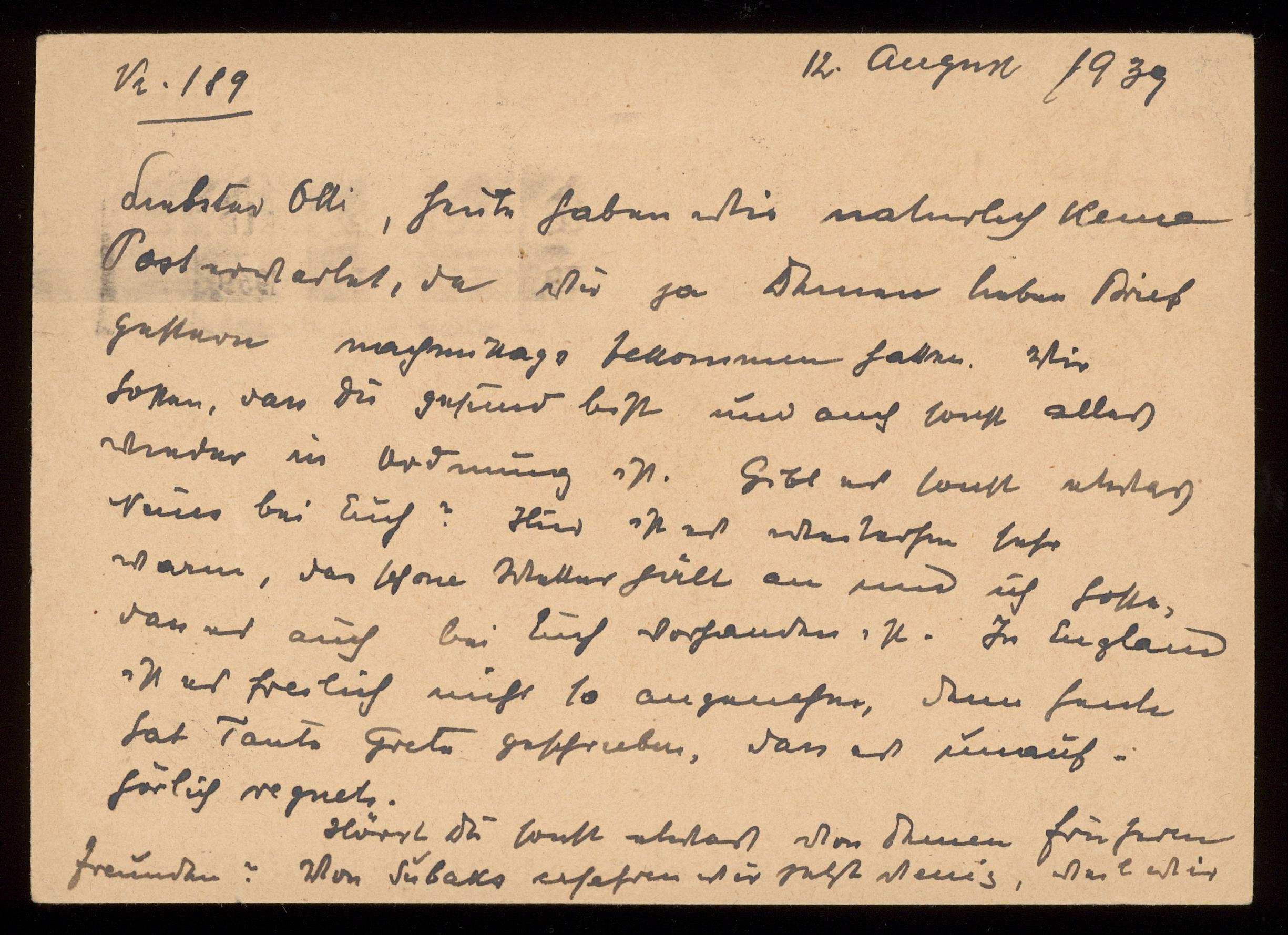 Brev till Otto Ullman från föräldrarna Josef och Elise Ullmann daterat 12 augusti 1939 Wien.