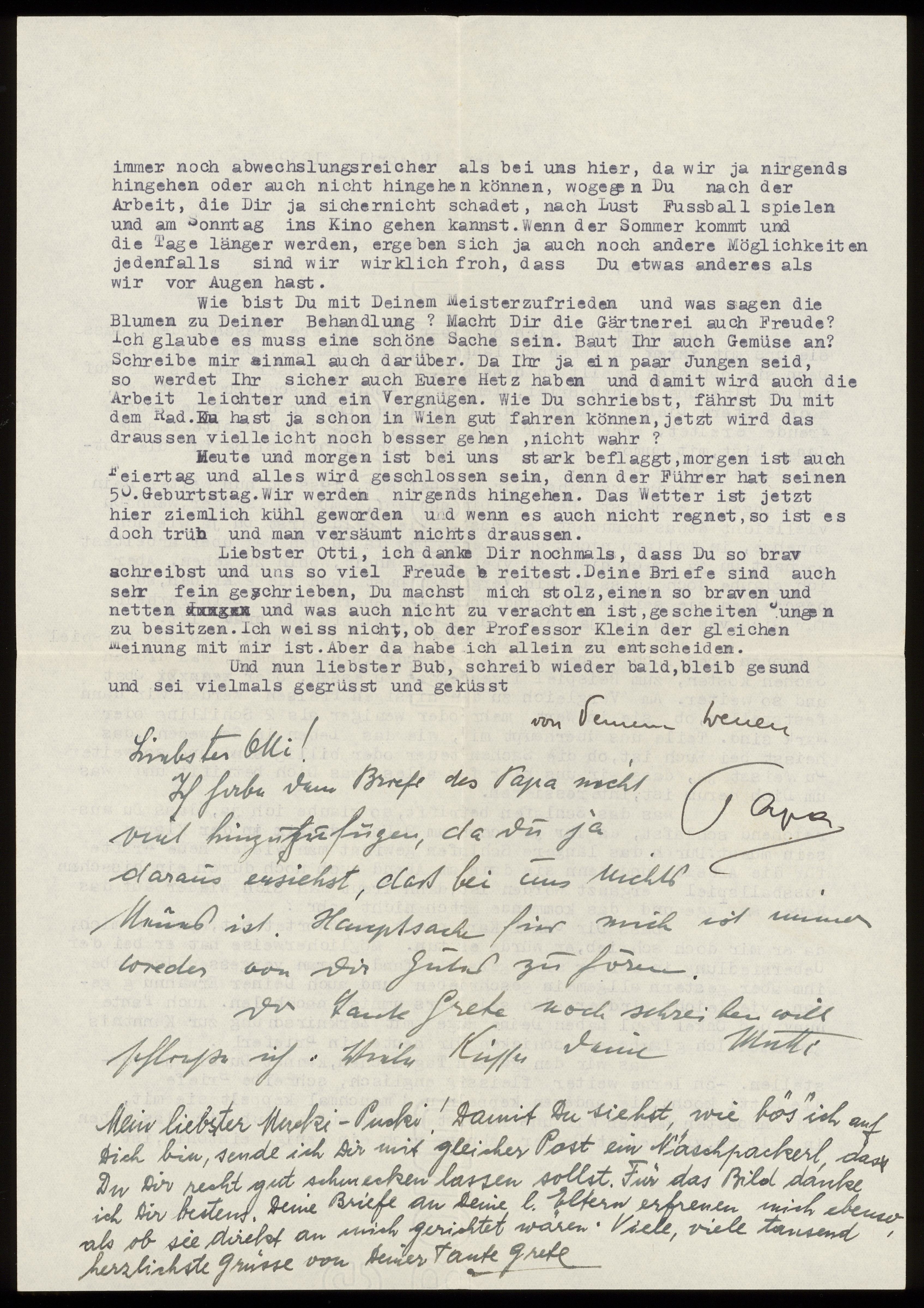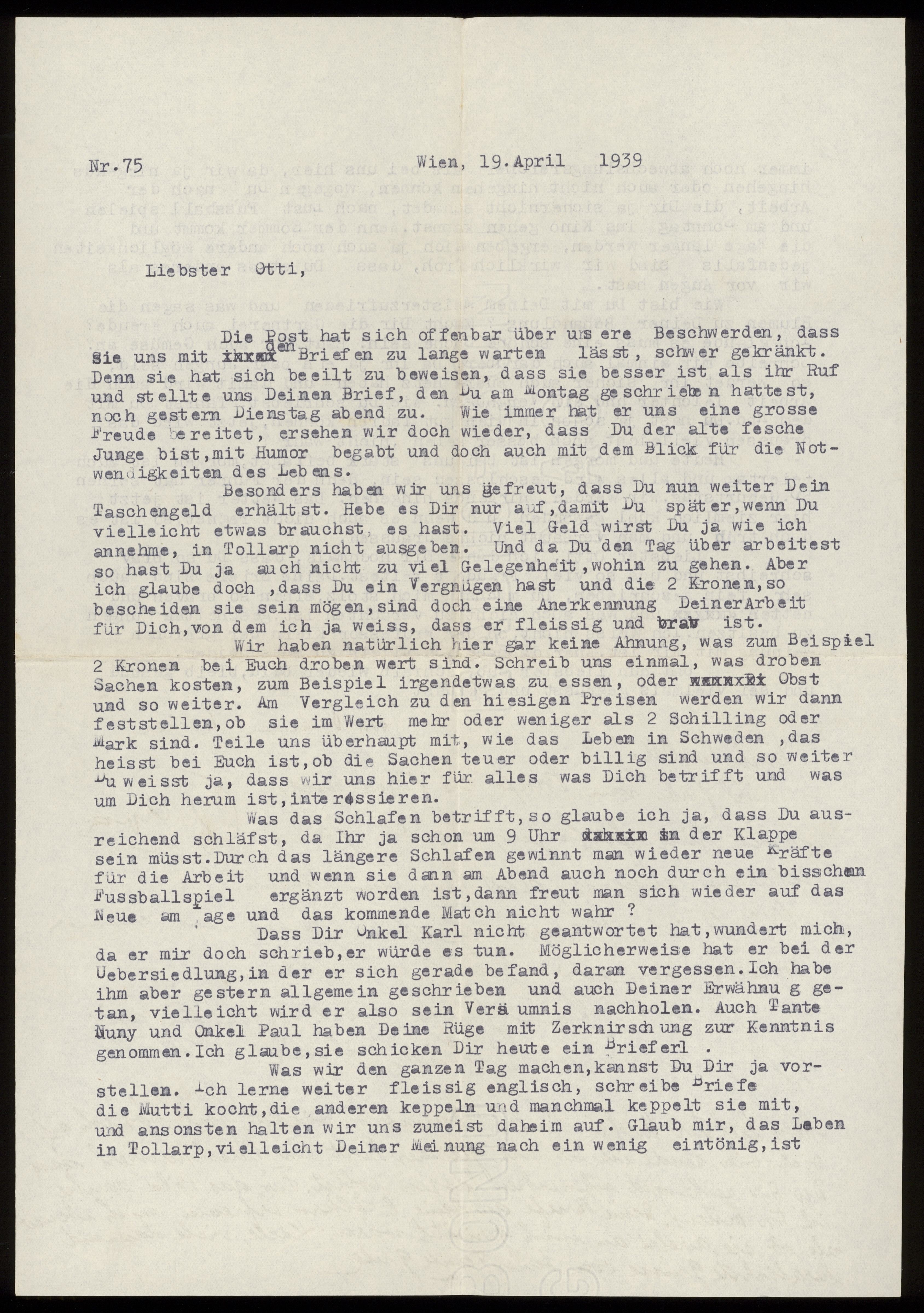 Maskinskrivet brev till Otto Ullman från föräldrarna Josef och Elise Ullmann och moster Grete Kollmann daterat 19 april 1939 Wien.