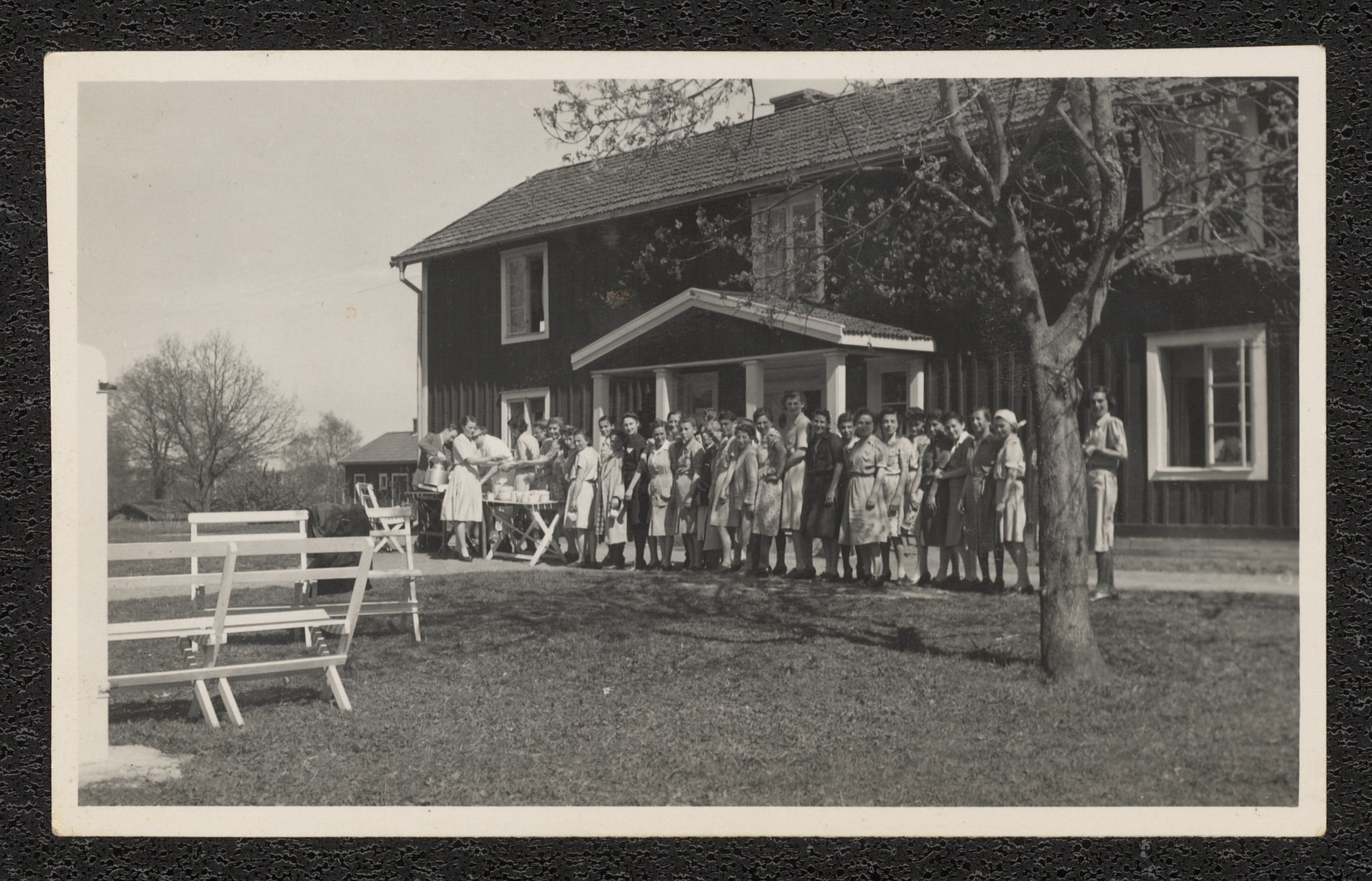 De boende på Ambjörnsgården i Nässjö köar till kaffe framför huvudbyggnaden i maj 1945. Hit kom många av 1945 års överlevande från större repatriandläger.
