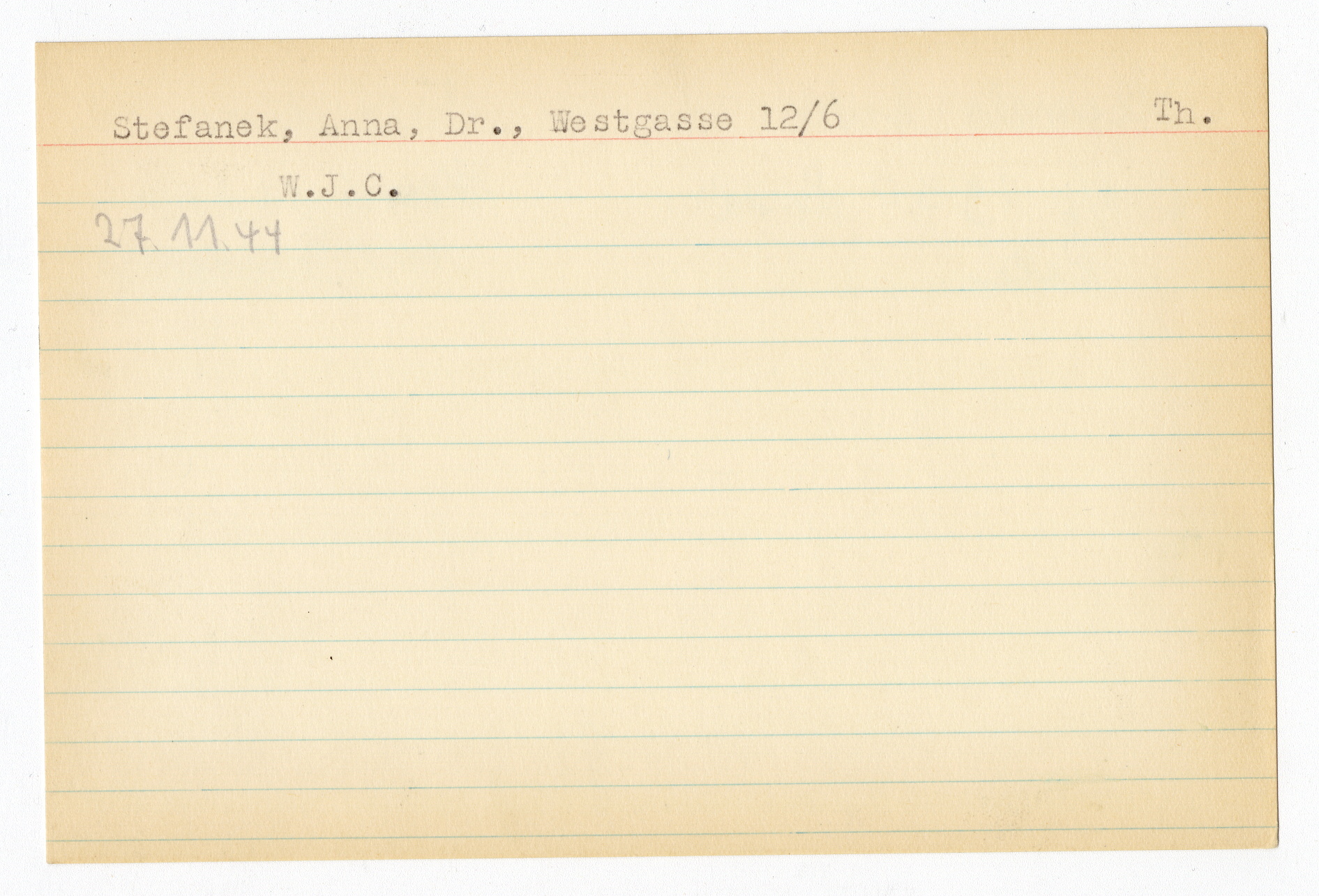 Ett skrivkort med patientuppgifter gällande Ewa Blumels. På baksidan uppgifter om matpaket till Anna Stefanek i Theresienstadt.