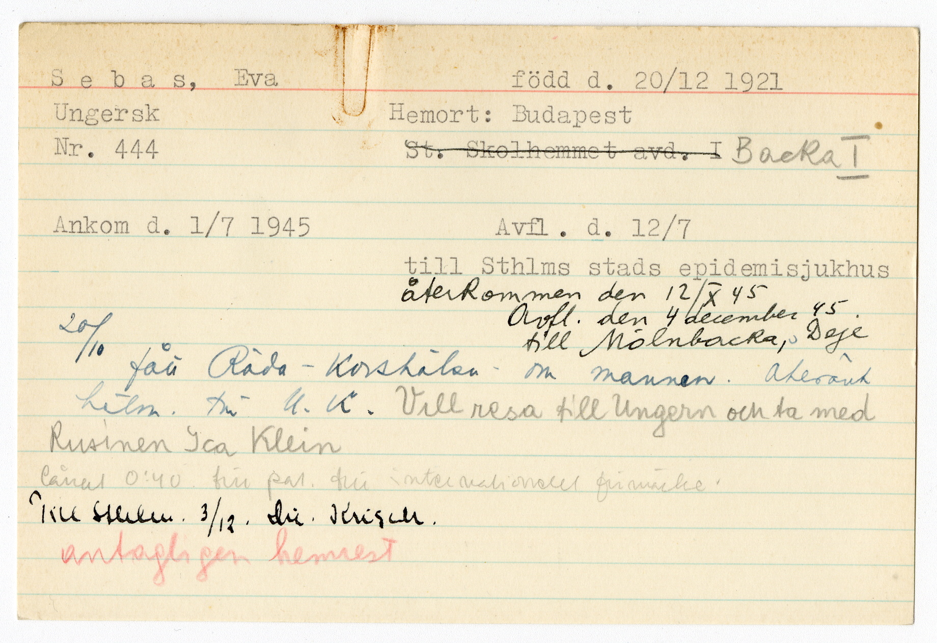 Ett skrivkort med patientuppgifter gällande Eva Sebas.