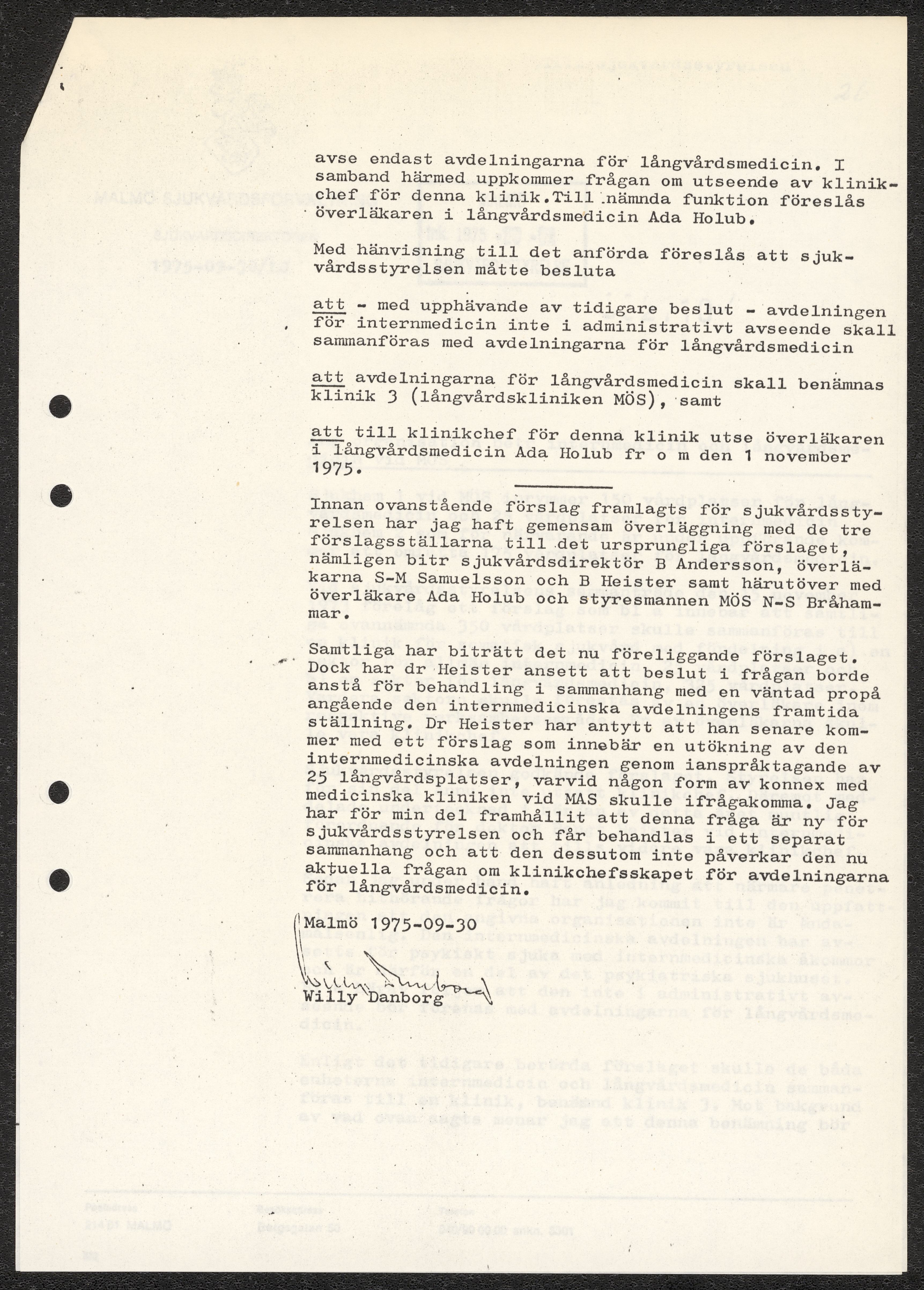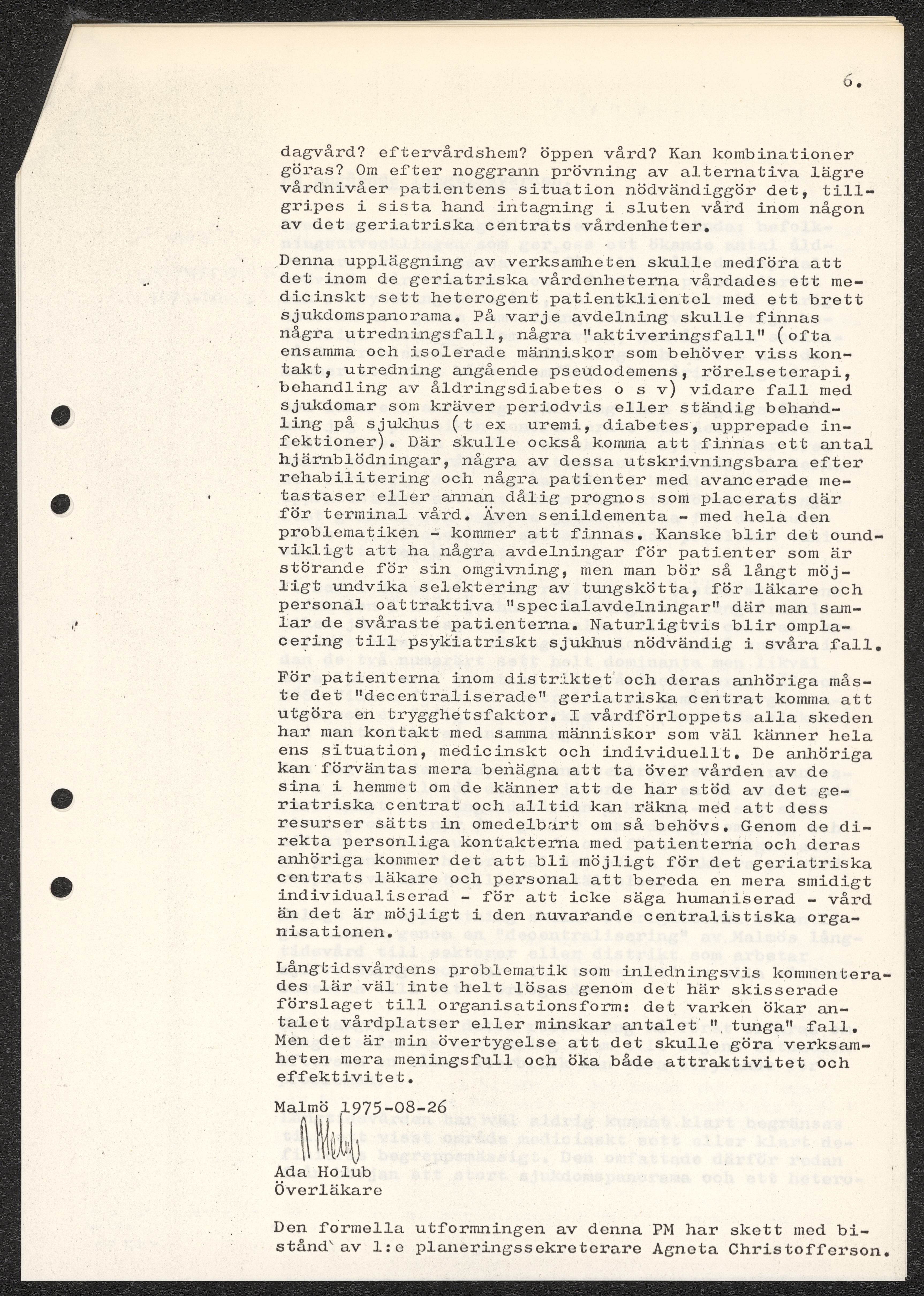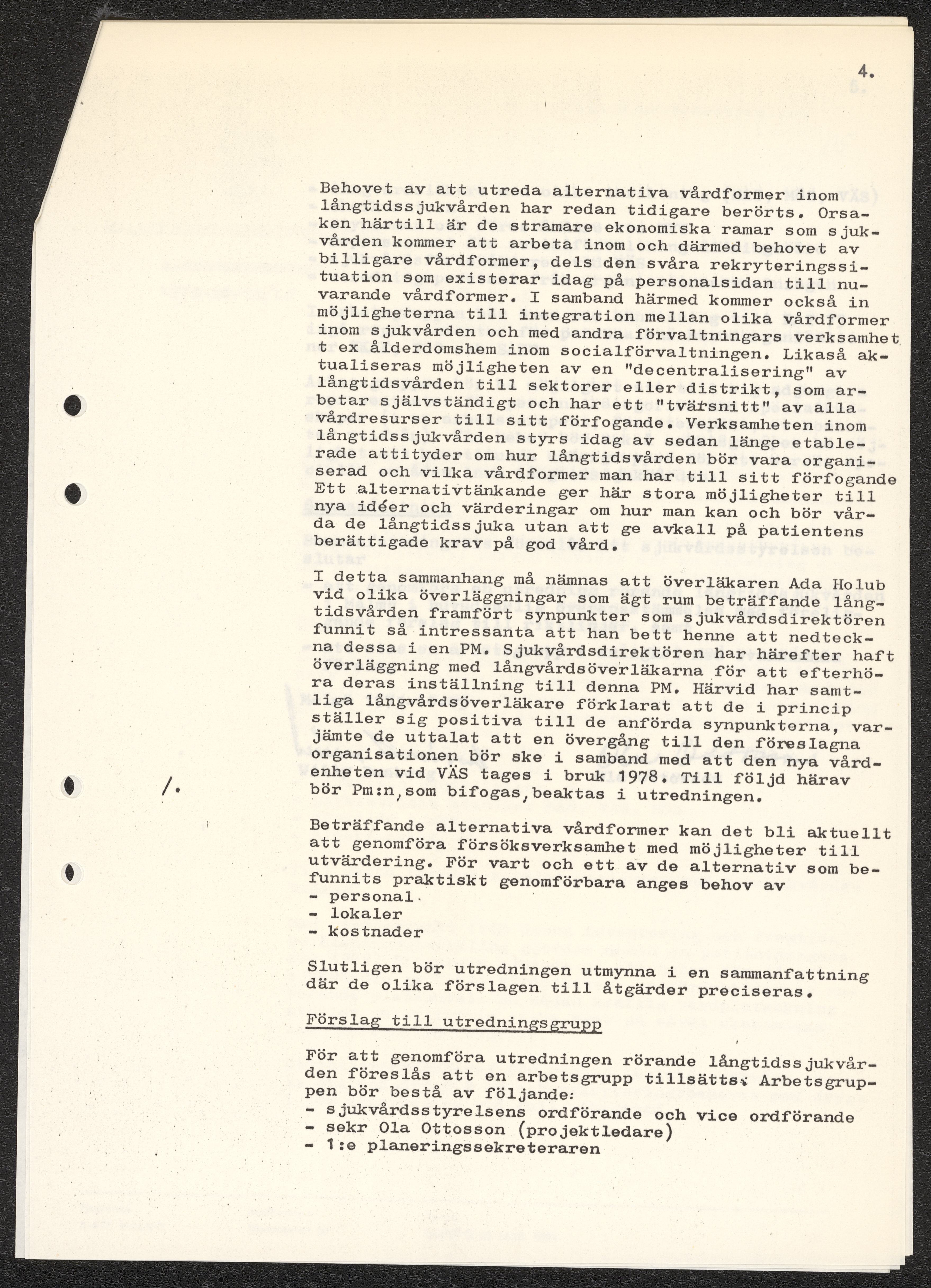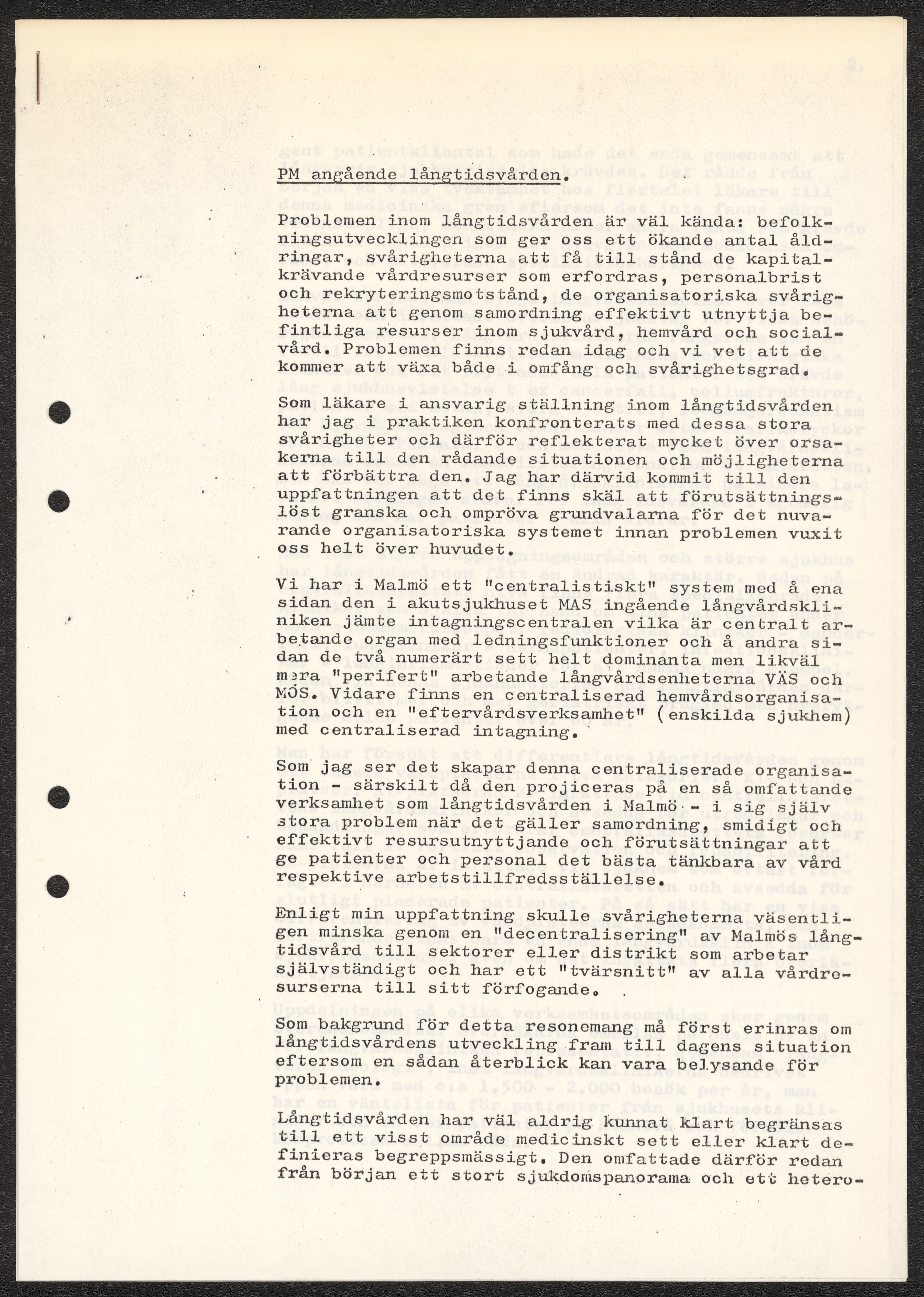 Dokument rörande långvårdens organisering i Malmö. Pm angående långtidsvården, skrivet av Ada Holub. Kopia av kallelse till möte att diskutera Holubs PM vid Malmö Sjukvårdsförvaltning. Förslag från Malmö sjukvårdsförvaltning gällande organisatoriska förändringar. Fotostatkopia av artikel "Så kan Malmö lösa krisen: Långvård i små centra" samt Personaltidning för sjukvårdsförvaltningen i Göteborg.
