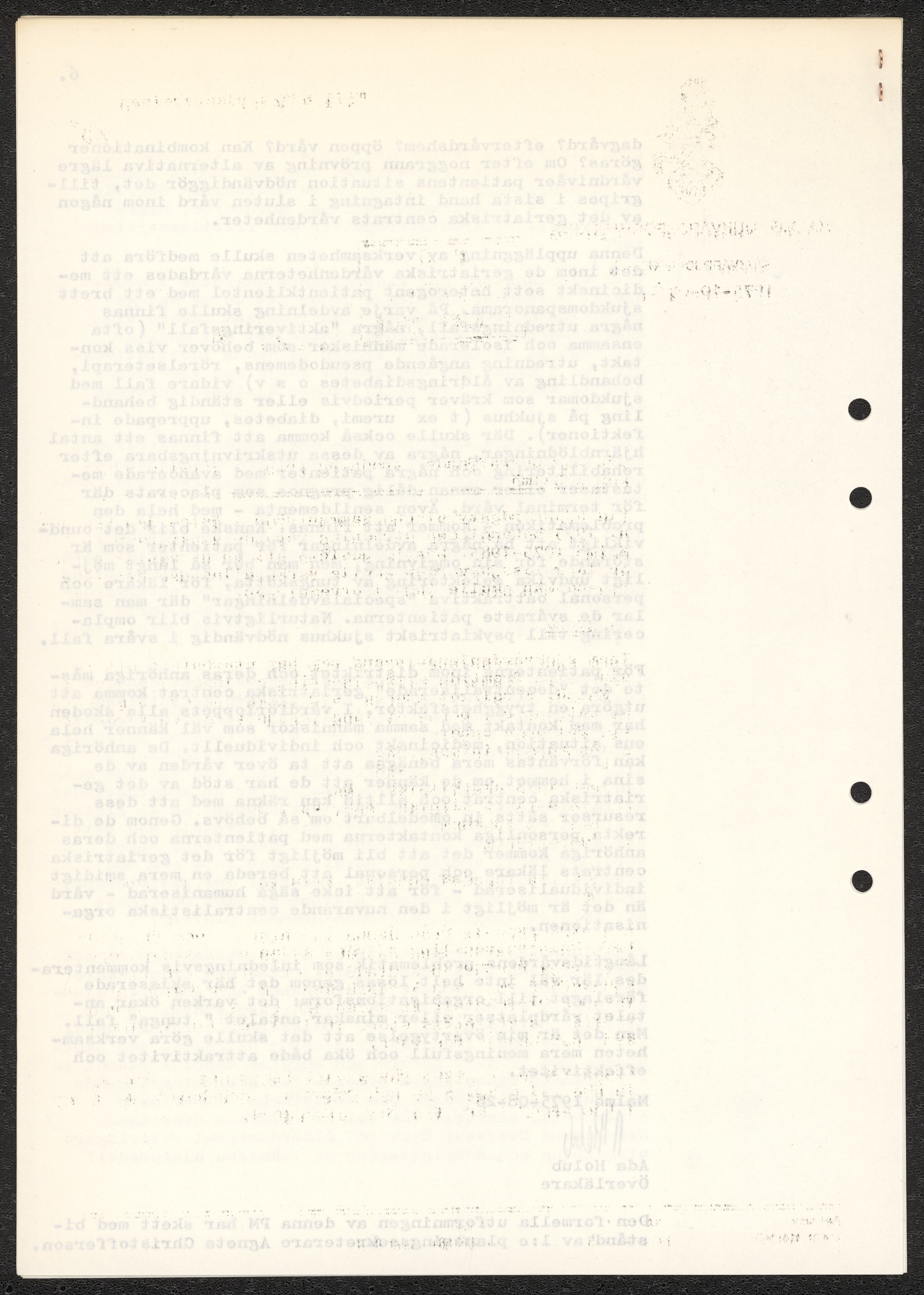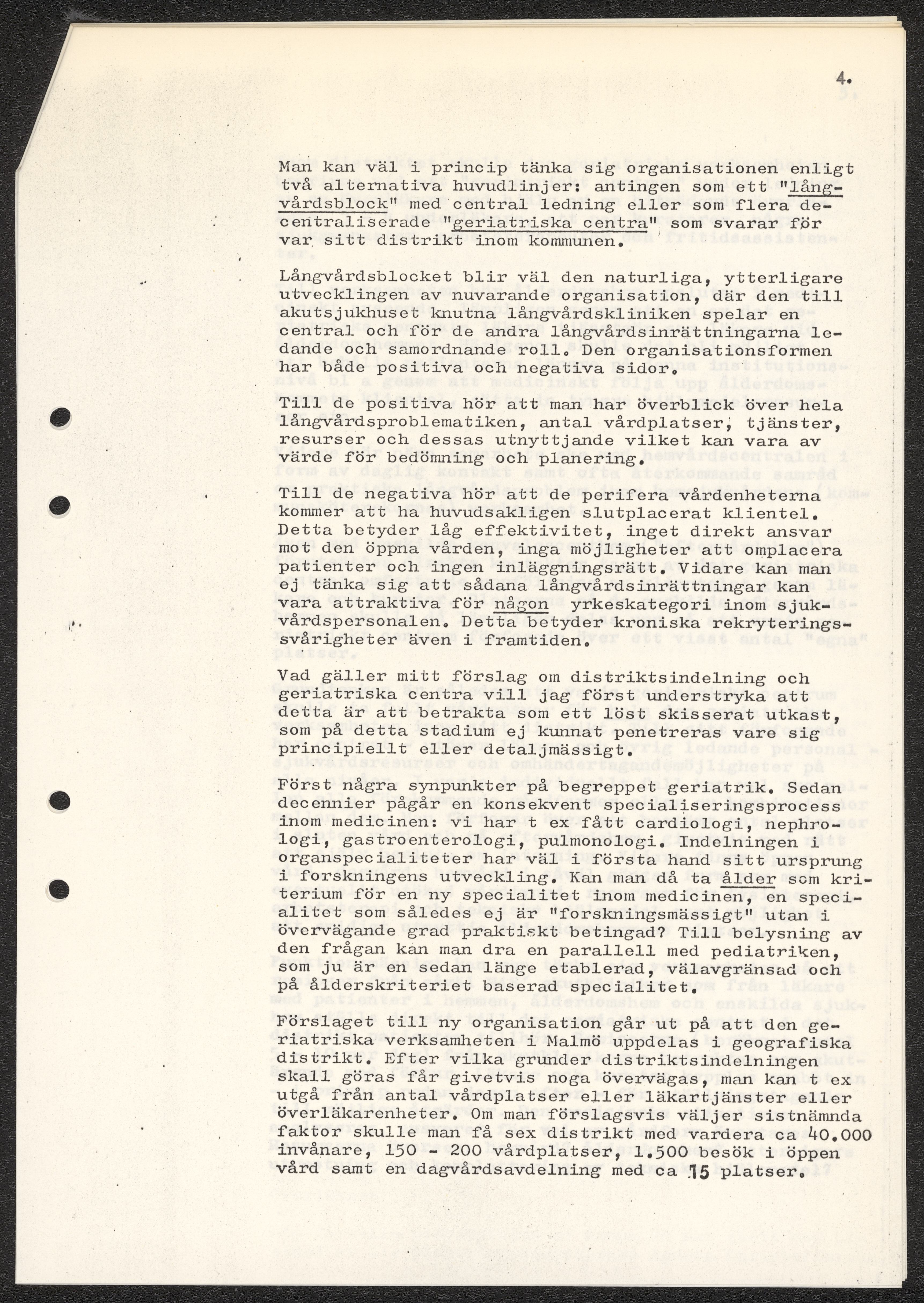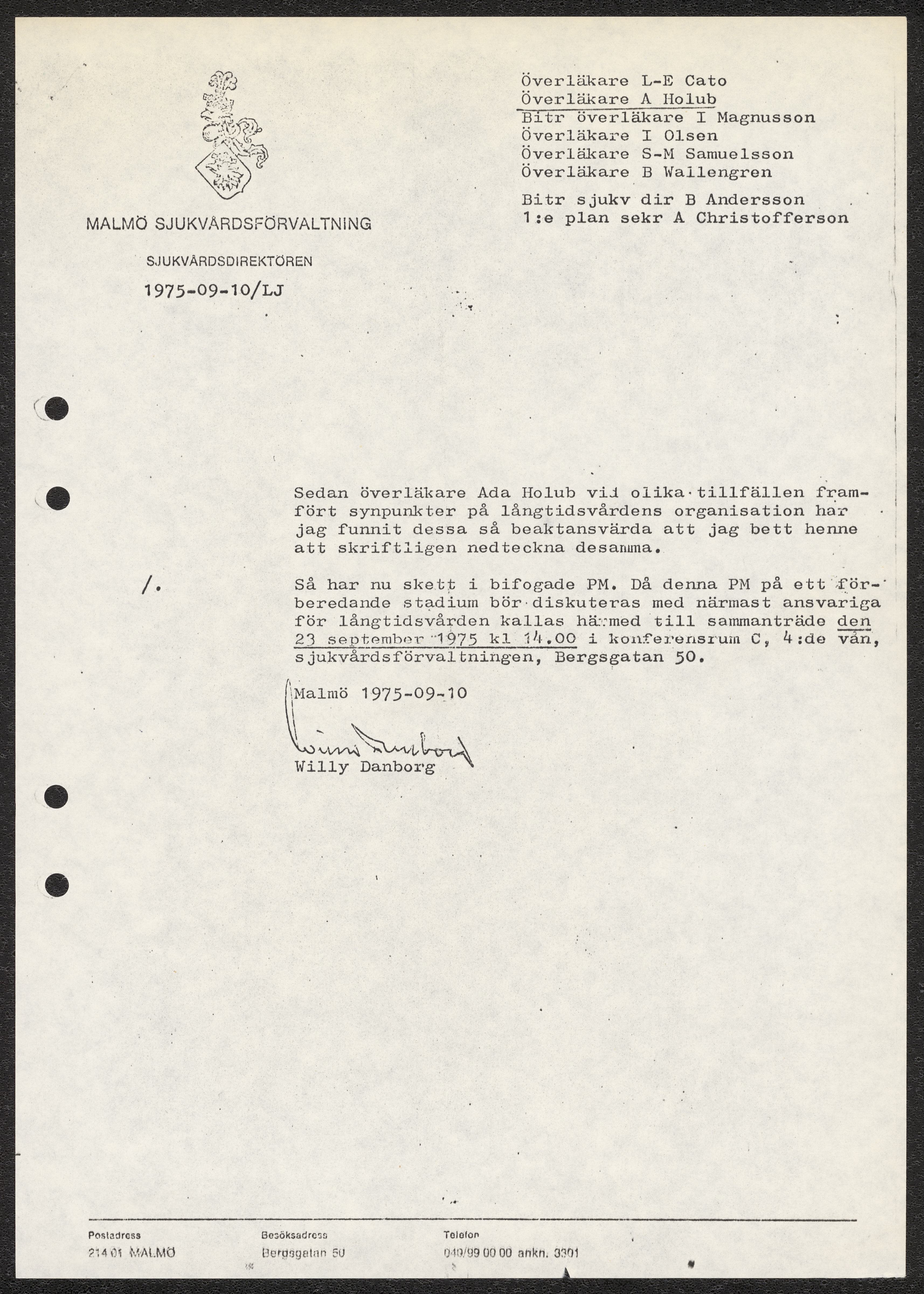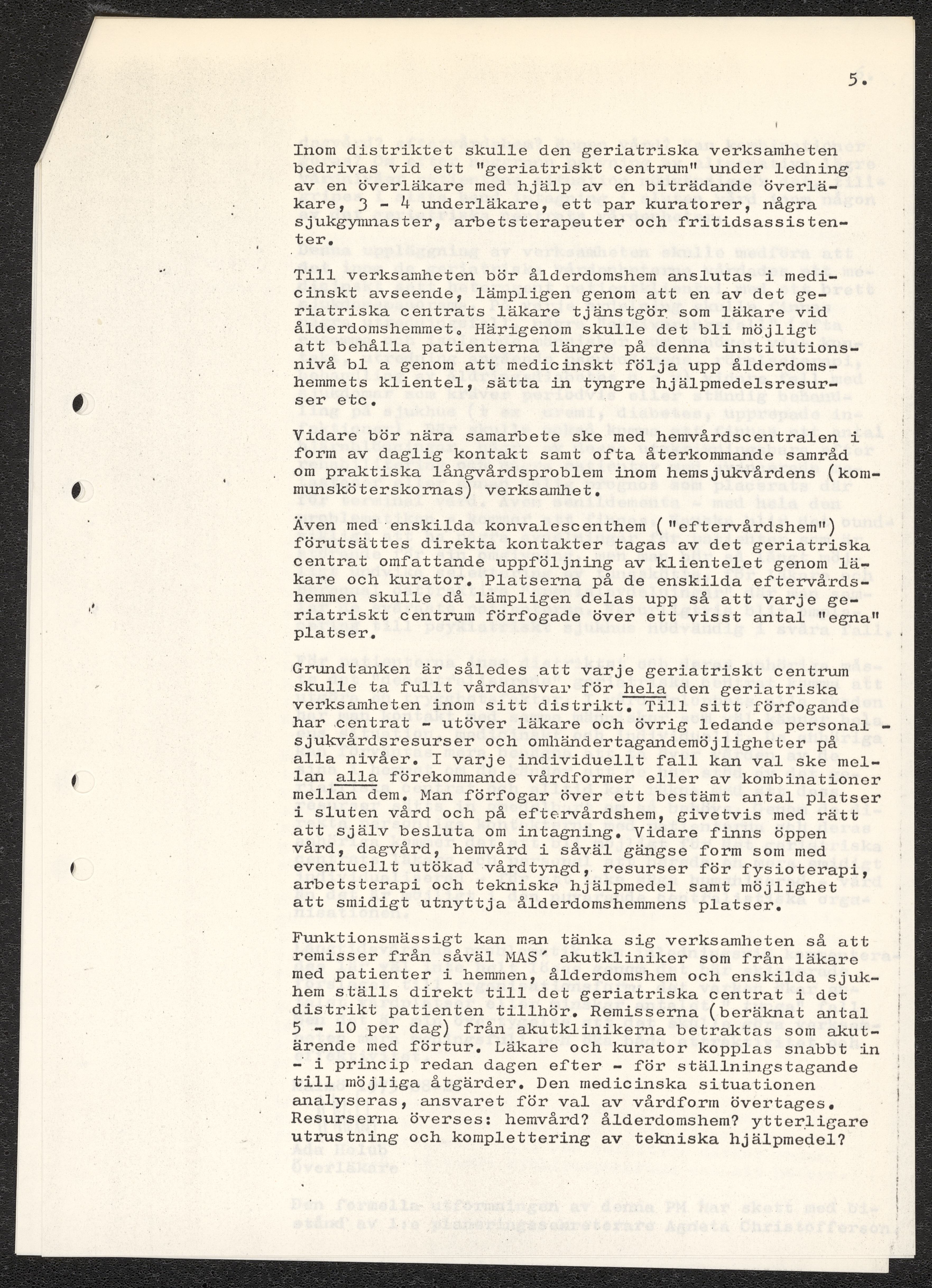 Dokument rörande långvårdens organisering i Malmö. Pm angående långtidsvården, skrivet av Ada Holub. Kopia av kallelse till möte att diskutera Holubs PM vid Malmö Sjukvårdsförvaltning. Förslag från Malmö sjukvårdsförvaltning gällande organisatoriska förändringar. Fotostatkopia av artikel "Så kan Malmö lösa krisen: Långvård i små centra" samt Personaltidning för sjukvårdsförvaltningen i Göteborg.