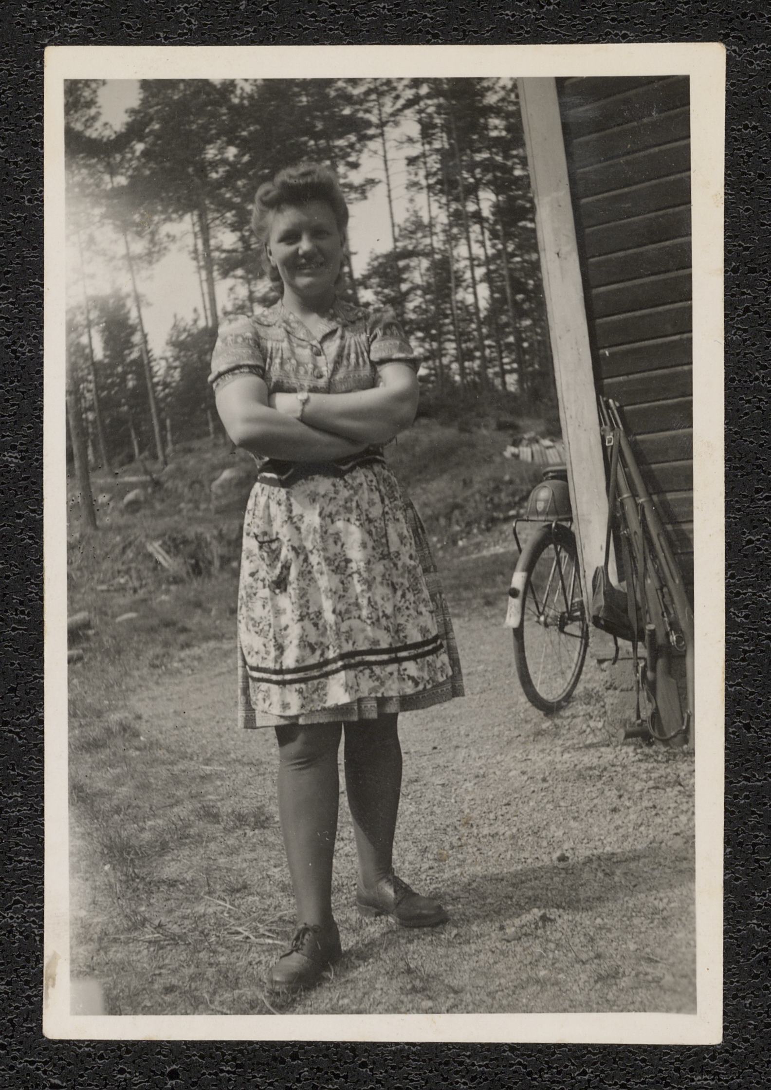 En kvinnar i blommig klänning ler mot kameran. Troligen Rosa Gustafssons svägerska Sigrid.