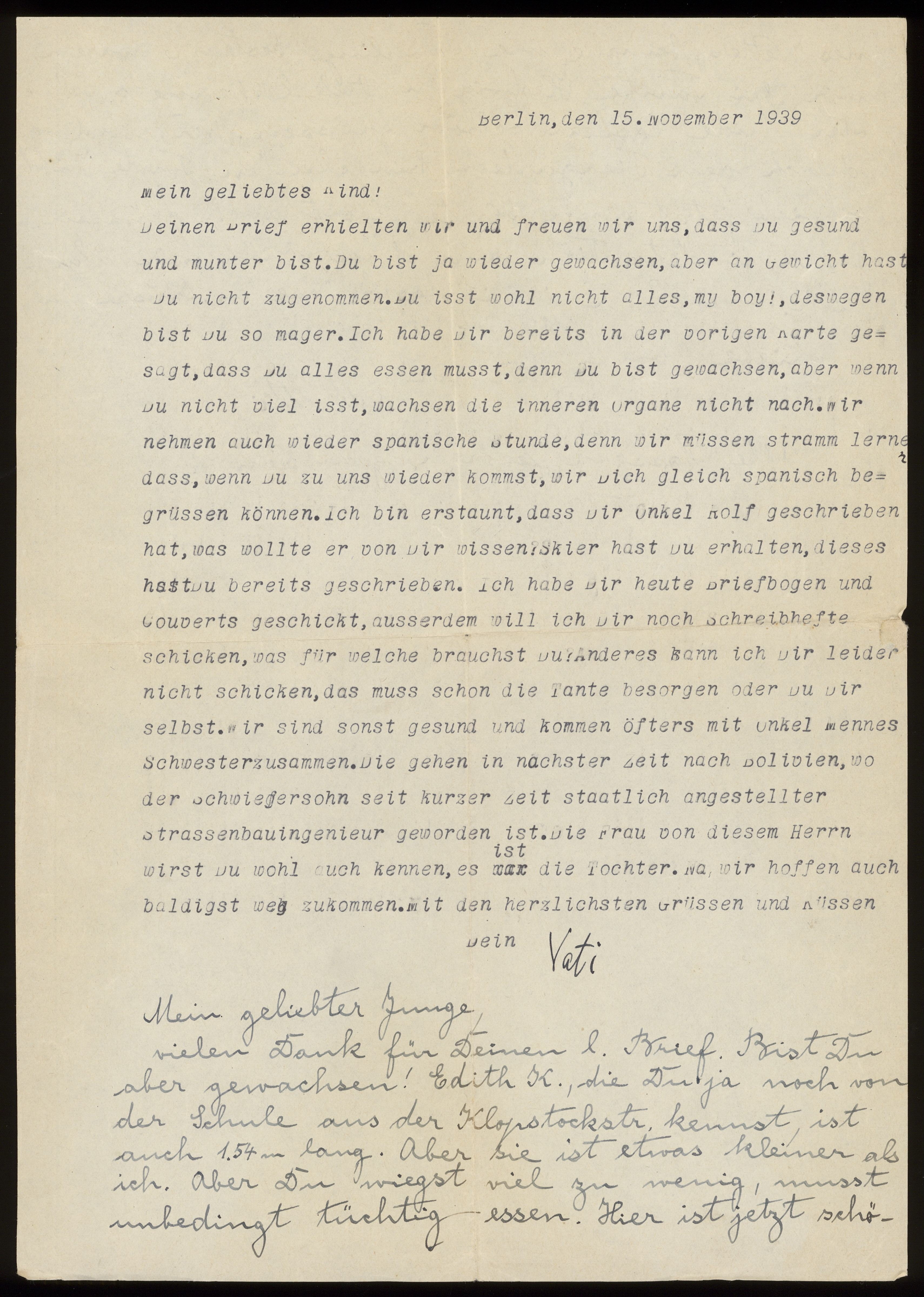Brev från föräldrarna Anna och Siegfried Posner till sonen Ludwig Posner daterat 15 november 1939.