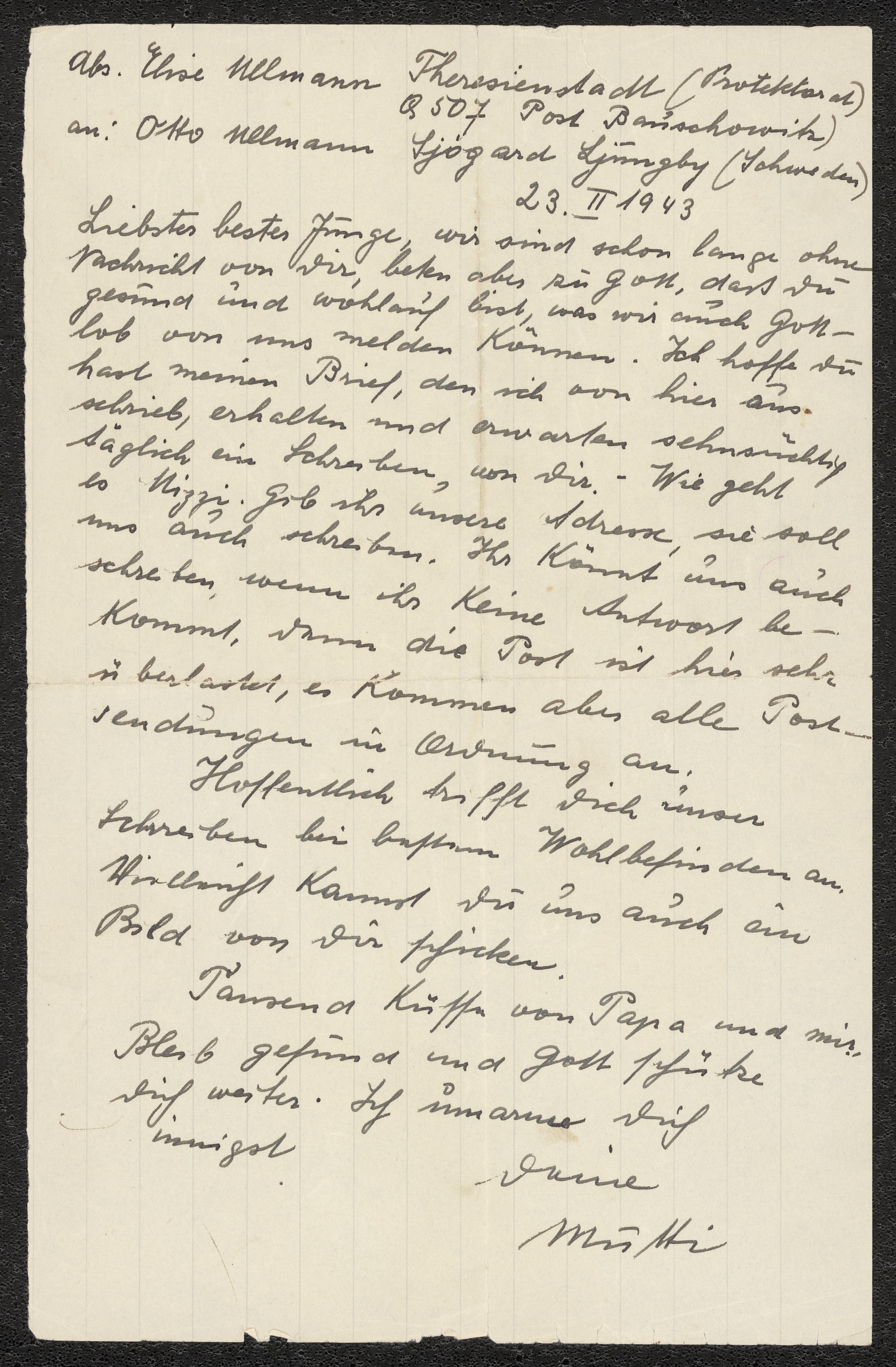 Brev till Otto Ullman från föräldrarna Josef och Elise Ullmann daterat 23 februari 1943 Theresienstadt.