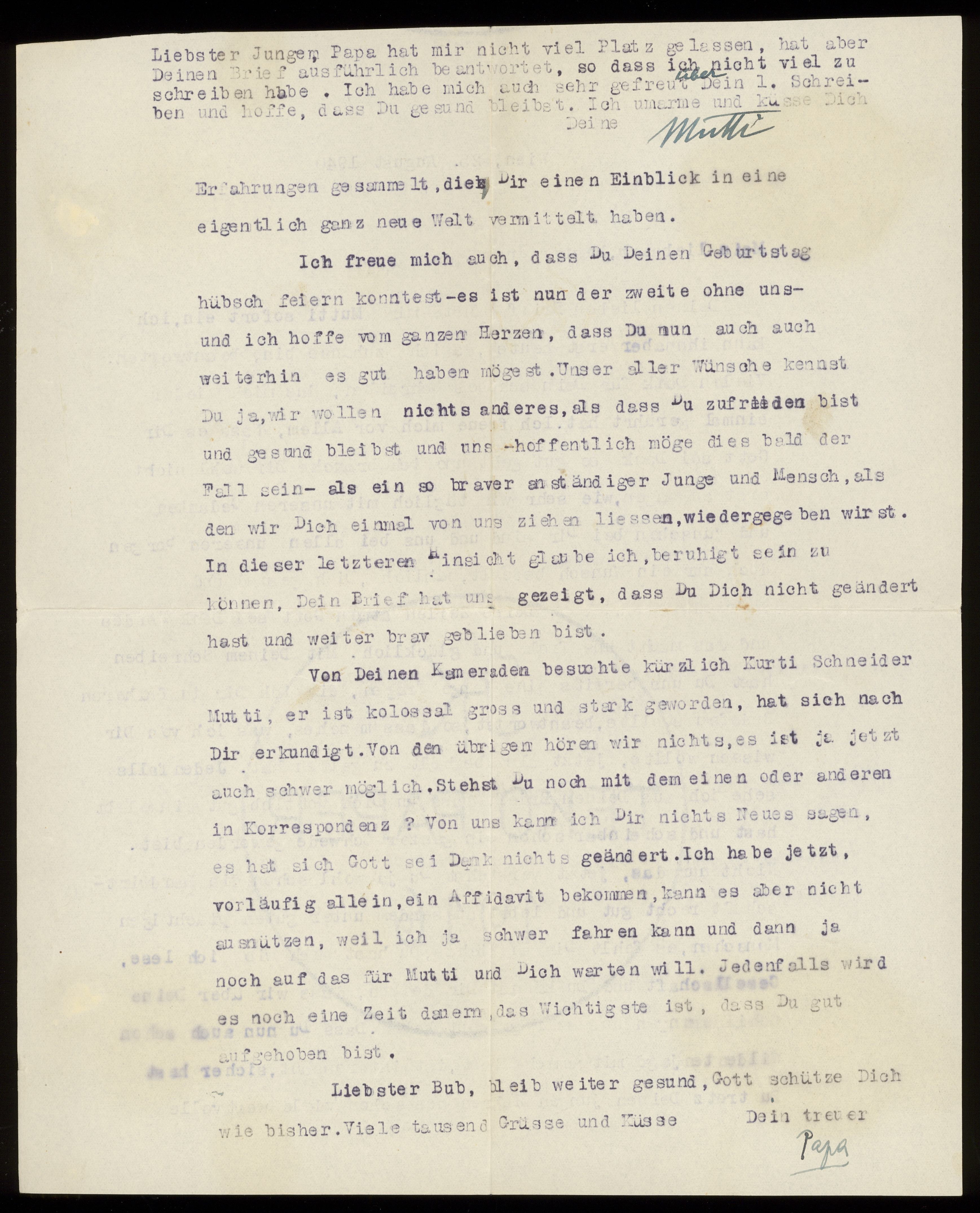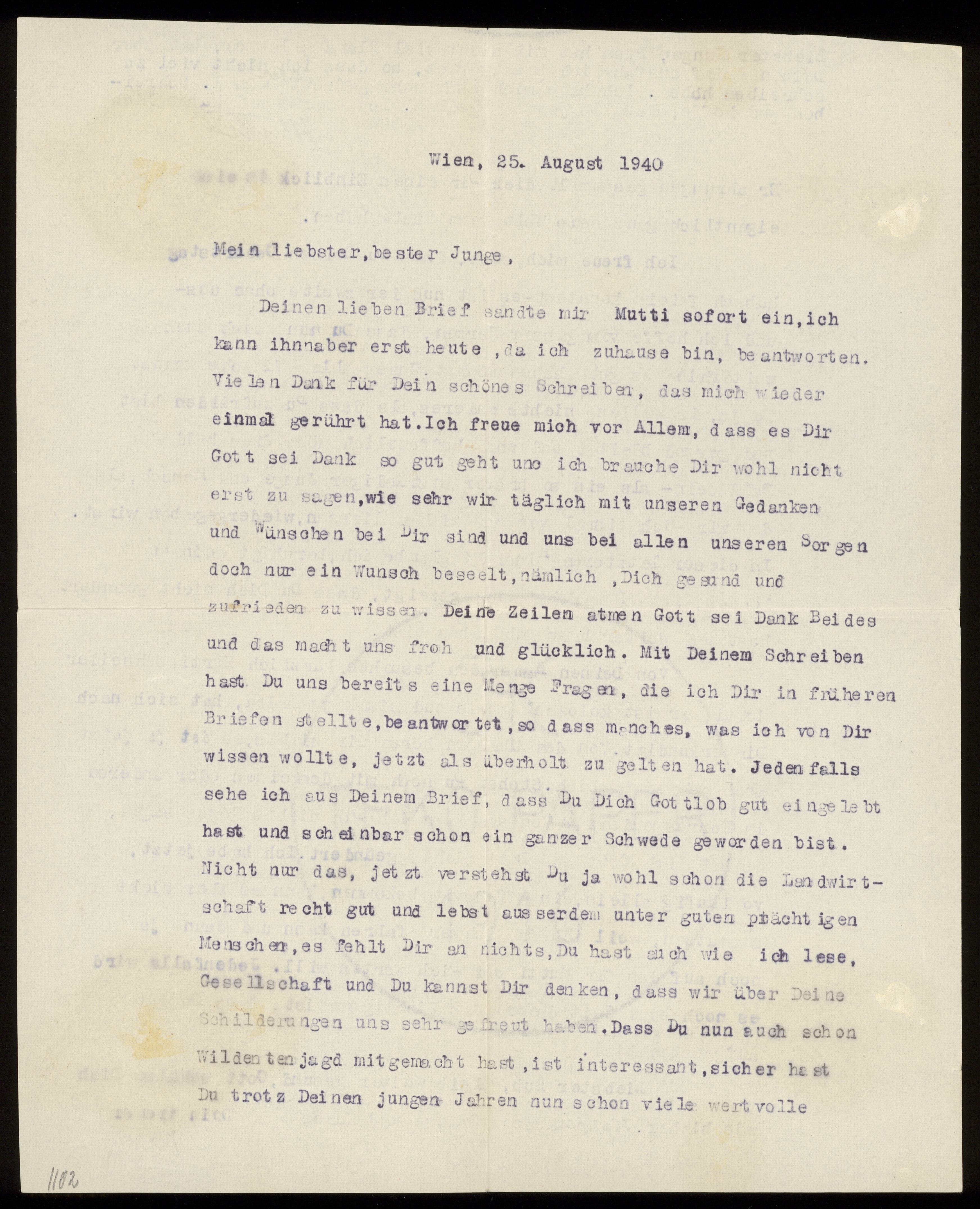 Maskinskrivet brev till Otto Ullman från föräldrarna Josef och Elise Ullmann daterat 25 augusti 1940 Wien.
