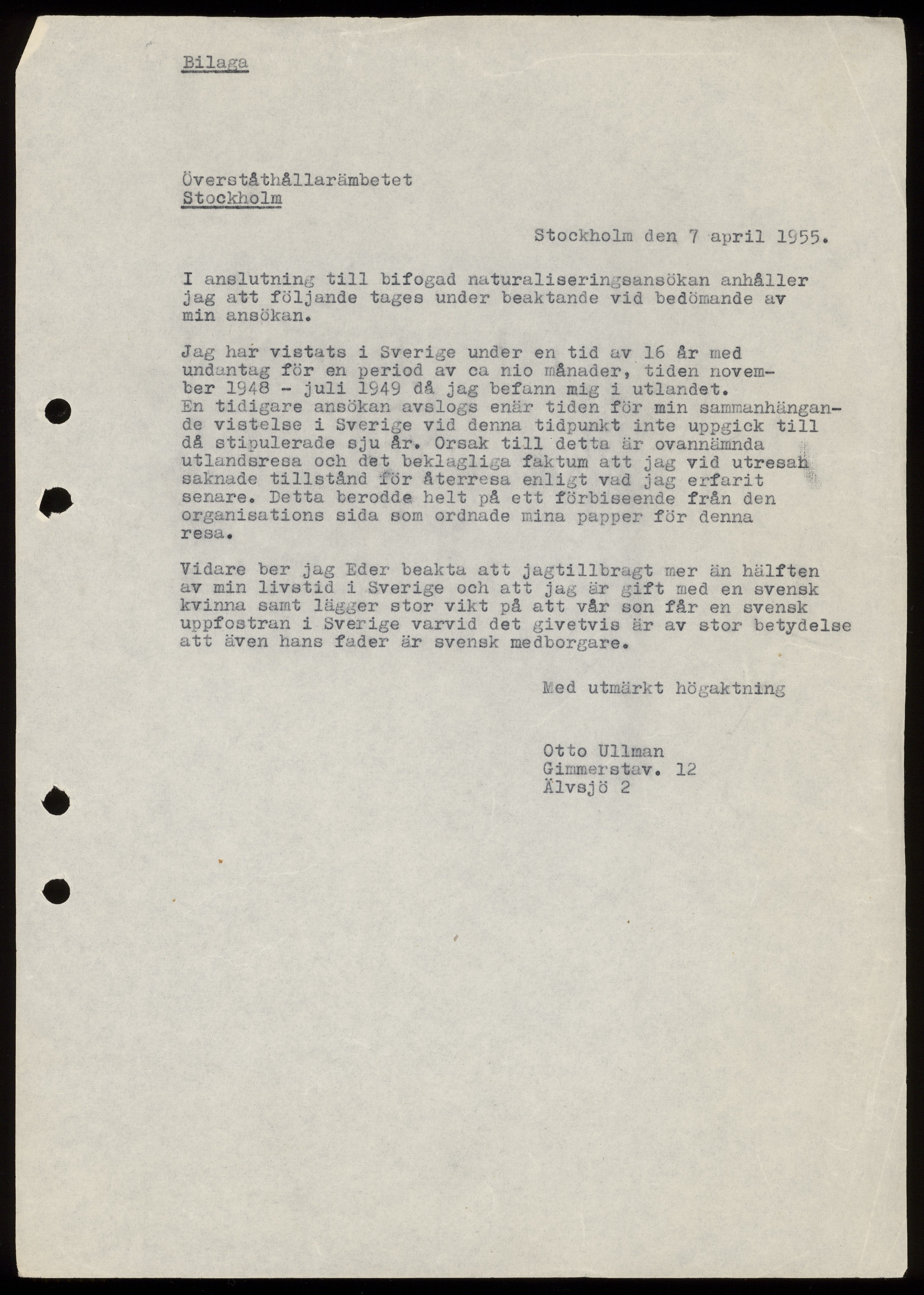 Brev till Överståthållarämbetet från Otto Ullman angående svenskt medborgarskap 7 april 1955.