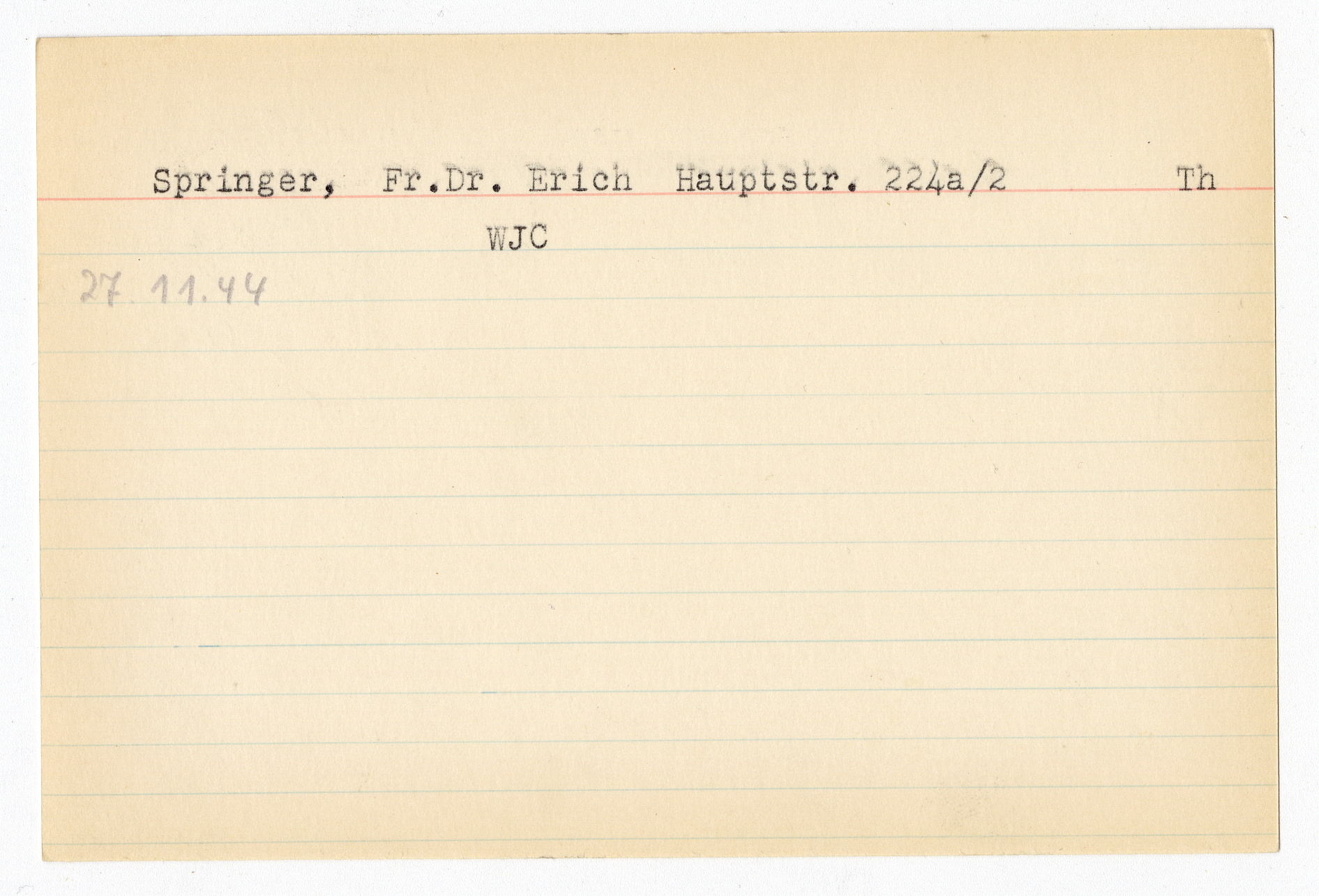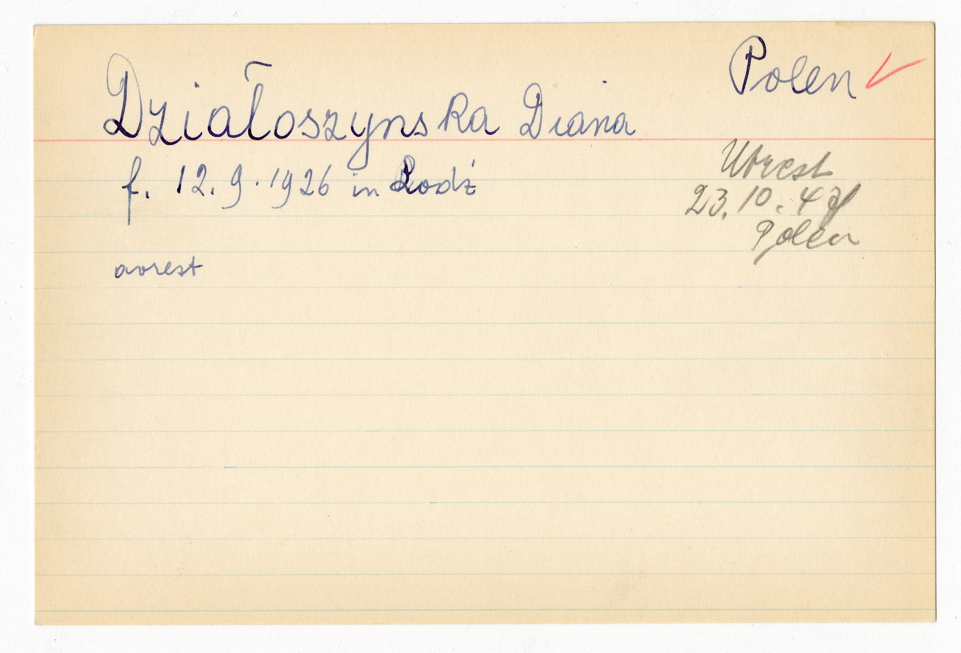 Ett skrivkort med patientuppgifter gällande Diana Dzialoszynska. På baksidan uppgifter om matpaket till Erich Springer i Theresienstadt.