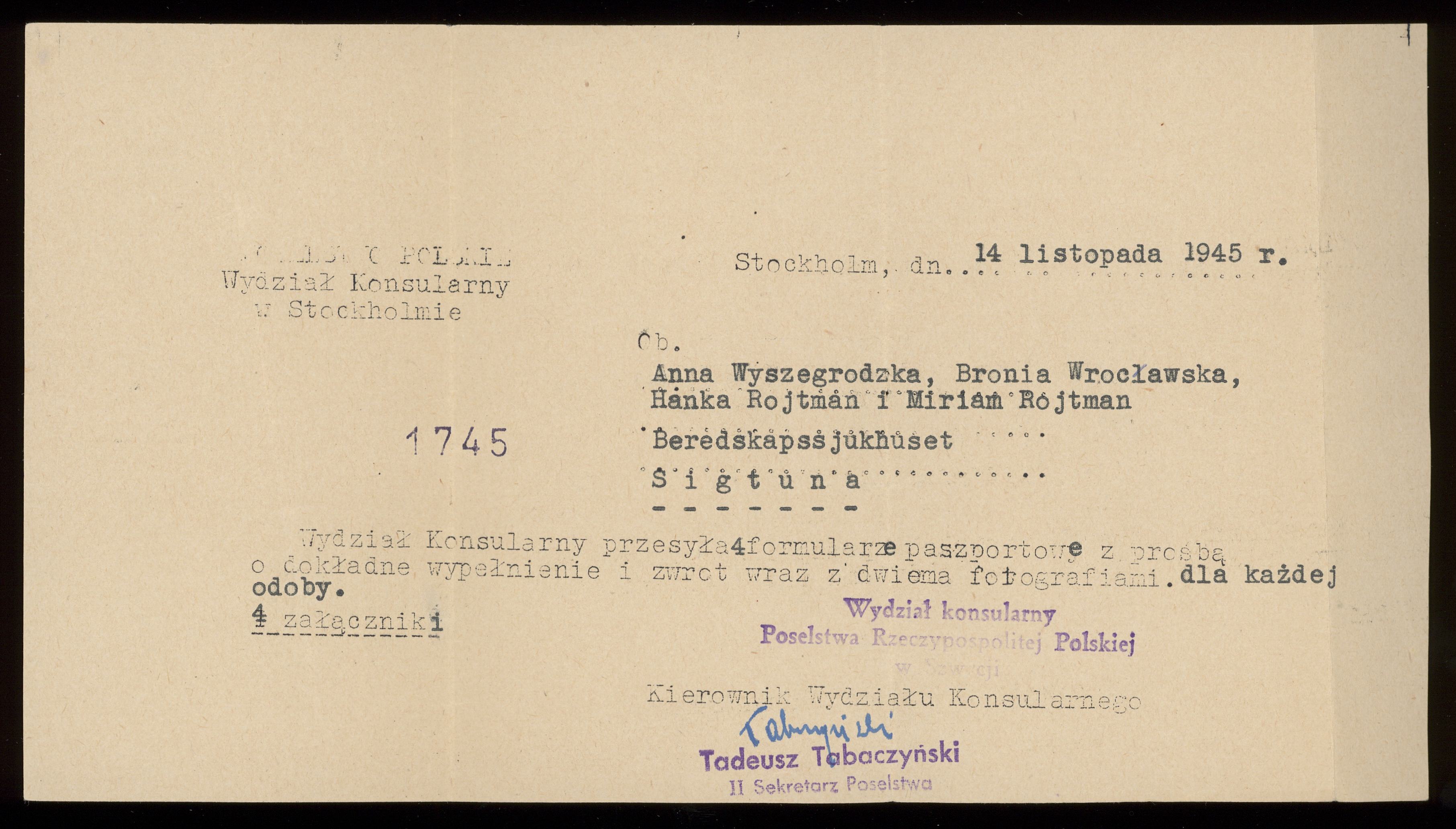 Ett dokument från Tadeusz Tabaczynski på Polska ambassaden till Anna Wyszergodska, Bronia Wroclawska, Hanka Rojtman och Miriam Rojtman 14 oktober 1945 Stockholm.
