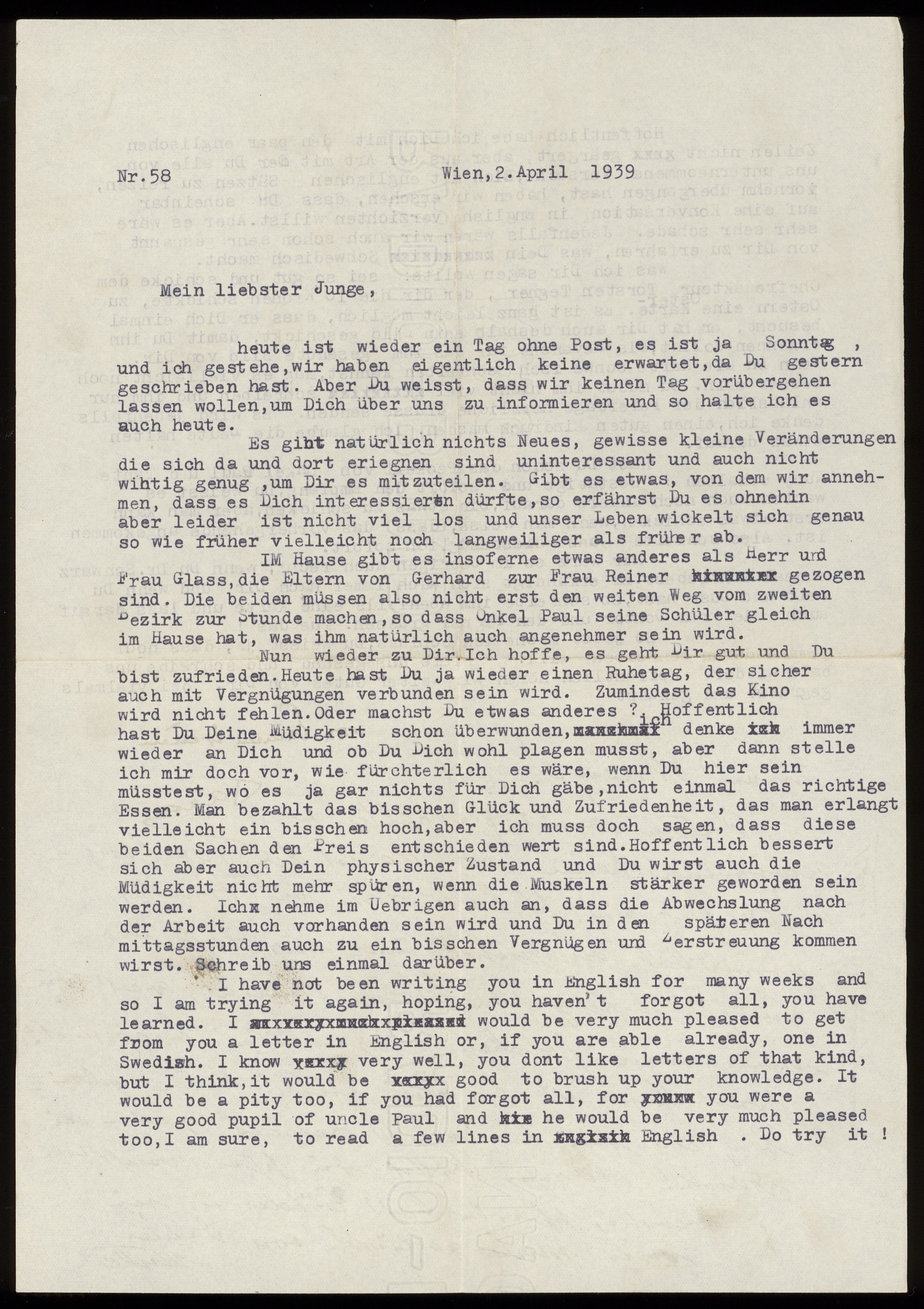 Maskinskrivet brev till Otto Ullman från föräldrarna Josef och Elise Ullmann daterat 2 april 1939 Wien.