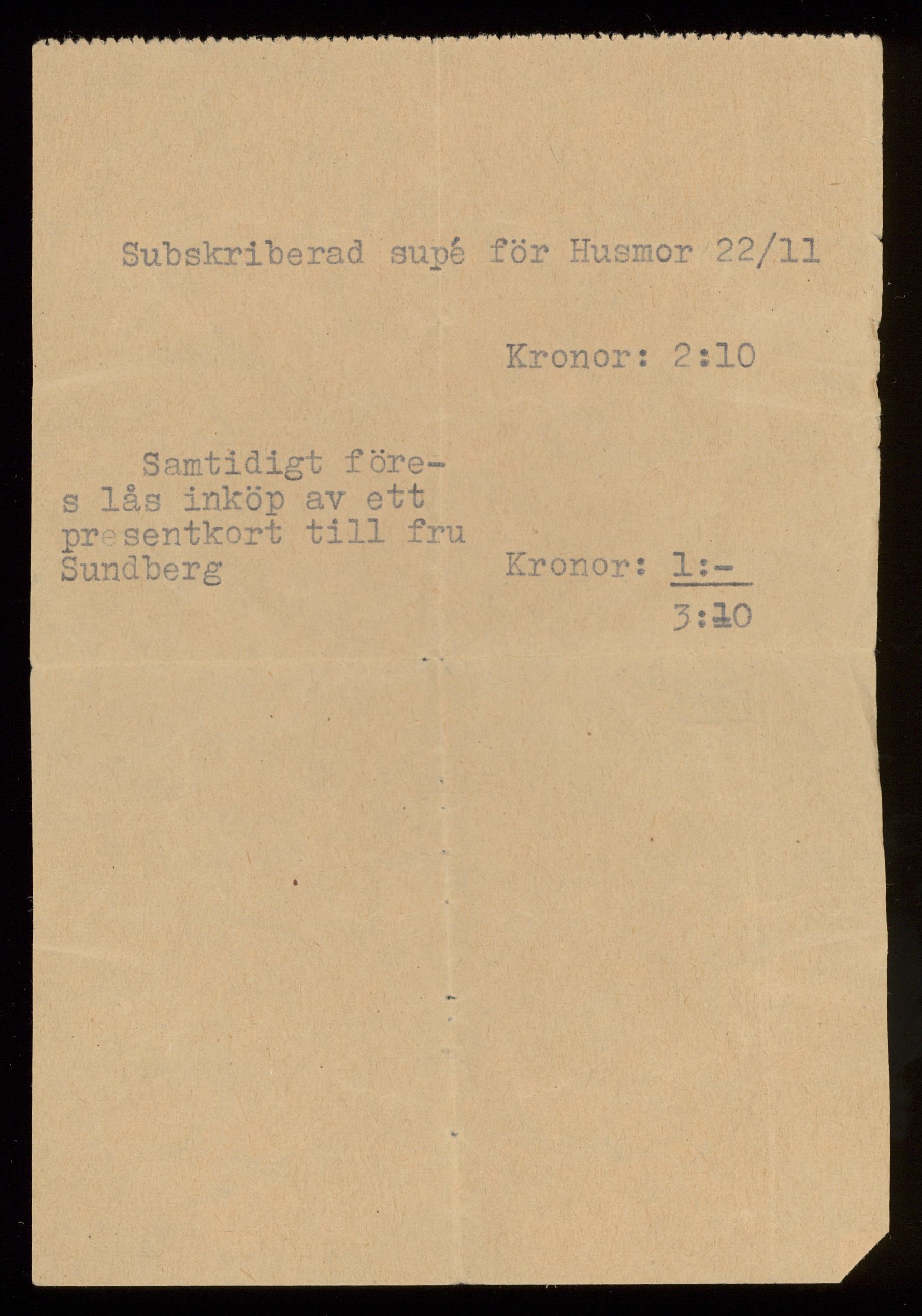 En subskription tillhörande Ilona Kaiser 22 november troligtvis 1945.
