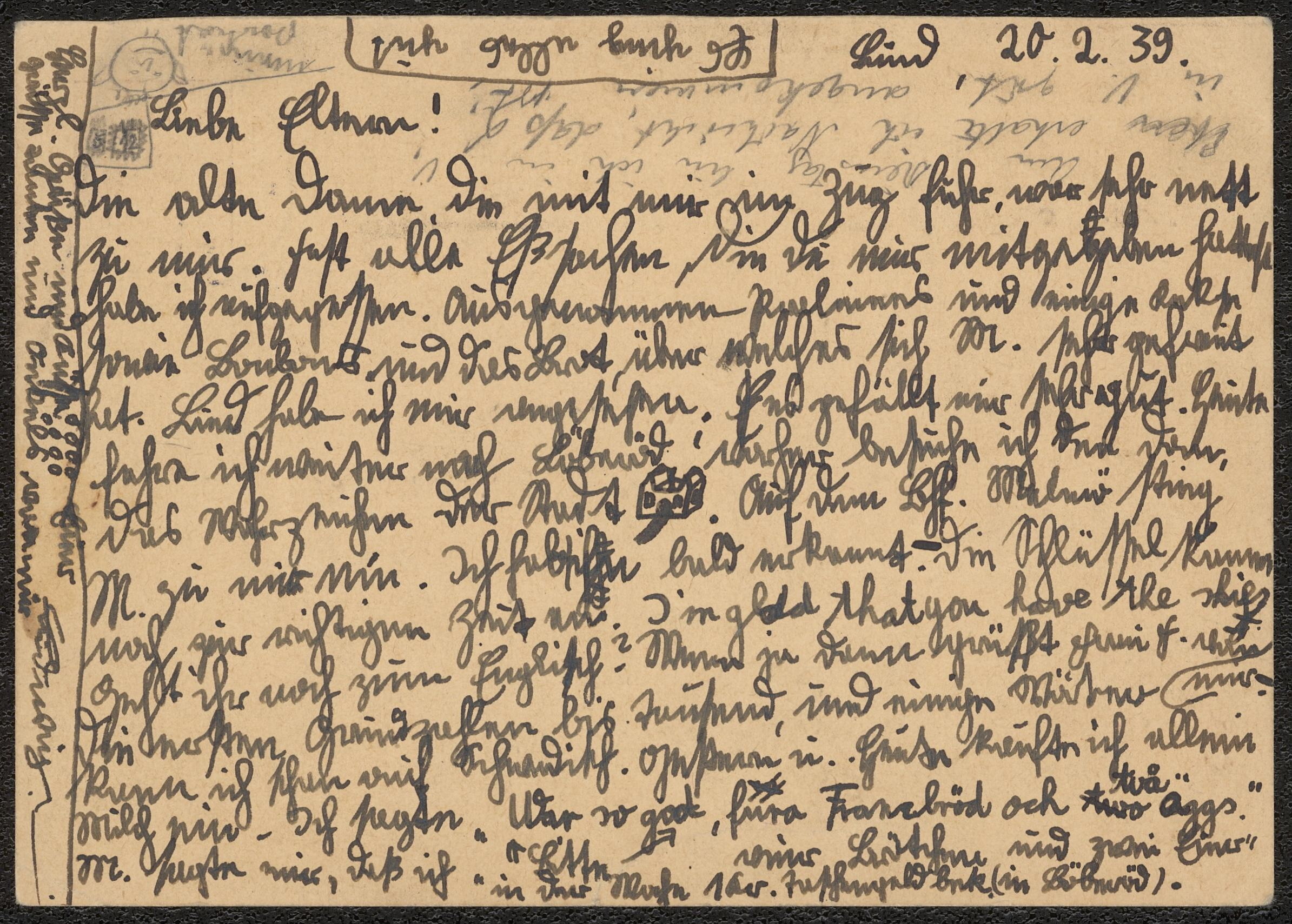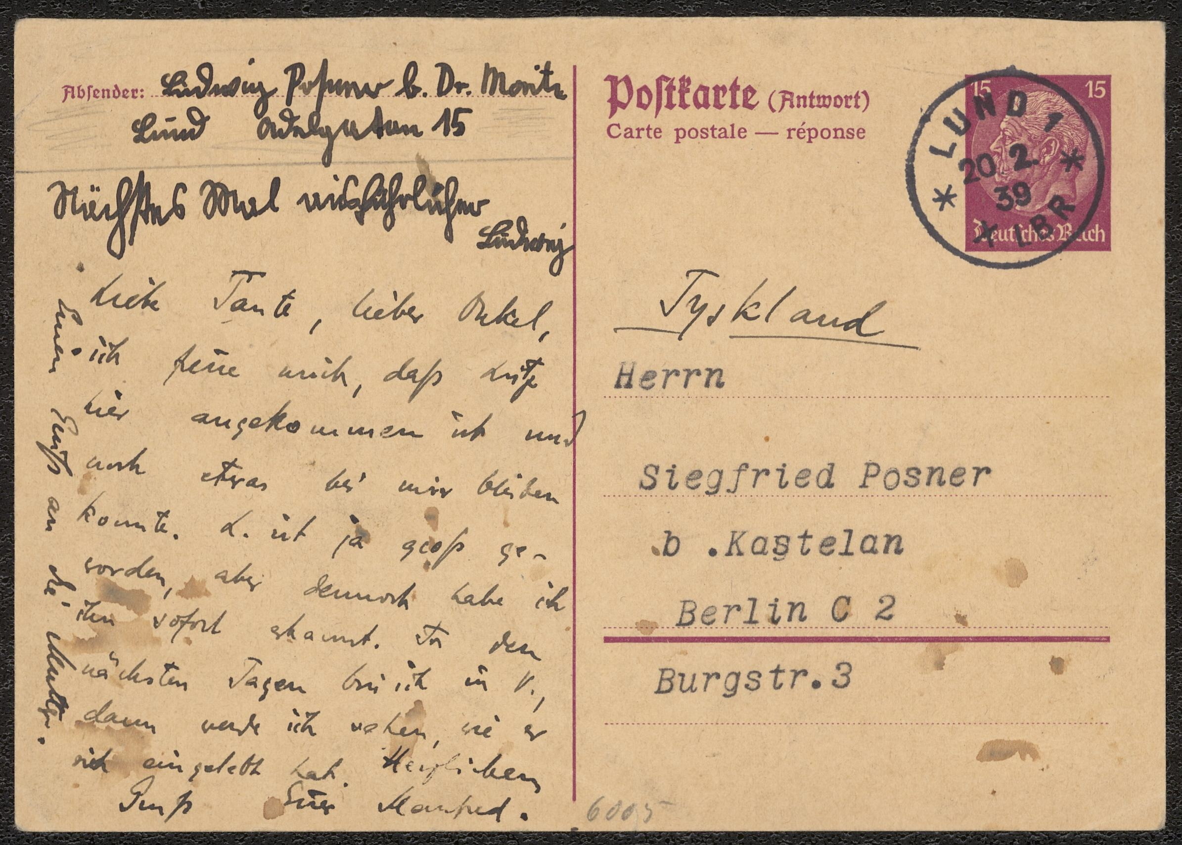 Brevkort från okänd avsändare till Ludwig Posner daterat 20 februari 1939.
