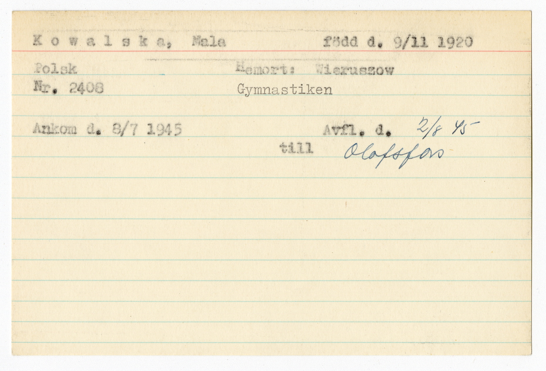 Ett skrivkort med patientuppgifter gällande Mala Kowalska.