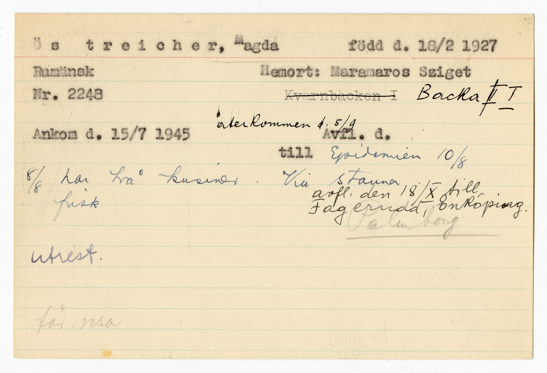 Ett skrivkort med patientuppgifter gällande Magda Östreicher.