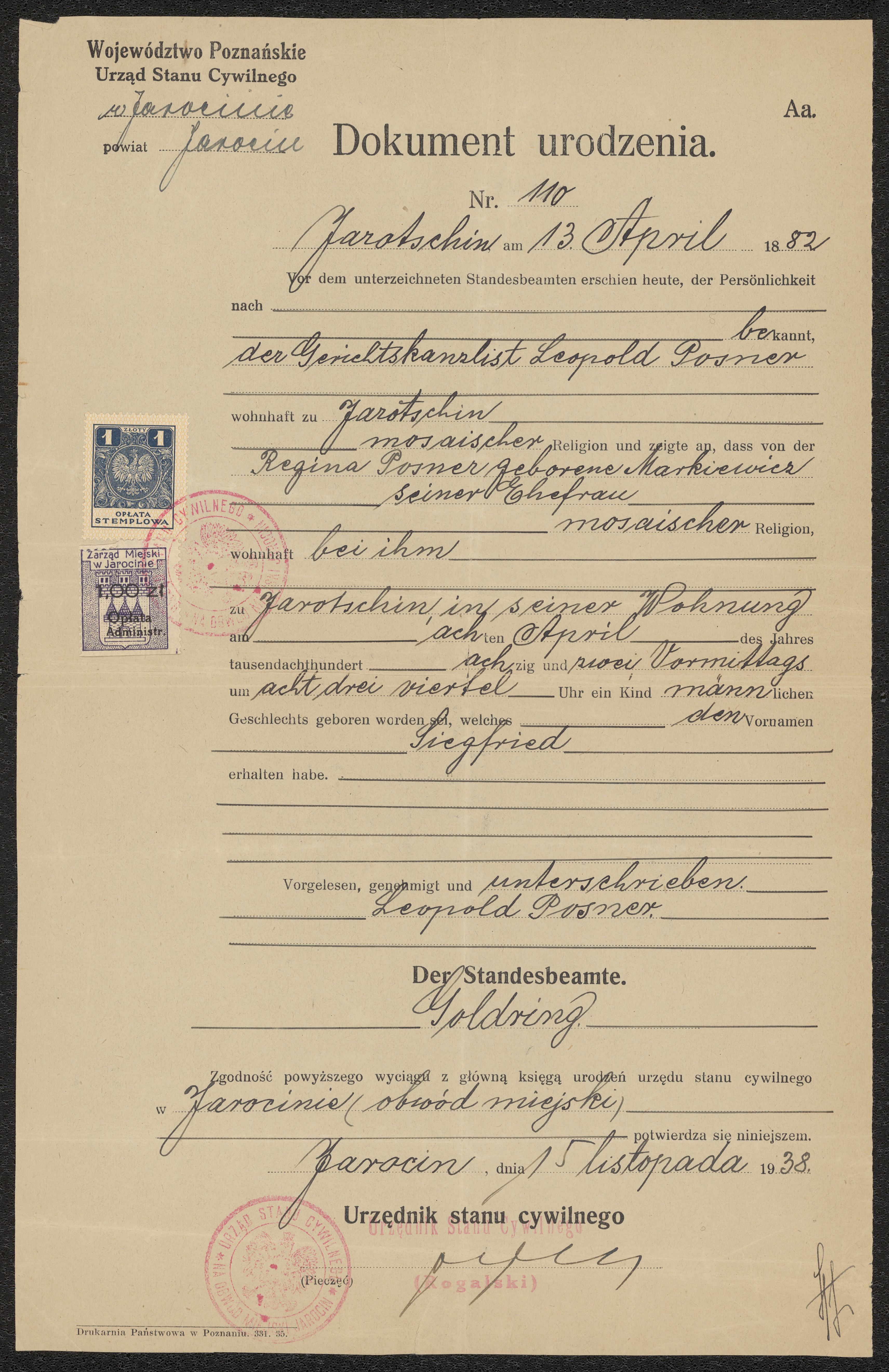 Födelsebevis för Siegfried Posner