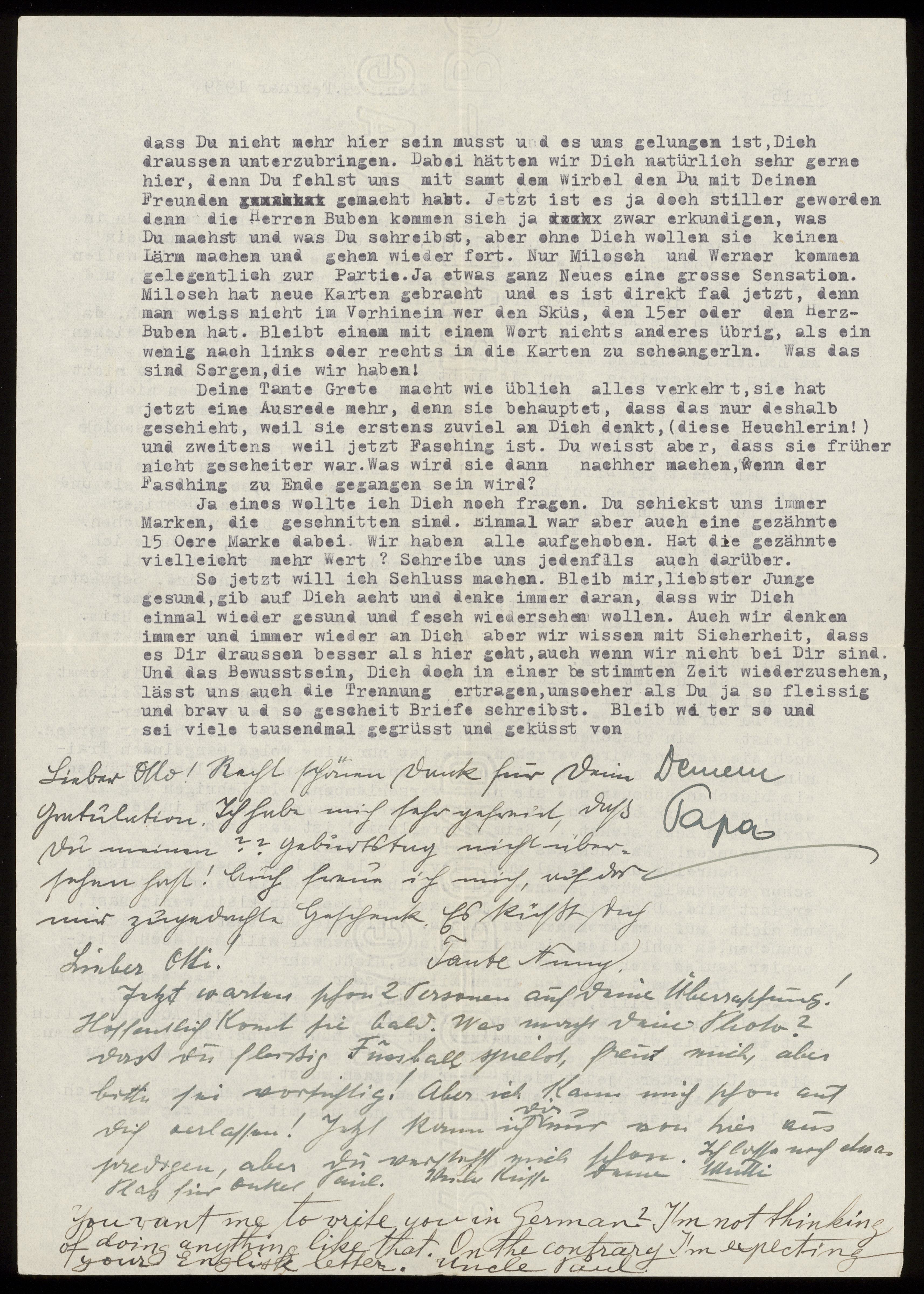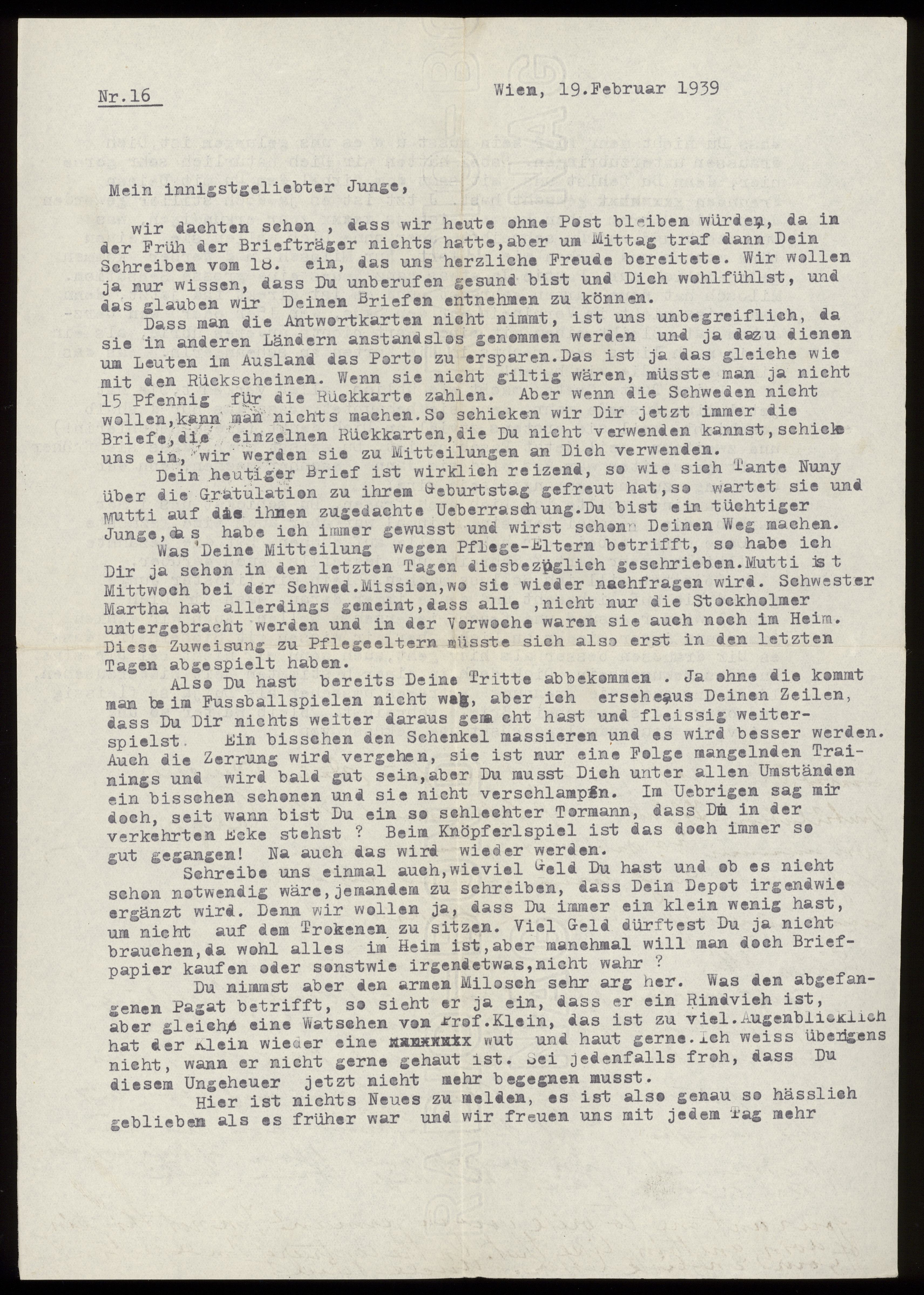 Maskinskrivet brev till Otto Ullman från föräldrarna Josef och Elise Ullmann, moster Minna "Nuny" Kollmann och morbror Paul Kollmann daterat 19 februari 1939 Wien.