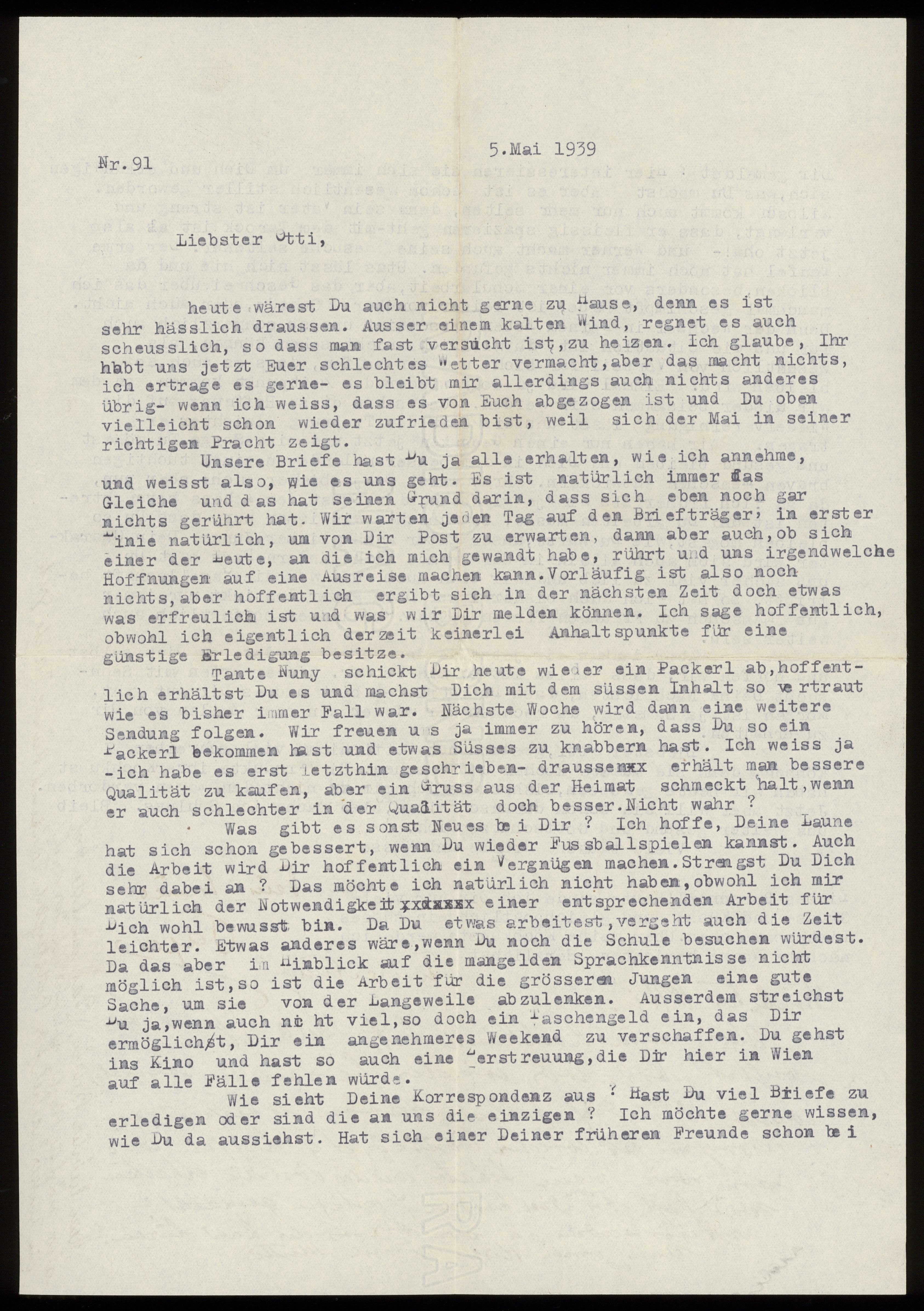 Maskinskrivet brev till Otto Ullman från föräldrarna Josef och Elise Ullmann, moster Grete Kollmann och moster Minna "Nuny" Kollmann daterat 5 maj 1939 Wien.