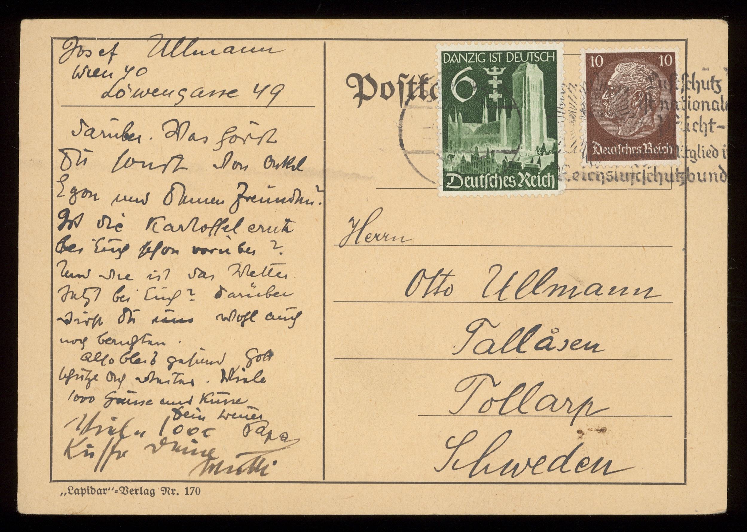 Brev till Otto Ullman från föräldrarna Josef och Elise Ullmann daterat 4 oktober 1939 Wien.