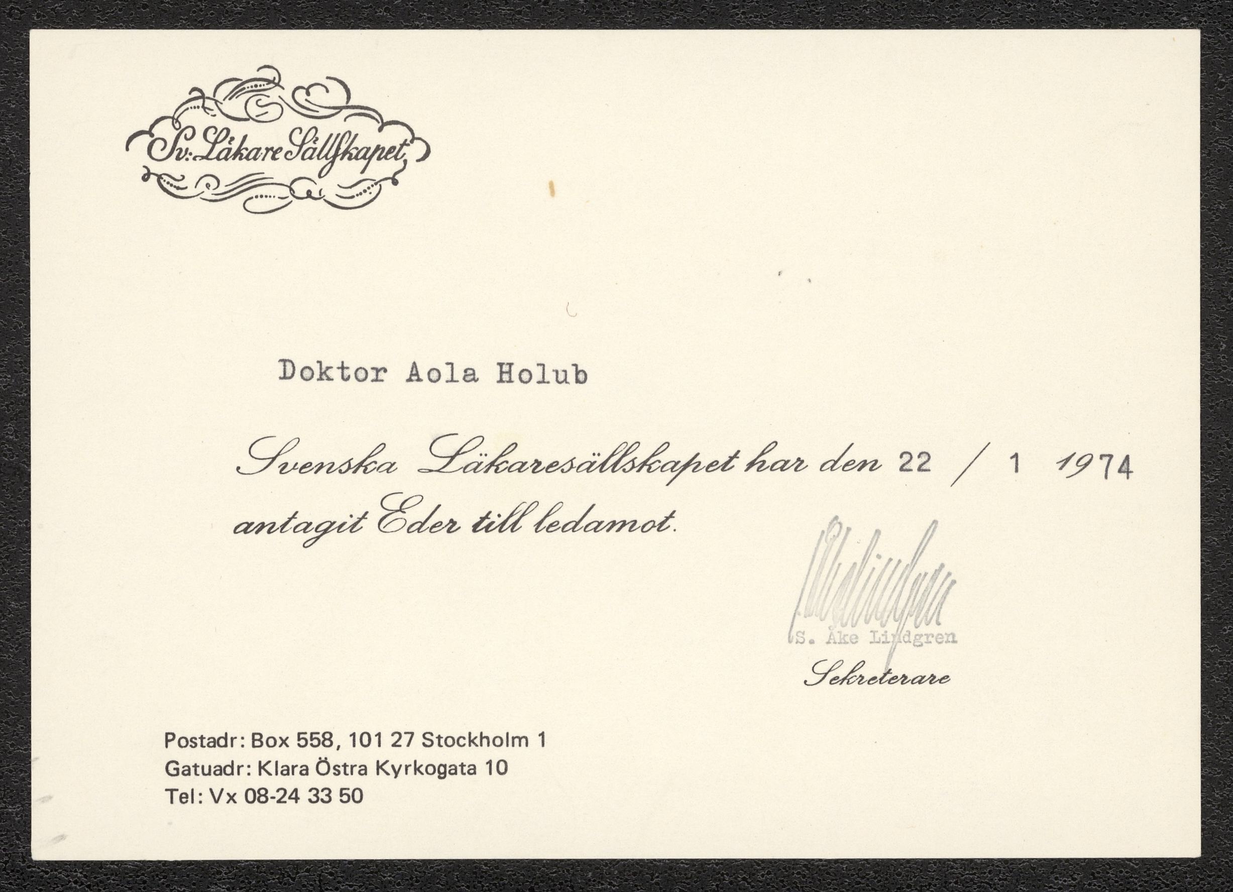 Ada Holubs medlemsbevis i Svenska läkaresällskapet, 1974.