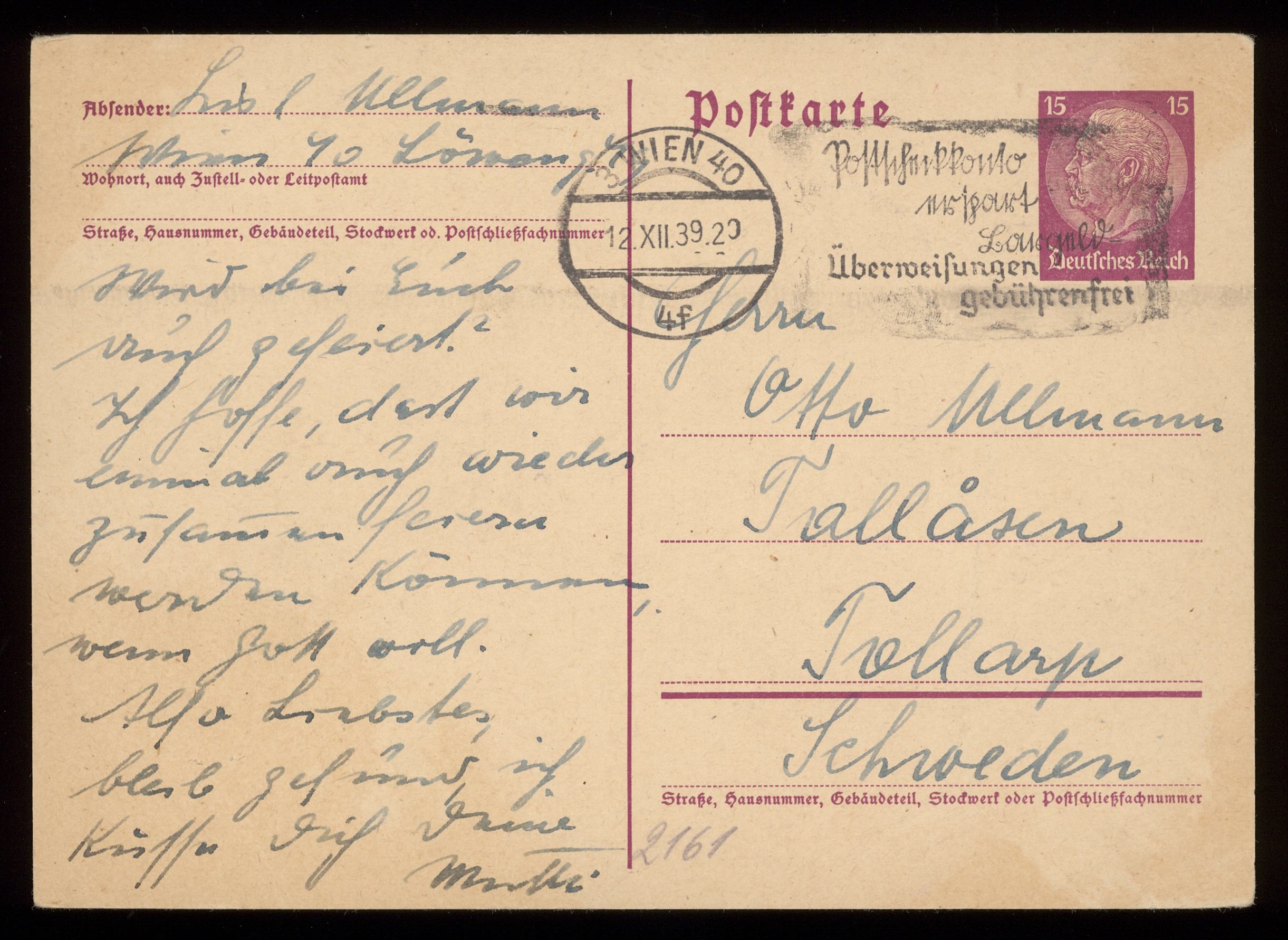 Brev från Elise och Josef Ullmann 1939-12-12