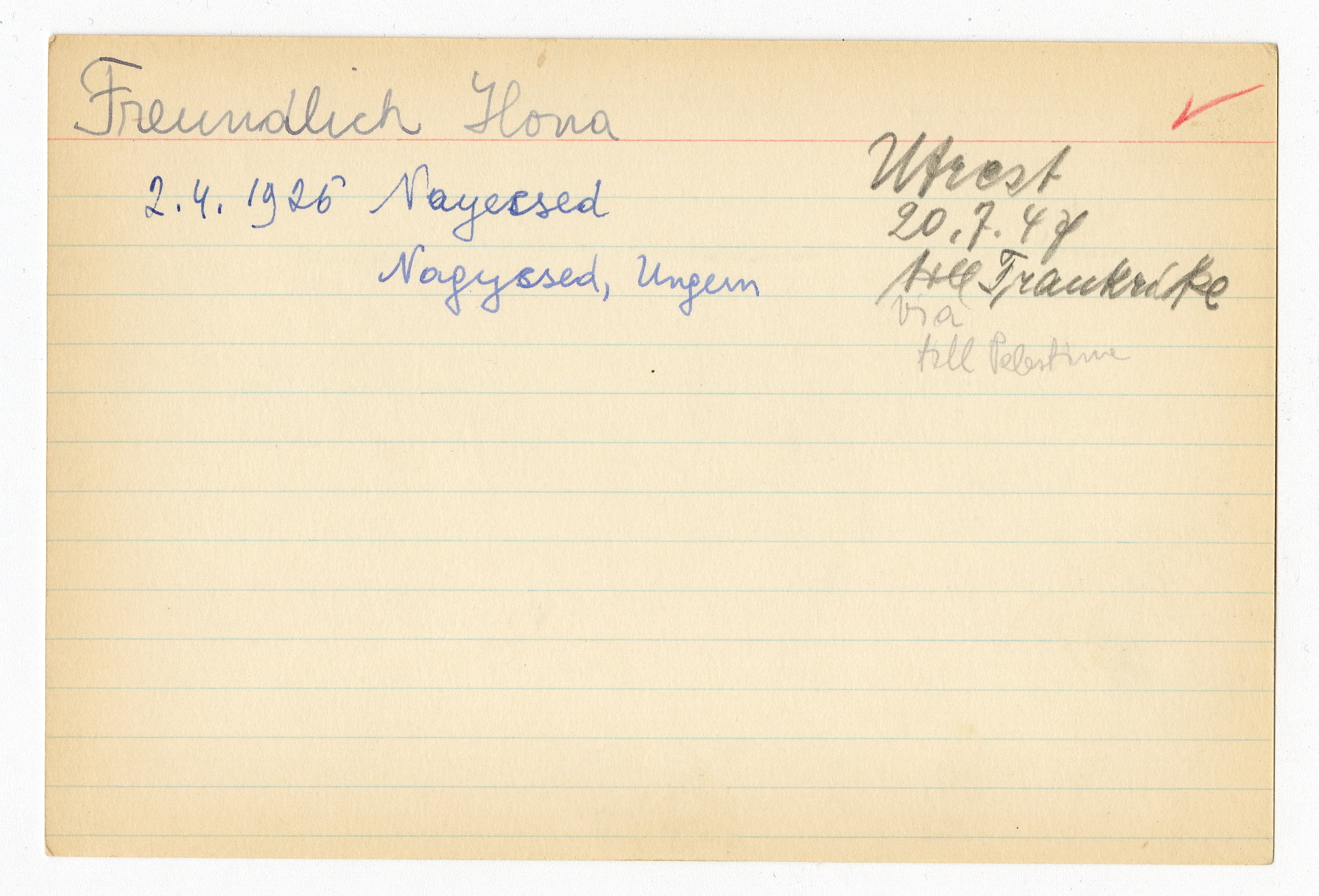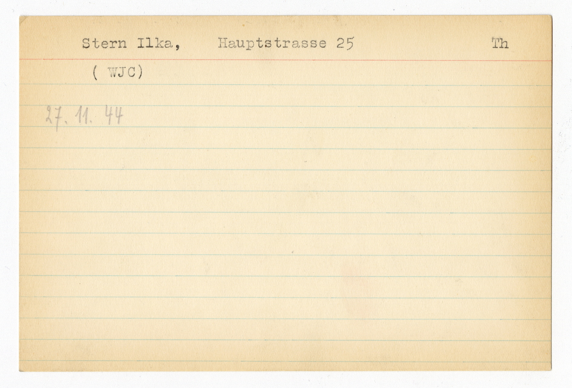 Ett skrivkort med patientuppgifter gällande Ilona Freundlich. På baksidan uppgifter om matpaket till Ilka Stern i Theresienstadt.