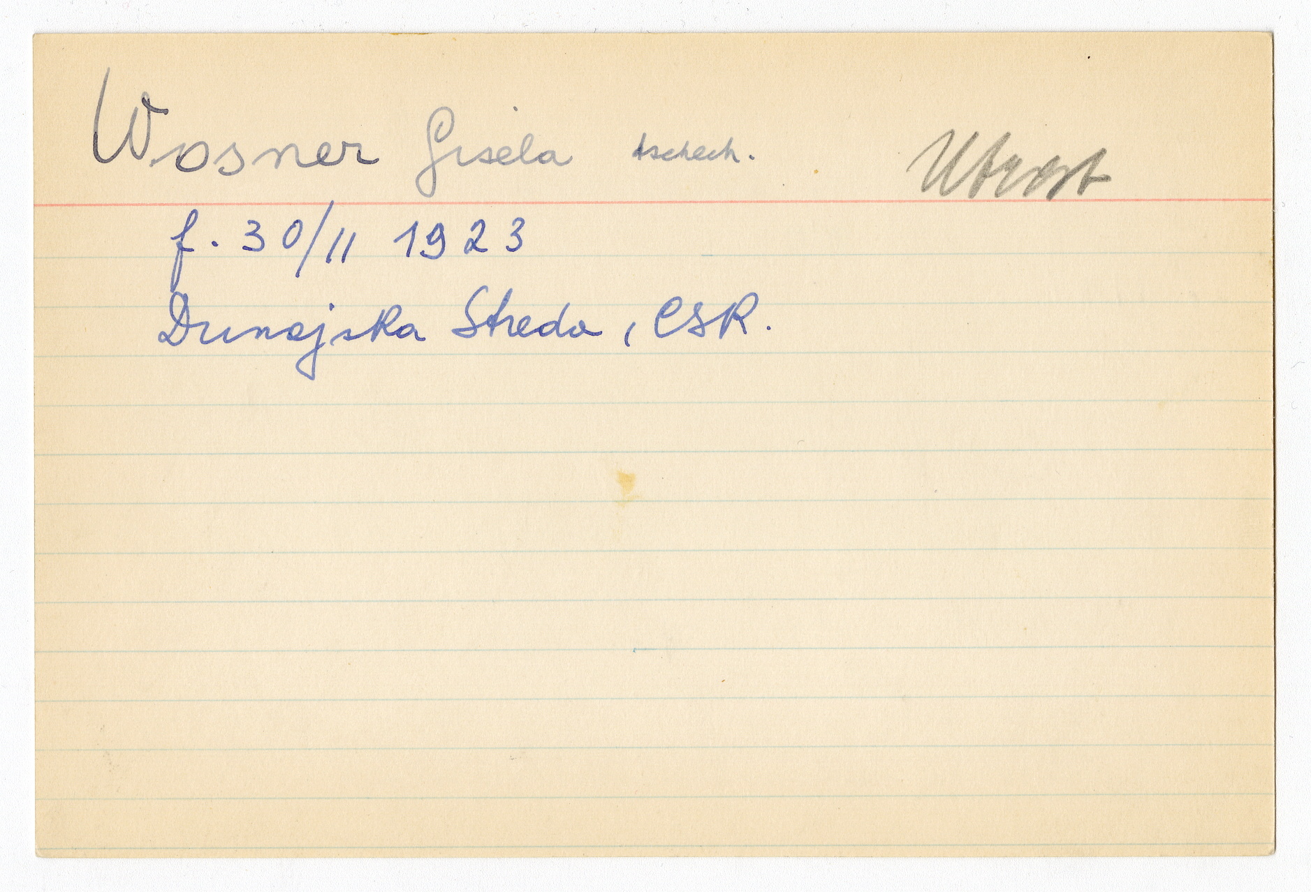 Ett skrivkort med patientuppgifter gällande Gisela Wosner. På baksidan uppgifter om matpaket till Clothilde Spiegel i Theresienstadt.