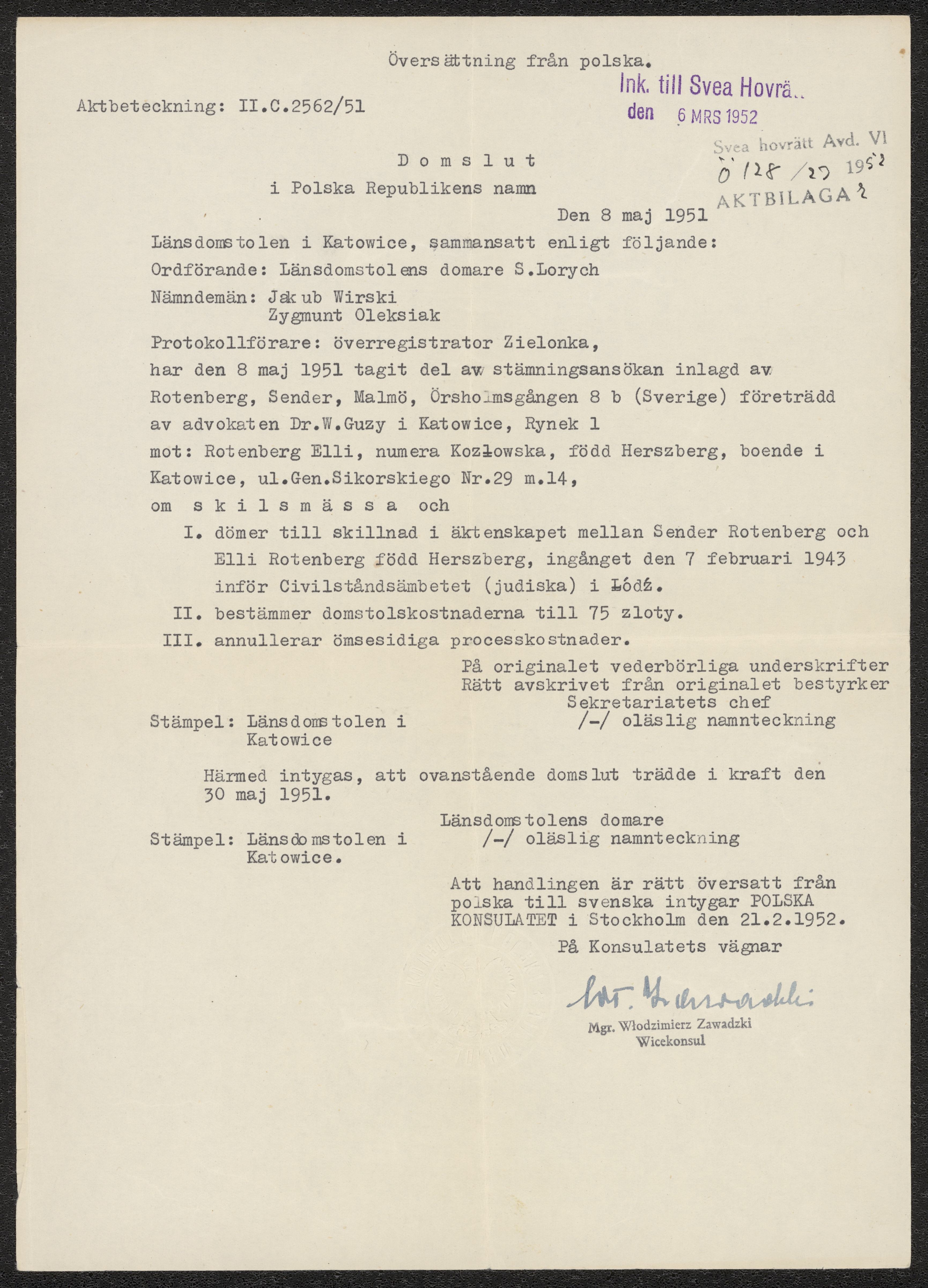 Översättning från polska till svenska för skilsmässa mellan Sender och Elli Rotenberg