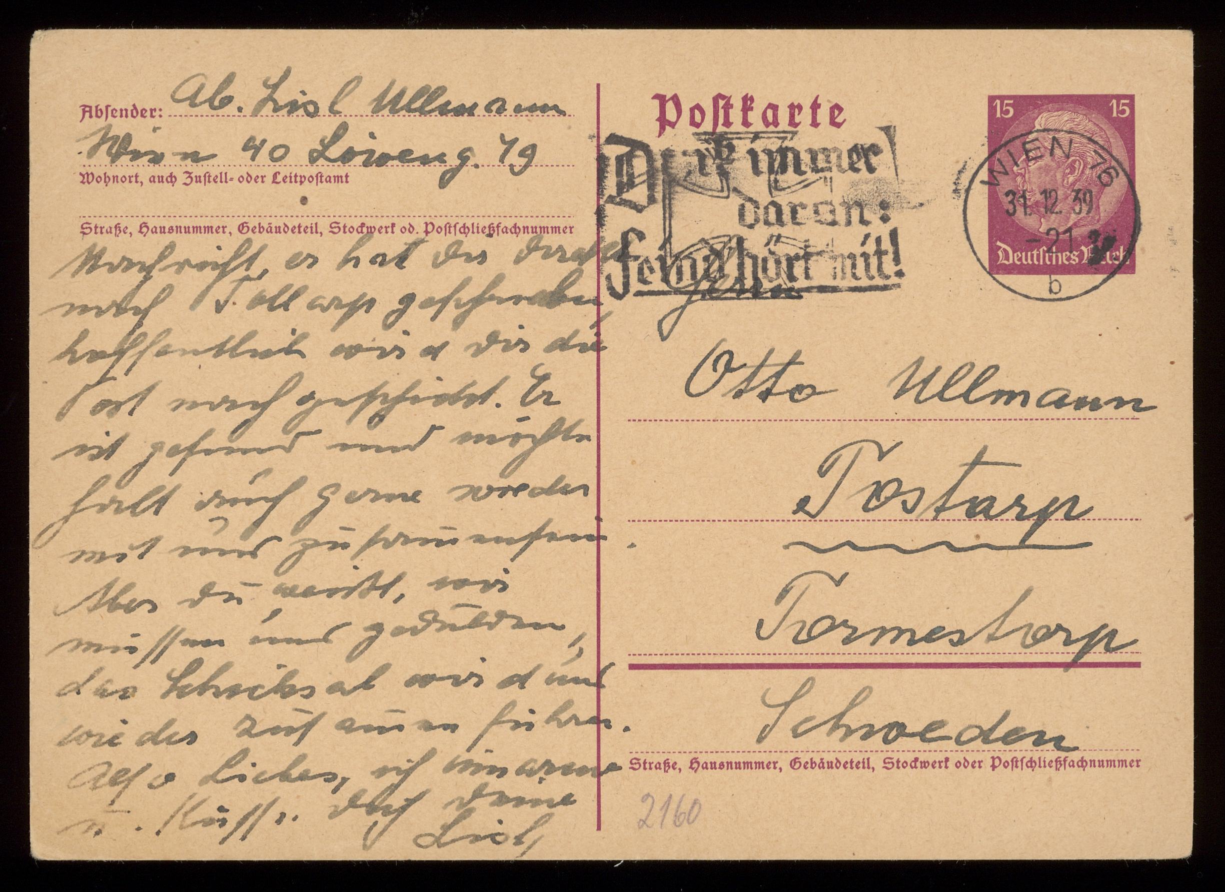 Brev till Otto Ullman från föräldrarna Josef och Elise Ullmann daterat 31 december 1939 Wien.