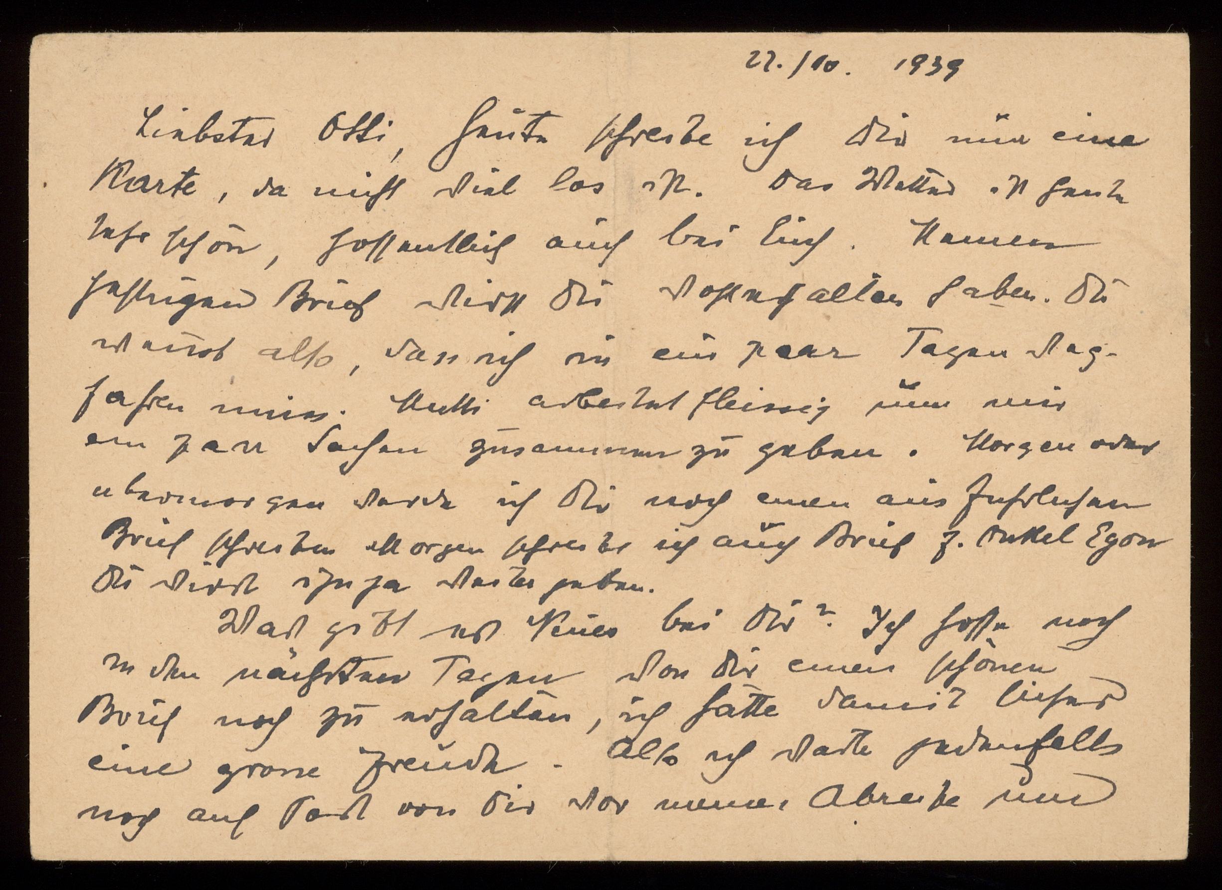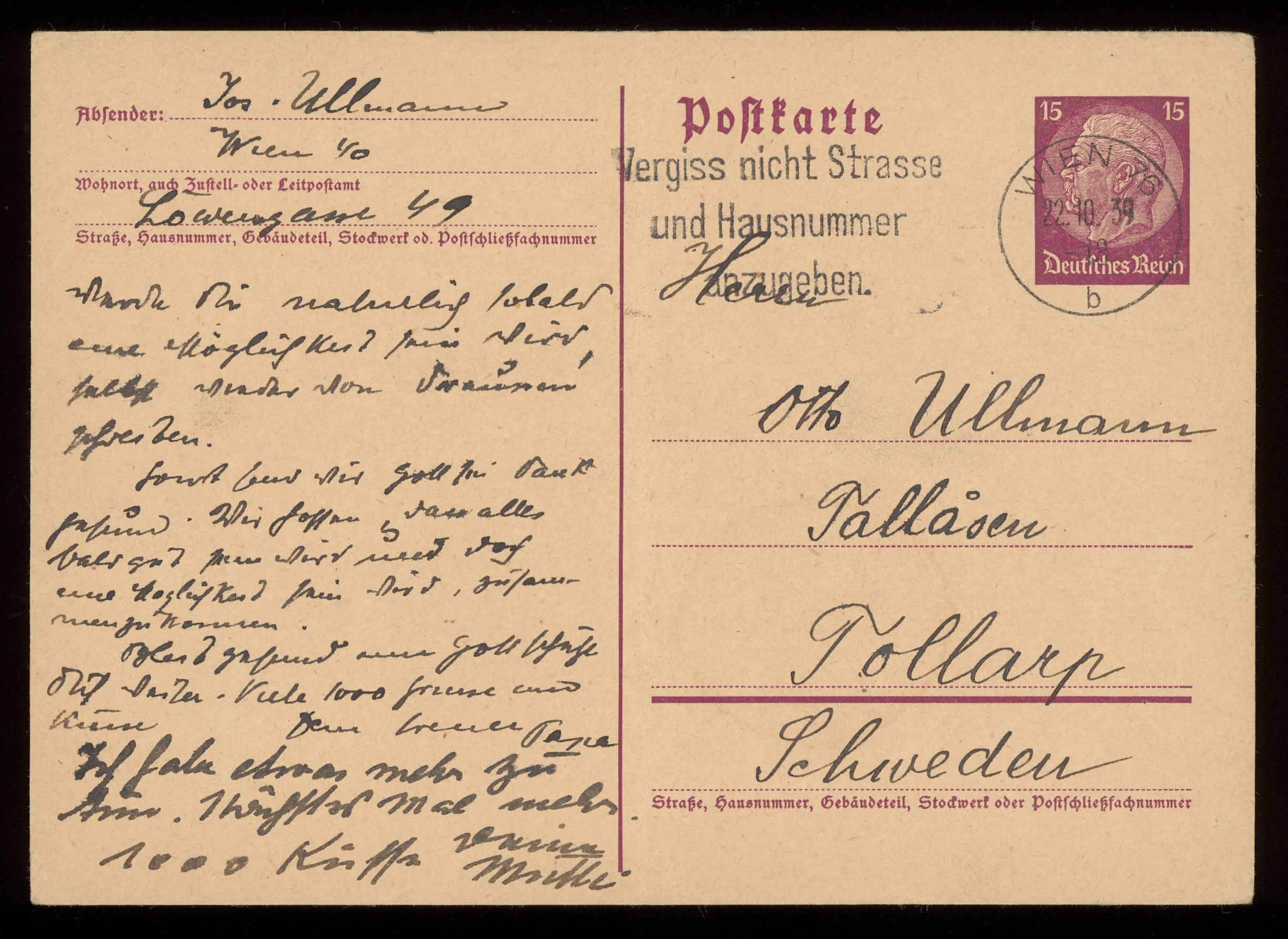 Brev till Otto Ullman från föräldrarna Josef och Elise Ullmann daterat 22 oktober 1939 Wien.