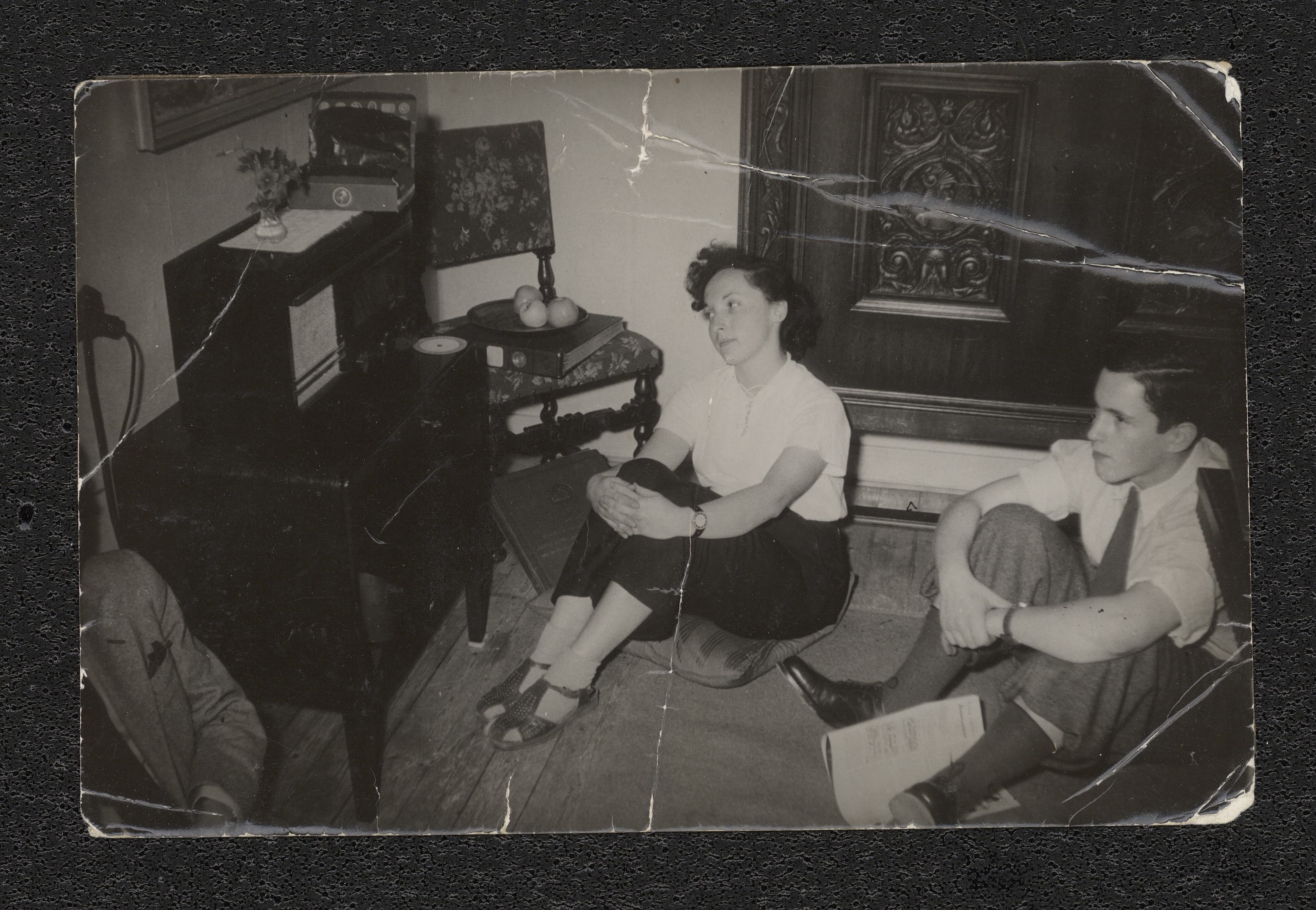Georg Witt sitter på golvet tillsammans med en kvinna. De förefaller lyssna på radio.