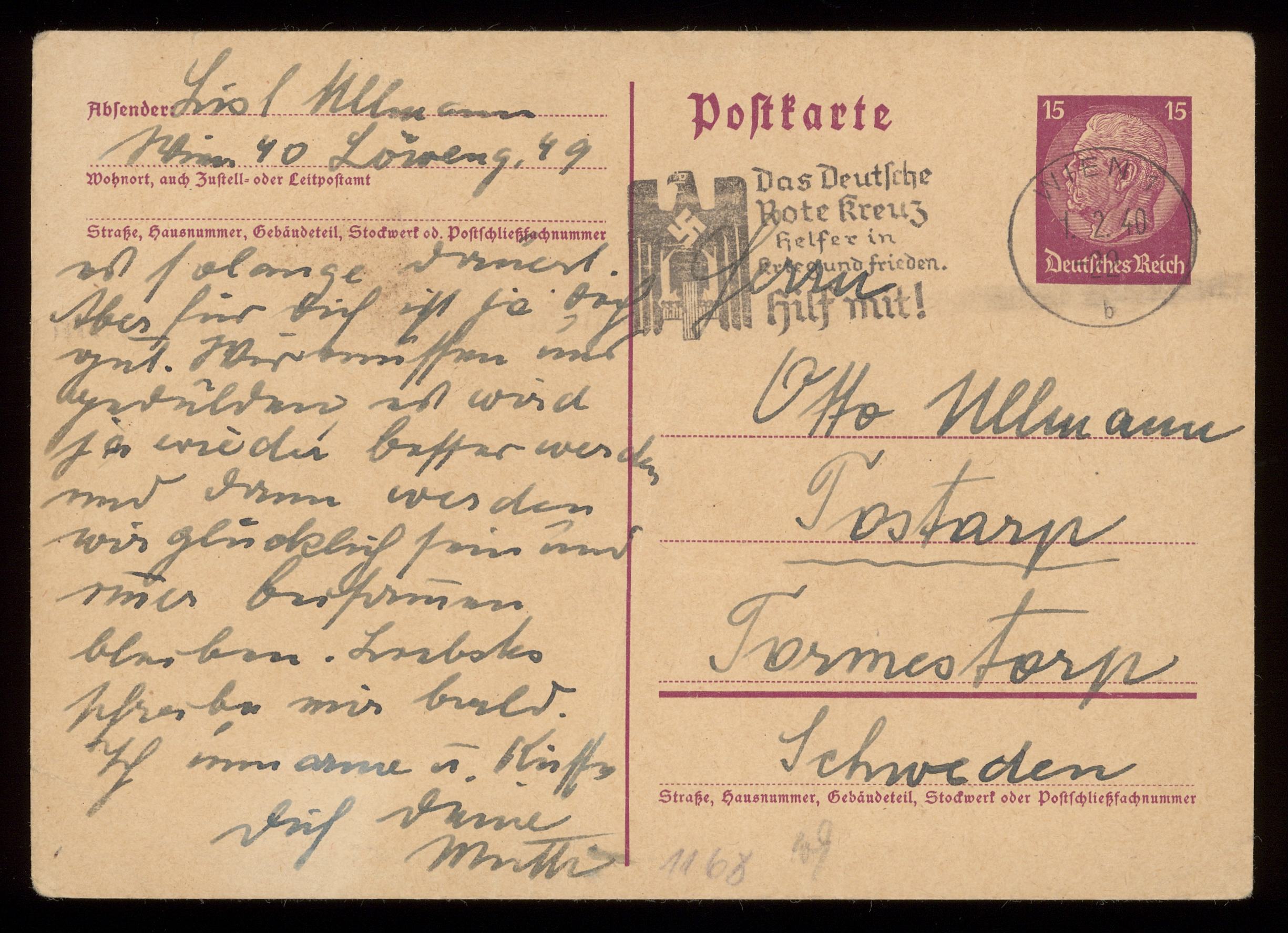 Brev till Otto Ullman från föräldrarna Josef och Elise Ullmann daterat 1 februari 1940 Wien.