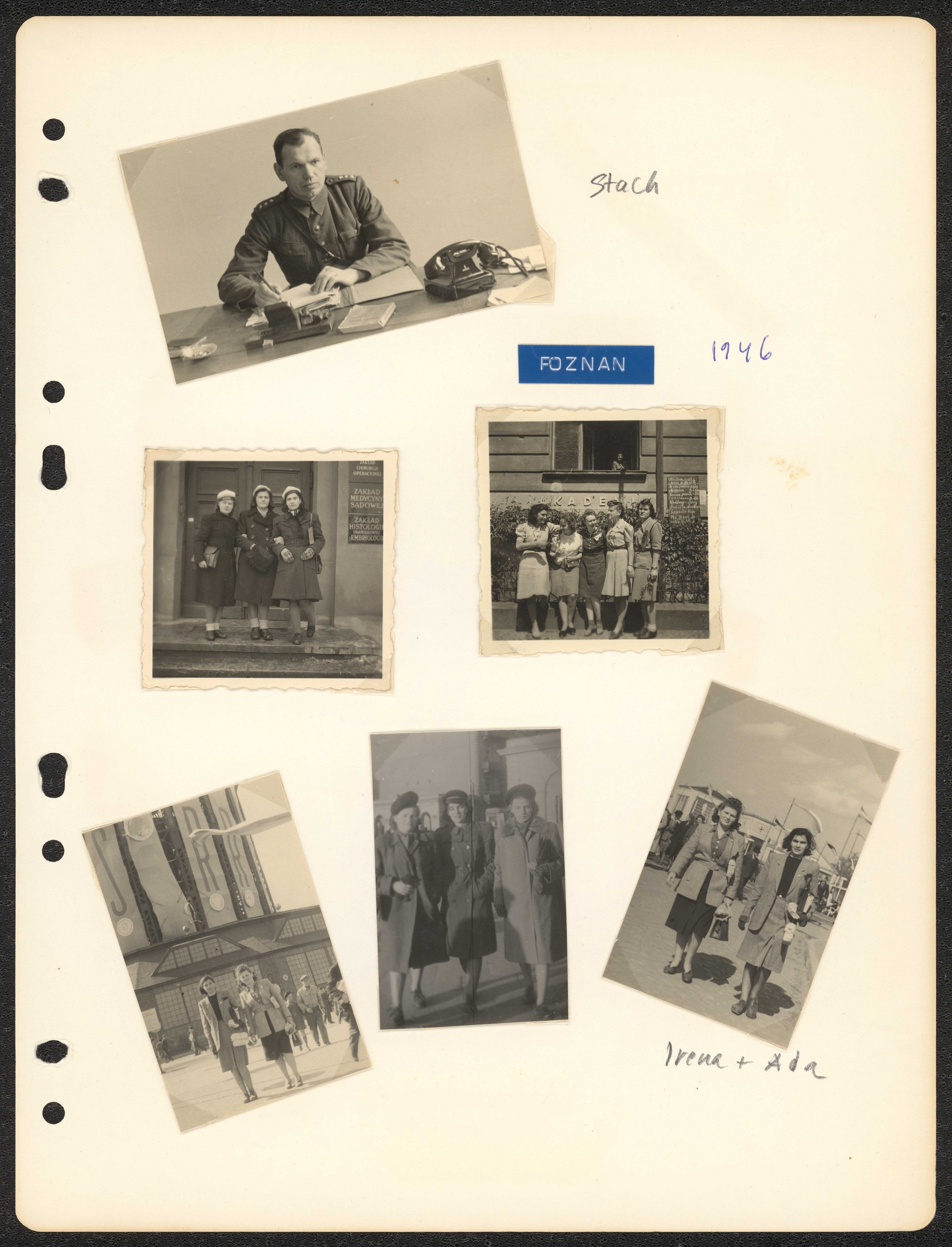 Albumsida från Ada Beckers fotopärm. På albumsidans framsida sitter sex fotografier från Ada Beckers tid i Poznan efter kriget. På baksidan tre fotografier.